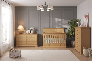 The Kieran Nursery Collection blends both classic and contemporary nursery styles, featuring a bold herringbone pattern, clean angular lines, and tapered legs. This stylish nursery furniture collection is available in 2-, 3-, and 4-piece nursery sets and comes in two modern finishes: Toasted Chestnut and Crescent Gray.