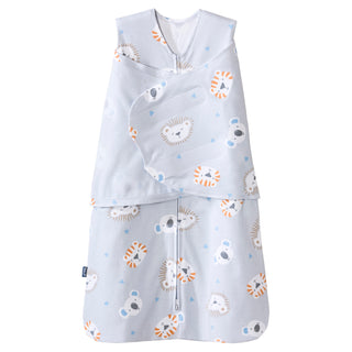 The HALO Swaddle 100% Cotton TOG 1.5 in light blue features a zipper, adjustable wings for healthy hip development, and an overlapping swaddle printed with cute orange, blue, and white lion and bear faces.