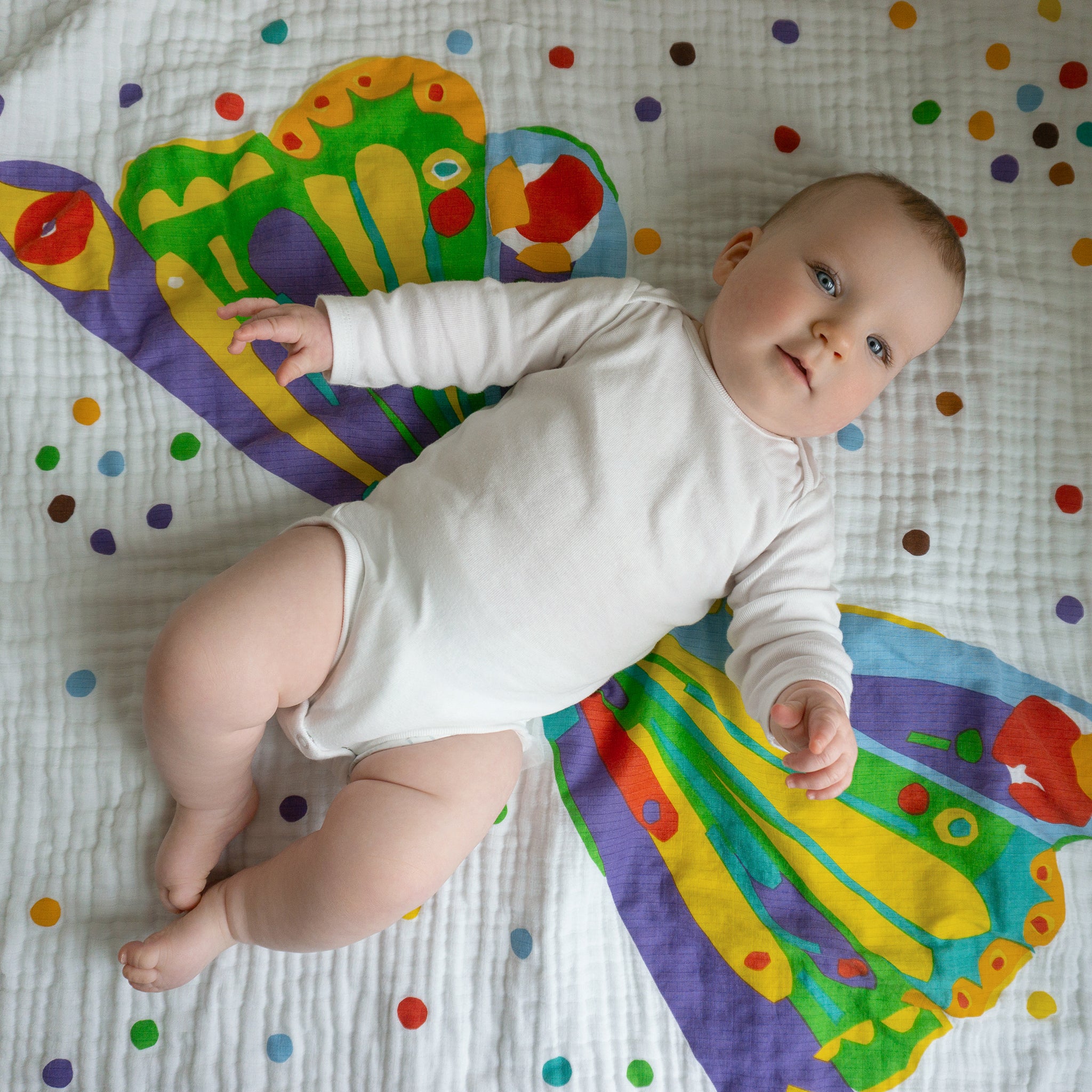 The aden + anais essentials cotton muslin dream blanket is a soft, quilted baby blanket featuring colorful patterns like polka dots, animal faces, and a green side with turtle illustrations.