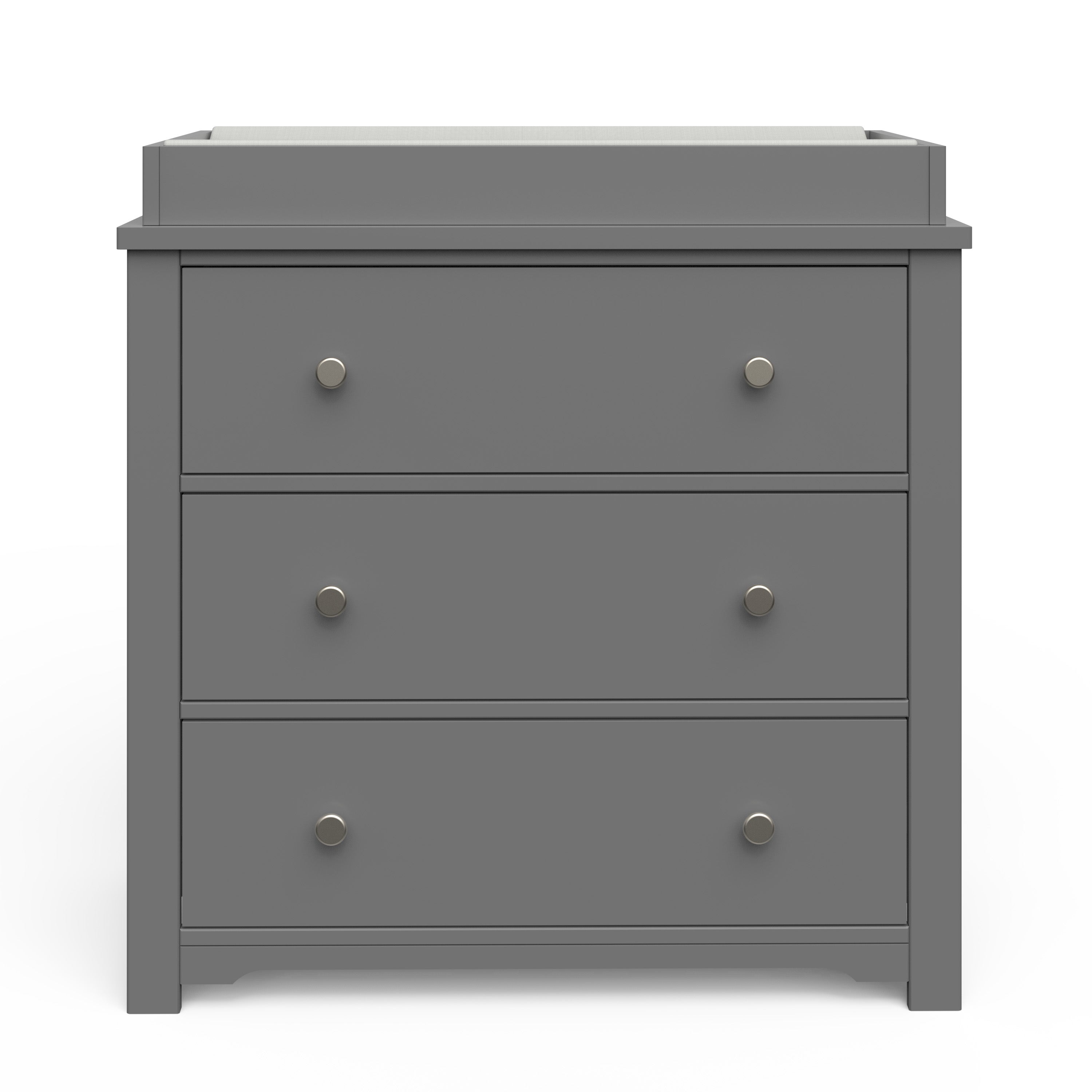 Bring classic style and convenient storage to your little one's nursery with the Harmony 3-Drawer Kids Dresser with a removable baby changing table topper. Three spacious drawers provide plenty of storage and the removable changing tray is a safe and convenient space for diapering and dressing needs. The simple style ensures this versatile dresser will provide years of lasting value. 3 large drawers provide plenty of storage Nickel-tone drawer knobs adds a classic touch Includes removable changing table topper Made of MDF with Birch Veneer Includes anti-tip kit Non-toxic Finishes: Matte White, Cool Gray, Dapper Gray, Dusty Heather, Brushed Cotton, Brushed Pebble, Brushed Truffle Metal ball-bearing drawer glides for smooth open and close The dressers in Matte White, Dusty Heather and Dapper Gray are designed with interlocking drawers Easy Assembly