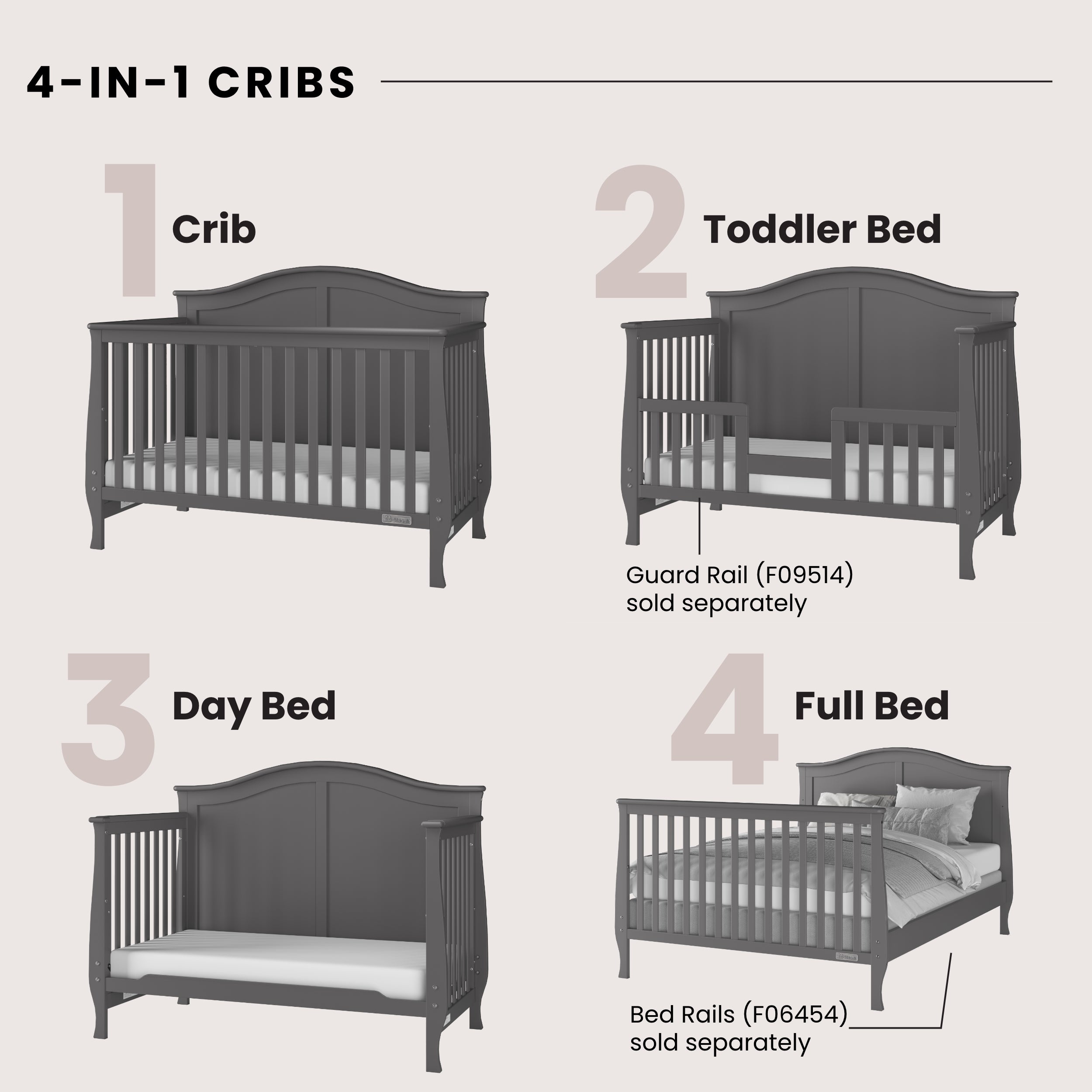 This set includes: Camden 4-in-1 Convertible Crib and Harmony 3-Drawer Dresser with Changing Table Topper Crib converts from a crib, to a toddler bed, day bed, and a full size bed for years of lasting value Toddler guard rail (F09514) and full size bed rails (F06454) sold separately Furniture is constructed from durable pine wood and MDF with veneers Camden Crib design features elegant softly arched top with flared legs and detailed cap rails