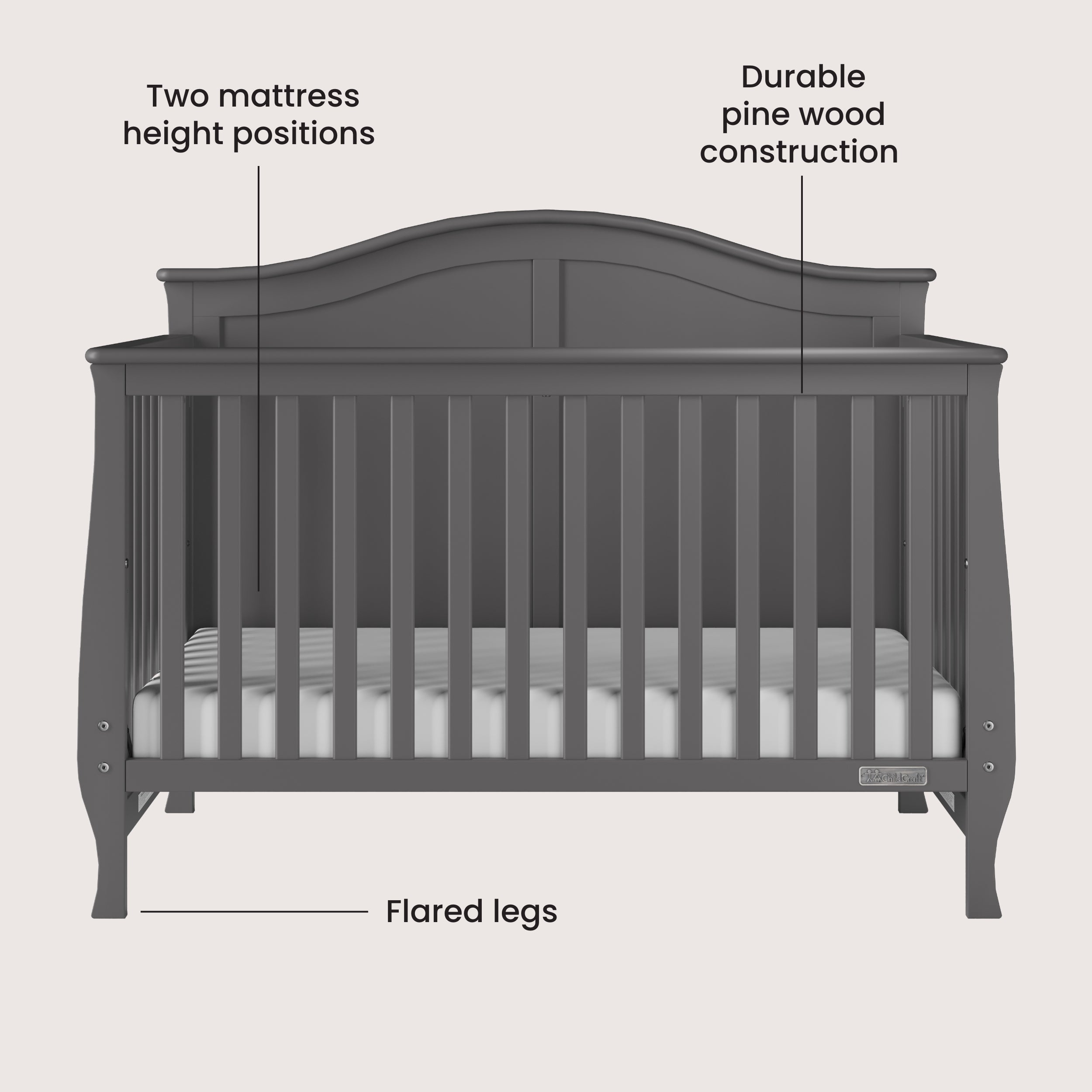 A timeless design with a soft, arched top, detailed cap rails and flared legs. The Child Craft Camden 4-in-1 Convertible Crib is a simple, yet stunning and enduring style that will complement any décor and grow with your child. Pair the Child Craft Camden Crib with Universal Select nursery furnishings to complete the look. Camden crib easily converts to a toddler bed, day bed, and a full bed Coordinating toddler guard rail (F09514) and full bed rails (F06454) sold separately Made of pine Metal crib mattress support adjusts to 2 heights Fits most standard crib mattresses (sold separately) Available in 4 non-toxic, baby-safe finishes Easy assembly