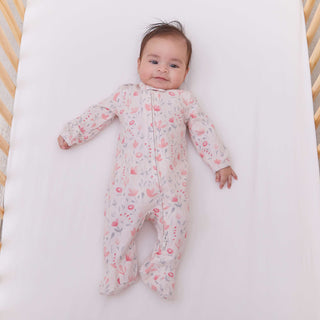 A baby in a floral comfort knit™ footie by aden + anais, made from cotton-rich fabric, lies on a white crib mattress. The infant has dark hair and smiles gently with arms at their sides. The crib is crafted with light wooden bars.