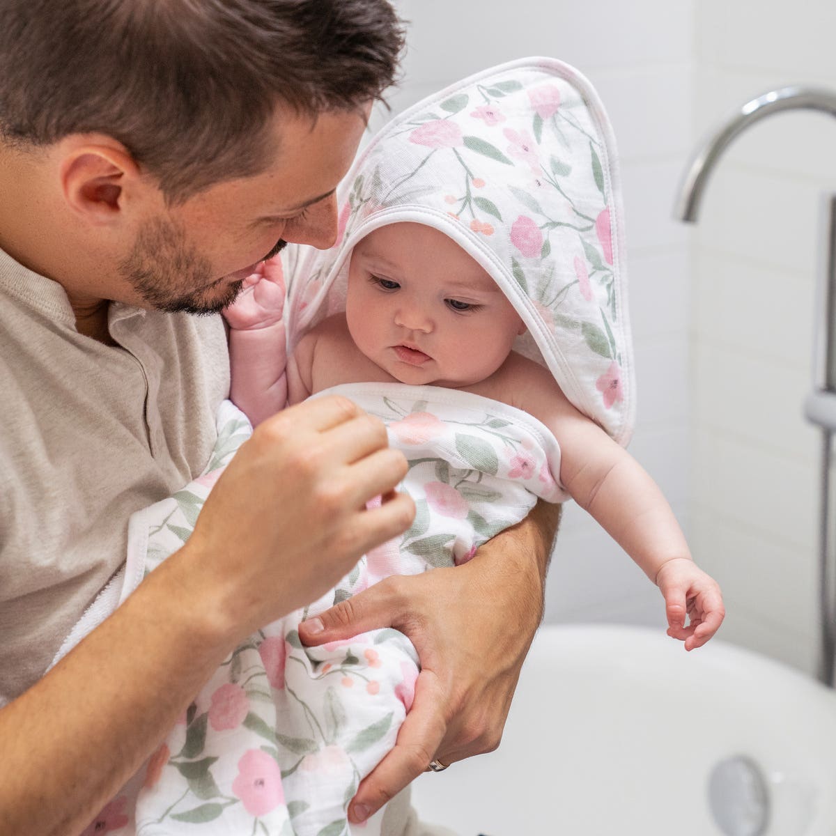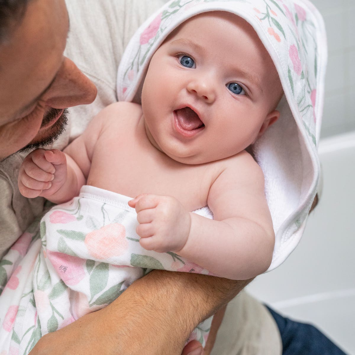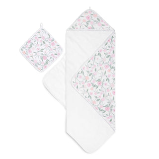 The aden + anais boutique set includes an oversized 100% cotton muslin-backed hooded towel and washcloth, adorned with a floral pattern in soft pink, peach, and green. Both pieces have convenient hanging loops.