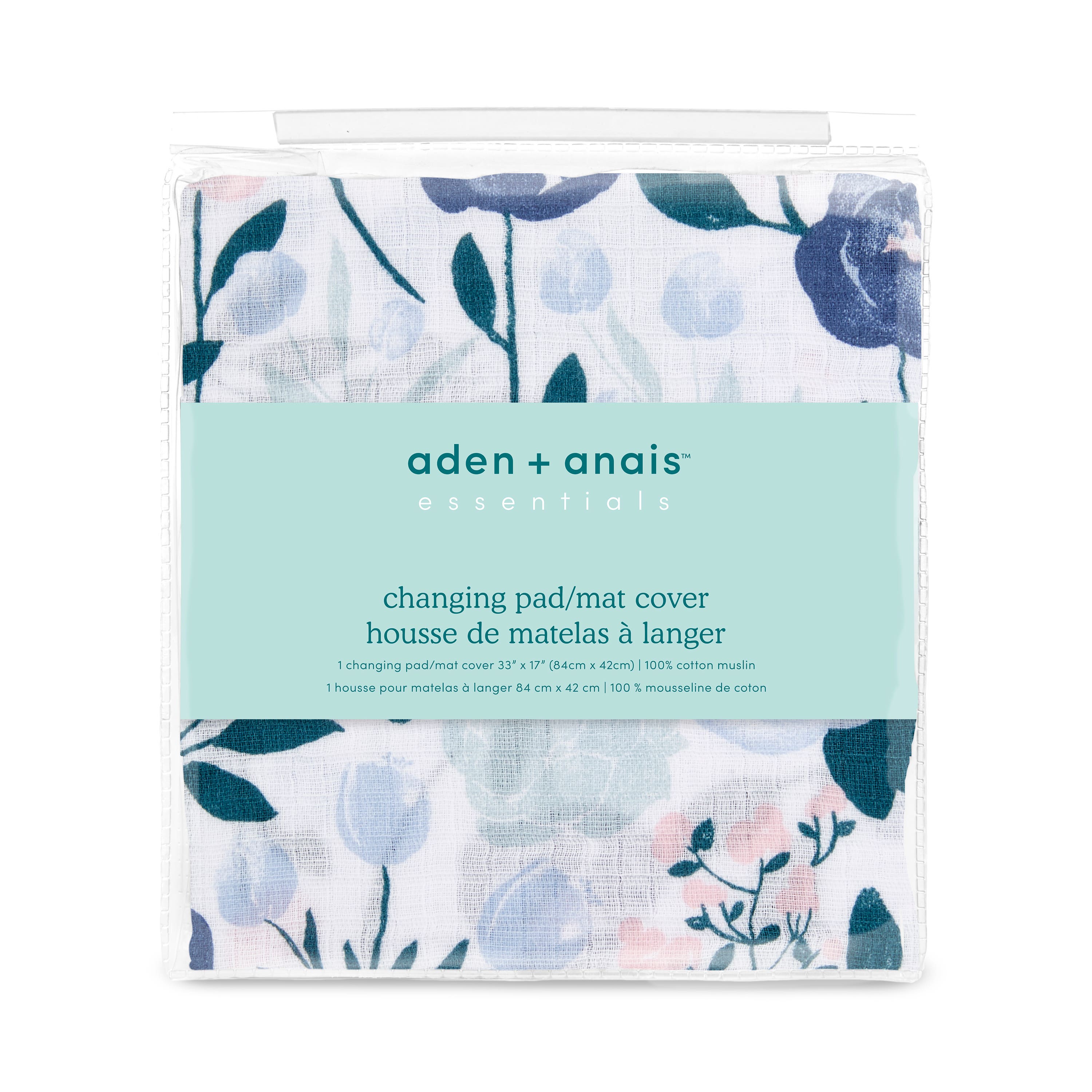The aden + anais essentials cotton muslin changing pad cover features a floral design with blue, teal flowers and green leaves on a white background, showcasing its charm.