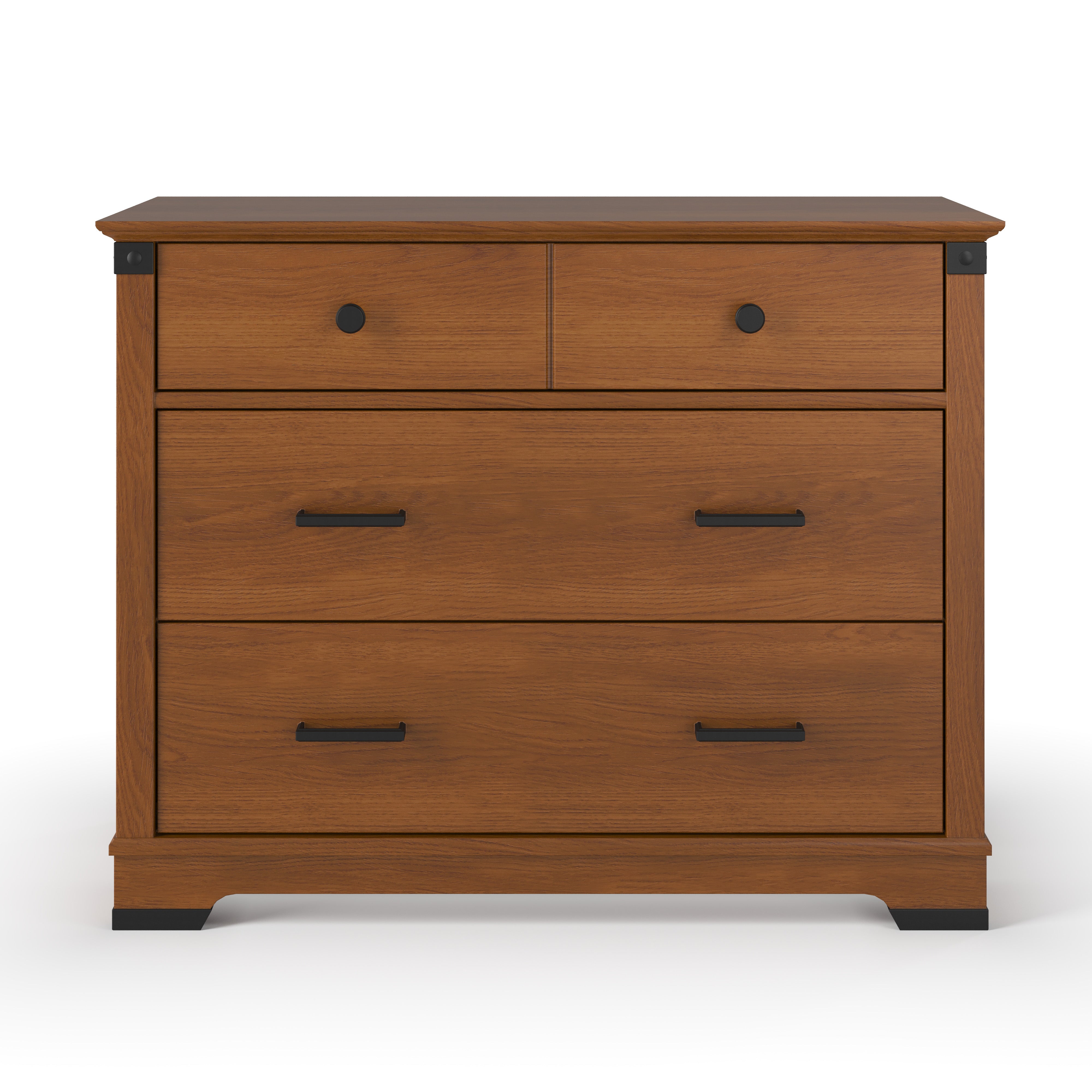 The bold details on the Child Craft Redmond 4 Drawer Chest make this rustic piece a classic in a nursery or adult bedroom. The clean lines and modern details pair well with the craftsman-inspired textured black metal hardware. The four spacious drawers provide generous storage space and the easy glide metal drawer runners provides smooth open and close. Available in Coach Cherry and Dapper Gray non-toxic finishes, the Redmond Chest pairs with the rest of the Redmond Collection to complete your room. 4 Drawers provide generous storage space Textured black metal drawer pulls and accents Crafted of pine, MDF with veneer, and plywood Anti-tip kit securely fastens chest to wall to prevent tipping Non-toxic, baby-safe finishes Easy assembly