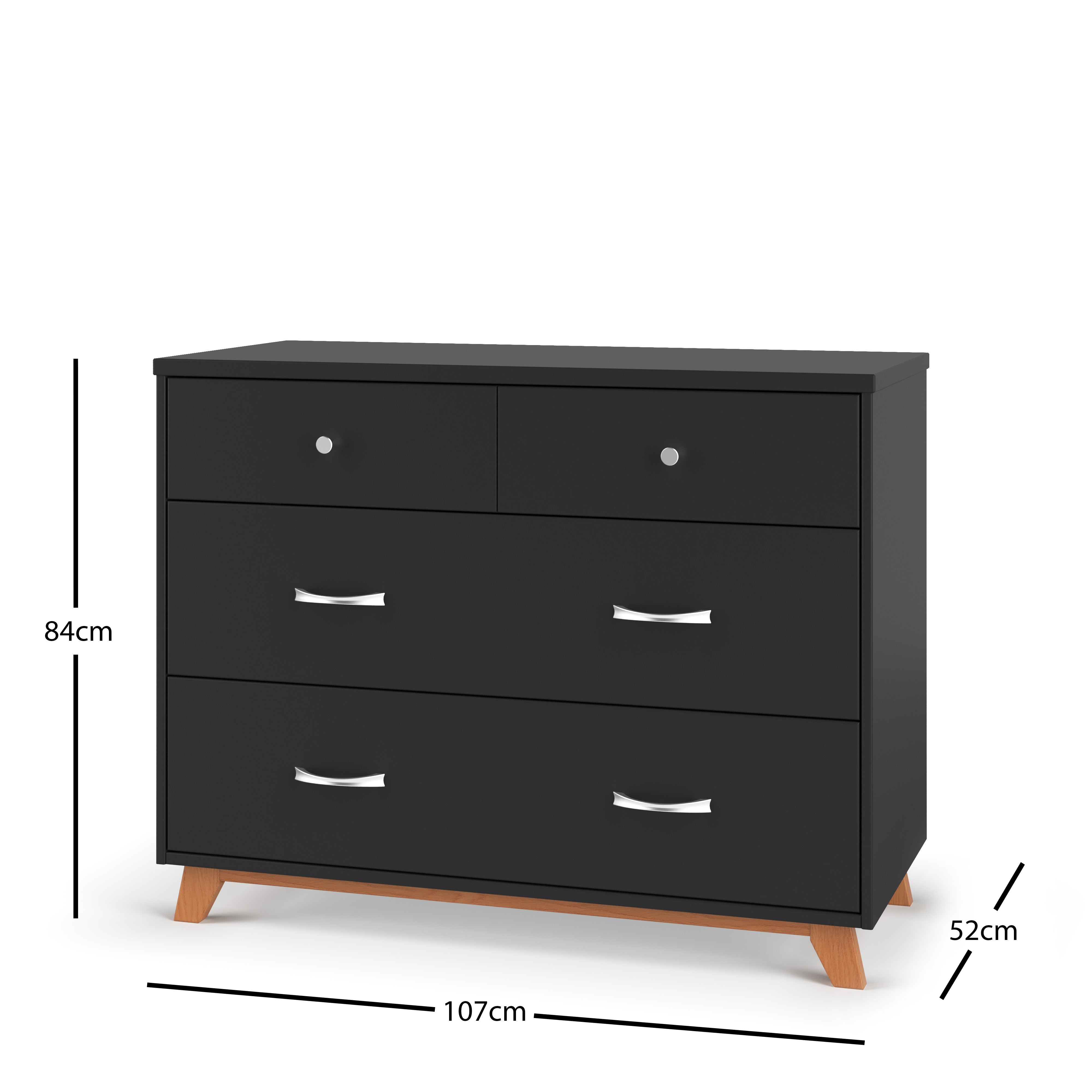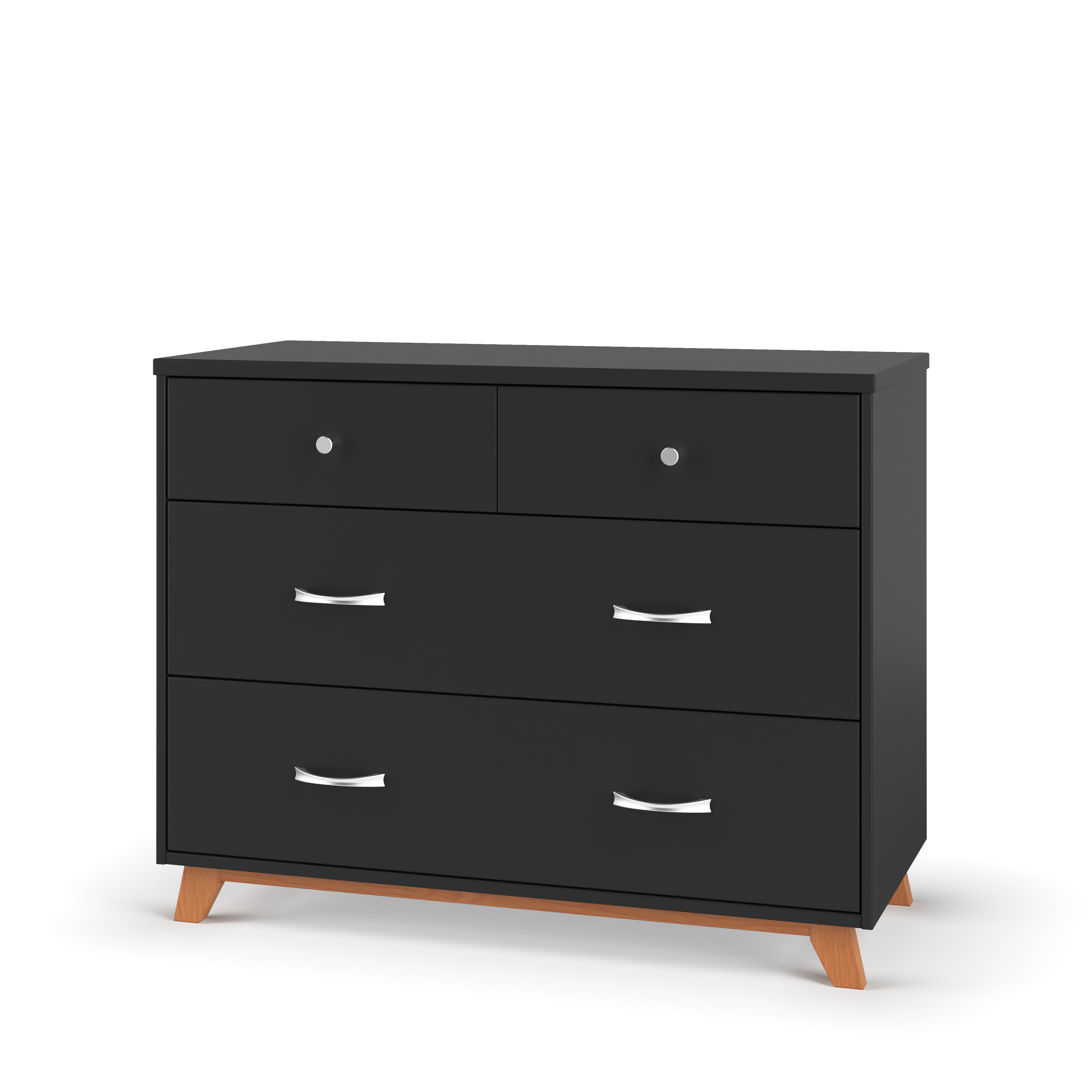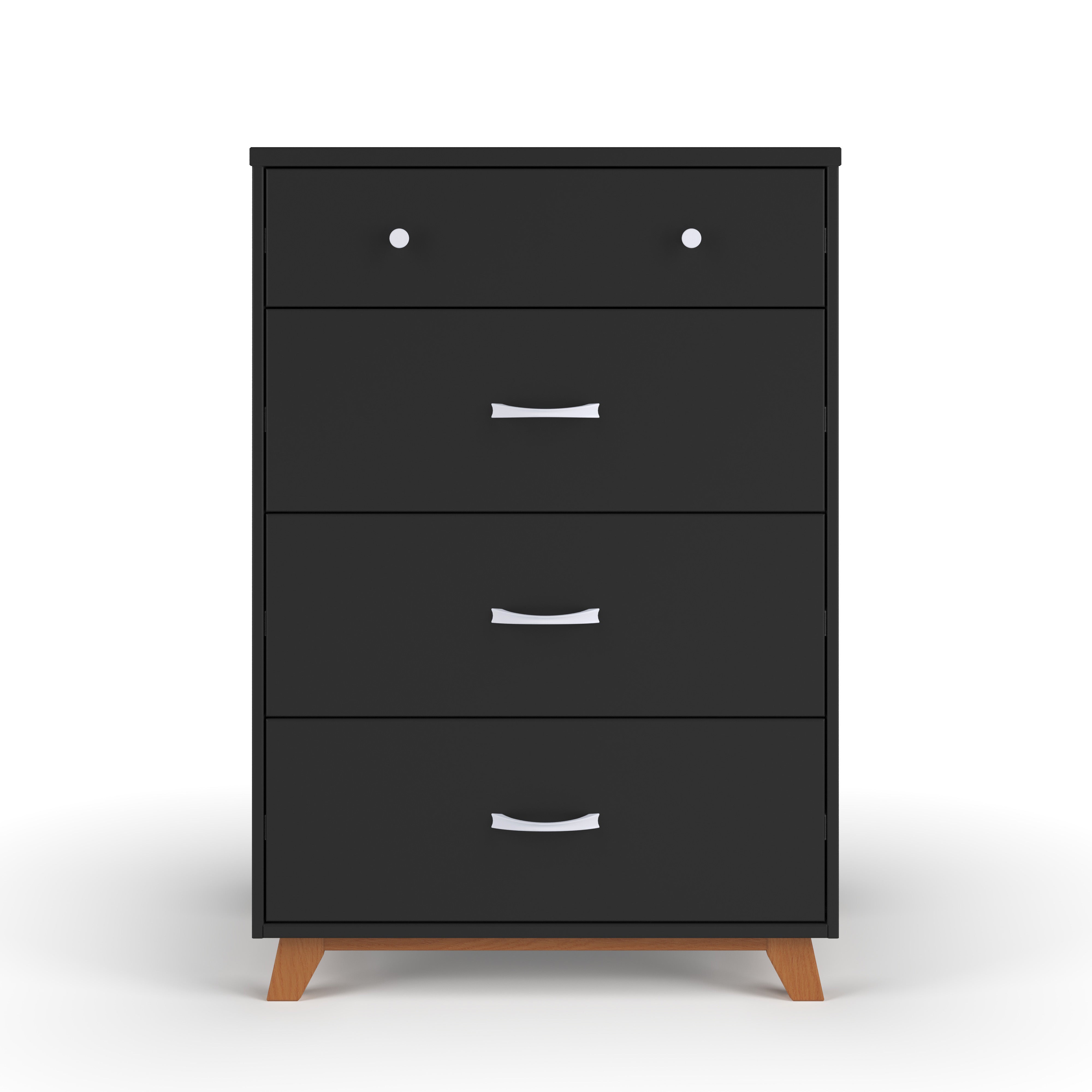 Bring a touch of mid-century modern styling to your baby's nursery with the Soho 4 Drawer Chest. This nursery chest features a minimalist design with clean lines and canted legs. 3 sophisticated finishes highlight the chest's unique features. Pair with coordinating pieces from the Child Craft Soho nursery furniture collection to complete your child’s bedroom. Storage chest with four extra-large drawers featuring a clean and modern aesthetic Drawers feature a combination of conical knobs and contemporary metal drawer pulls Smooth ball bearing drawer glides Includes anti-tip kit to securely fasten nursery chest to wall and prevent tipping Constructed of Pine, MDF with veneer, and plywood drawer boxes Non-toxic, baby-safe finish Easy assembly