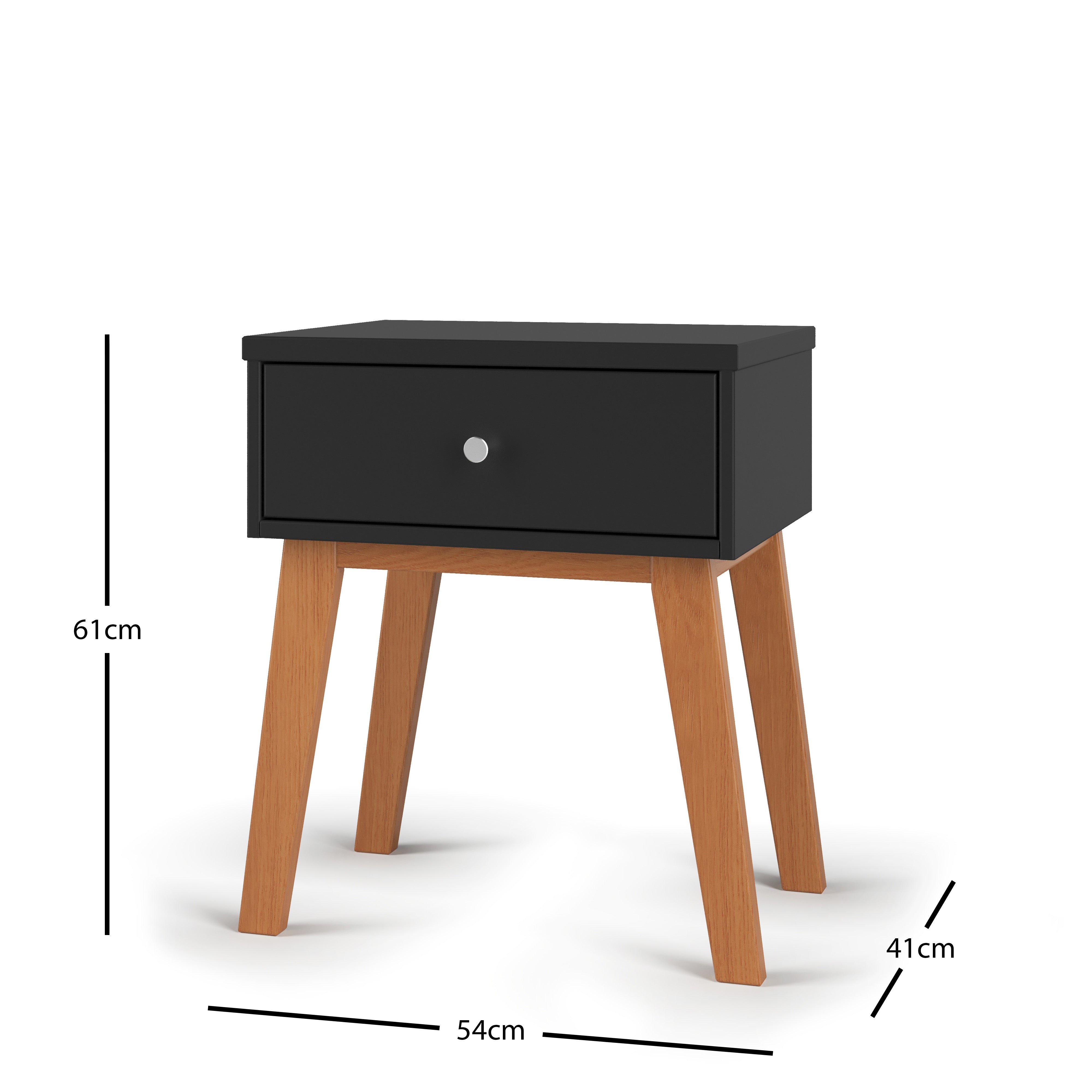 Bring a touch of mid-century modern styling to your kid's room with the Soho Nightstand. This kid's nightstand features a minimalist design with clean lines and canted legs. 3 sophisticated finishes highlight the nightstand's unique features. Pair with coordinating pieces from the Child Craft Soho nursery furniture collection to complete your child’s bedroom. Wood nightstand with one large drawer, featuring a clean and modern aesthetic Chic conical metal drawer knob Smooth ball bearing drawer glides Constructed of Pine, MDF with veneer, and plywood drawer boxes Non-toxic, baby-safe finish Easy assembly