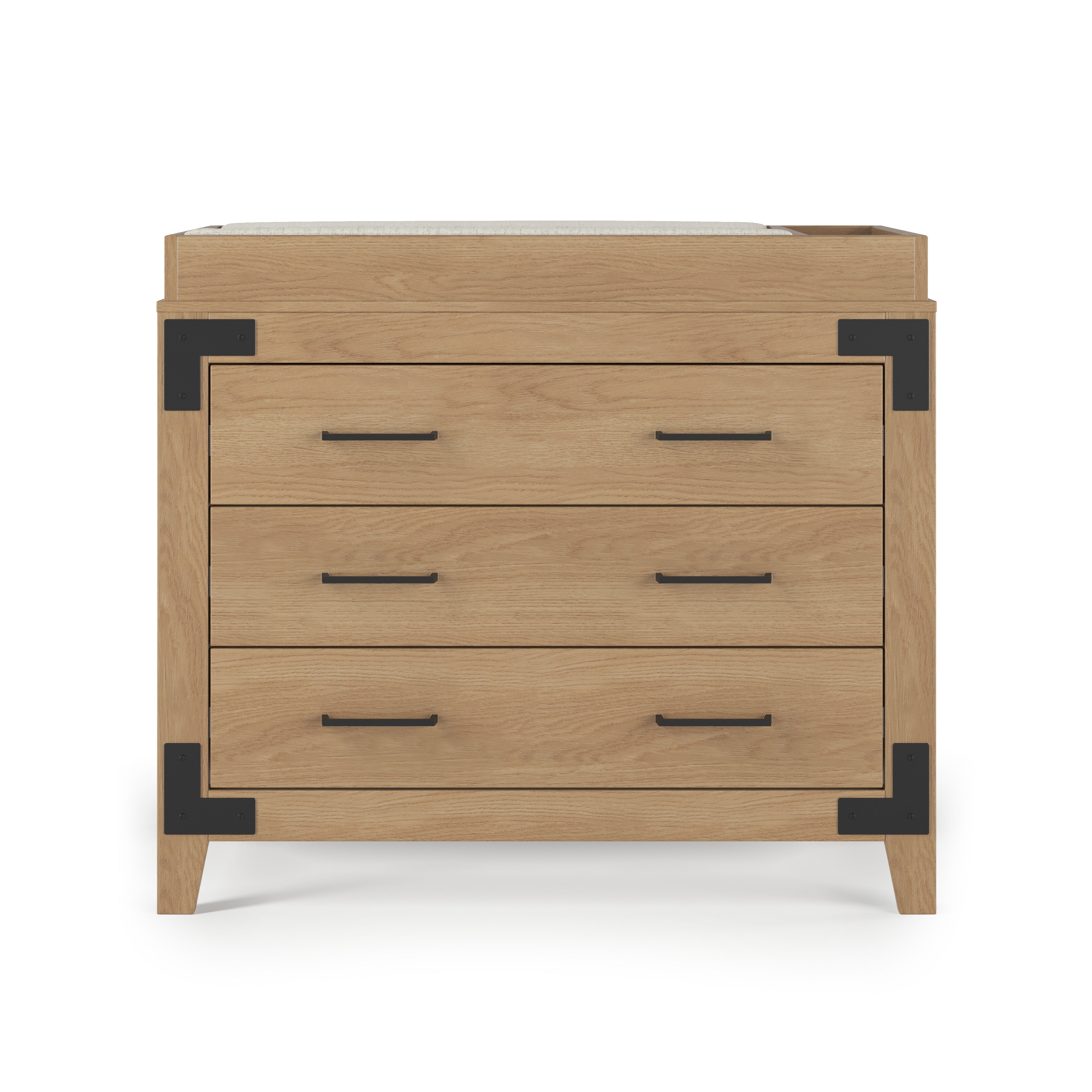 The Child Craft Lucas Dresser in Nutmeg, featuring three drawers with black handles, is set against an exposed brick wall. On top sit a round lamp, decorative bowl, small vase, and abstract artwork. A portion of a rug appears below.