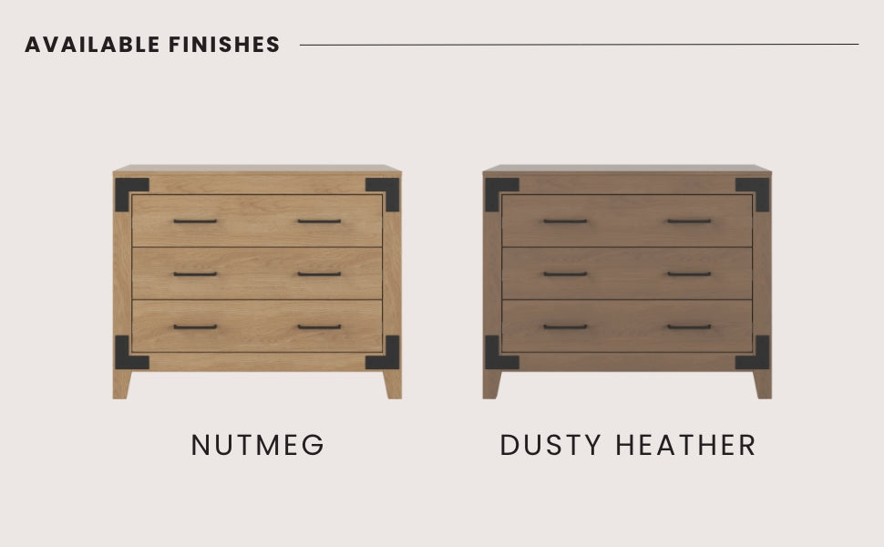 The Child Craft Lucas Dresser in Dusty Heather, with three drawers and black metal accents, stands against a brick wall. On top sit a white lamp, wicker basket, framed "breathe" print, and tray; toys are scattered nearby.