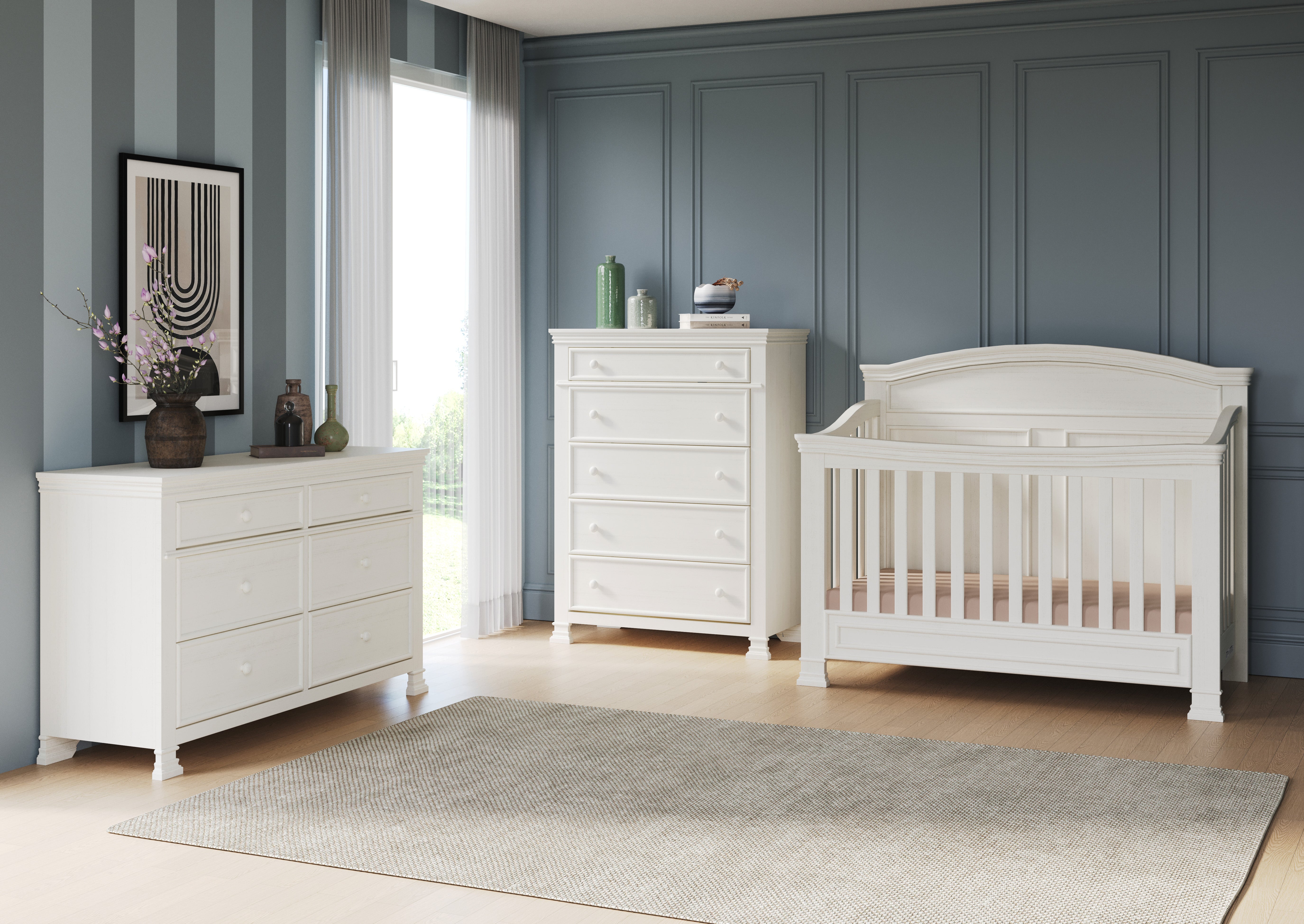 A modern nursery with gray furniture, including a crib, chest of drawers, and the Child Craft Westgate Double Dresser in Chelsea Gray. The room has white paneled walls, a beige rug, wooden floor, and minimalistic decor.