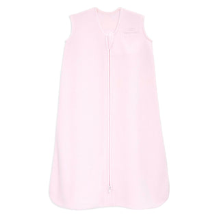 The HALO Wearable Blanket Micro-Fleece TOG 1.0 in light pink is sleeveless and serves as a safe sleep option with front zipper closure, soft fabric, and a small chest logo.