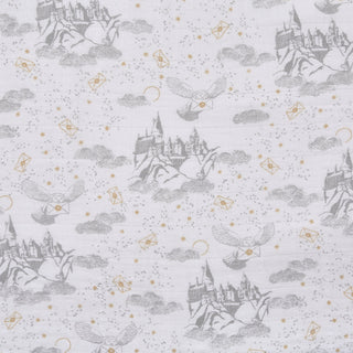 The aden + anais boutique iconic 100% cotton muslin swaddle blanket features rolled-up white fabric with subtle gray designs of castles, magical symbols, and flying creatures. Gold stars and crescent moons add whimsy, reminiscent of a Harry Potter™ adventure.