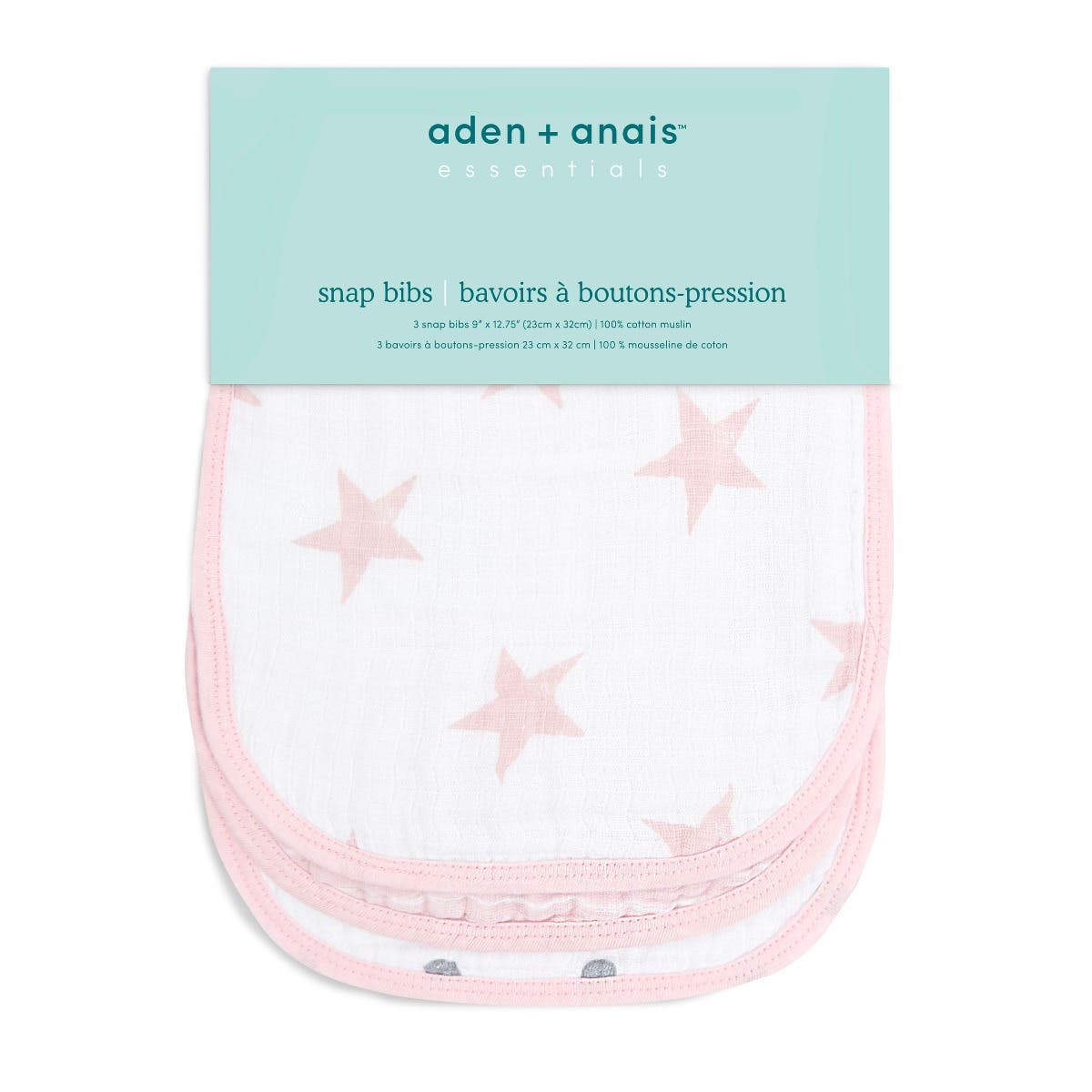 The aden + anais essentials cotton muslin snap bibs 3 pack includes a solid pink bib, a white one with pink stars, and another white featuring pink and gray polka dots.