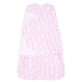 The HALO Swaddle 100% Organic Cotton TOG 1.5 is a light pink, sleeveless swaddle with crossover panels, a bottom zipper, and HALO branding—offering adjustable comfort and convenience for your baby.
