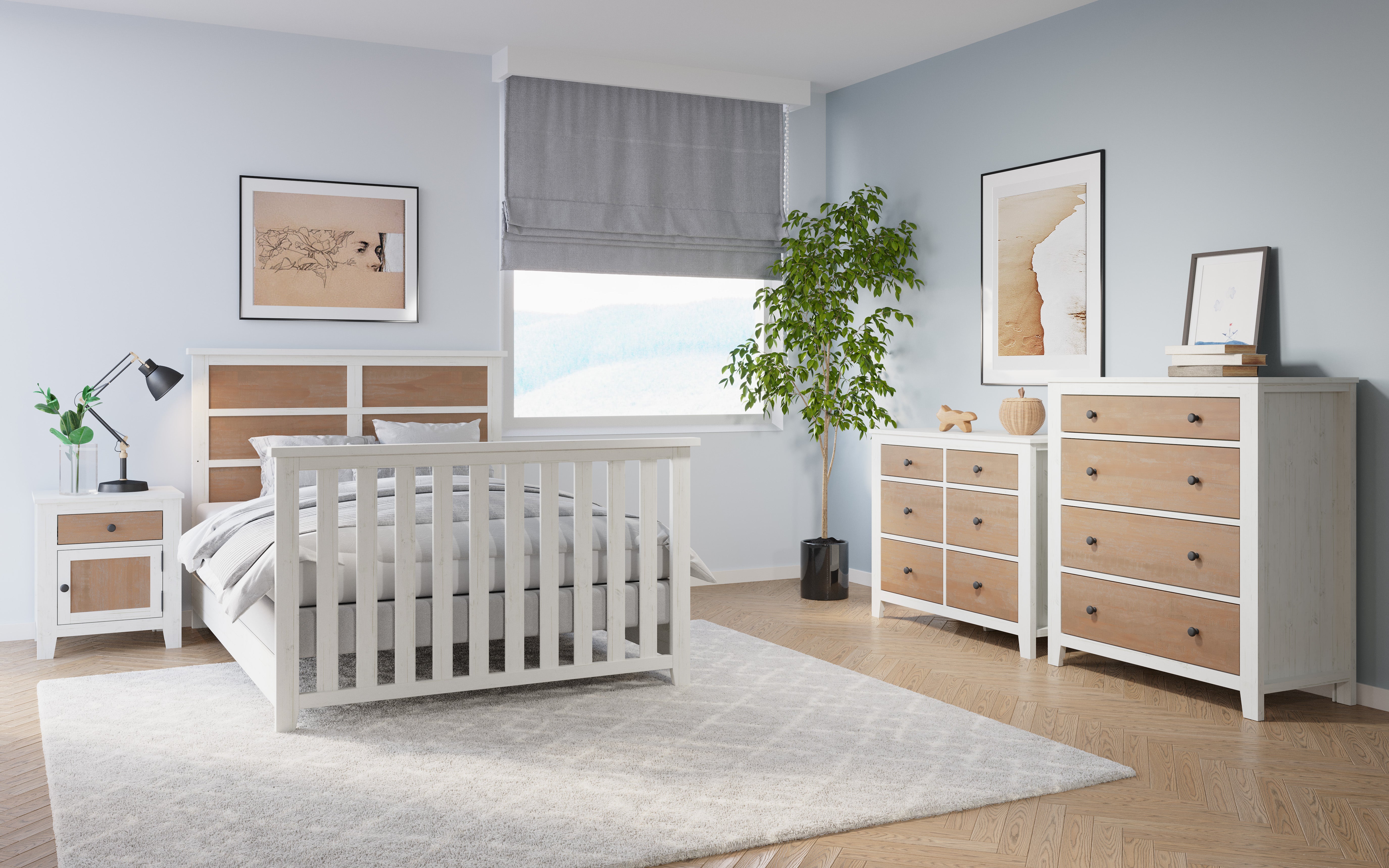 The Child Craft Ocean Grove Nightstand in White/Brown stands on a wooden floor, topped with a black desk lamp. A potted plant and a basket with a teddy bear complete this nautical farmhouse-inspired nursery nightstand display.