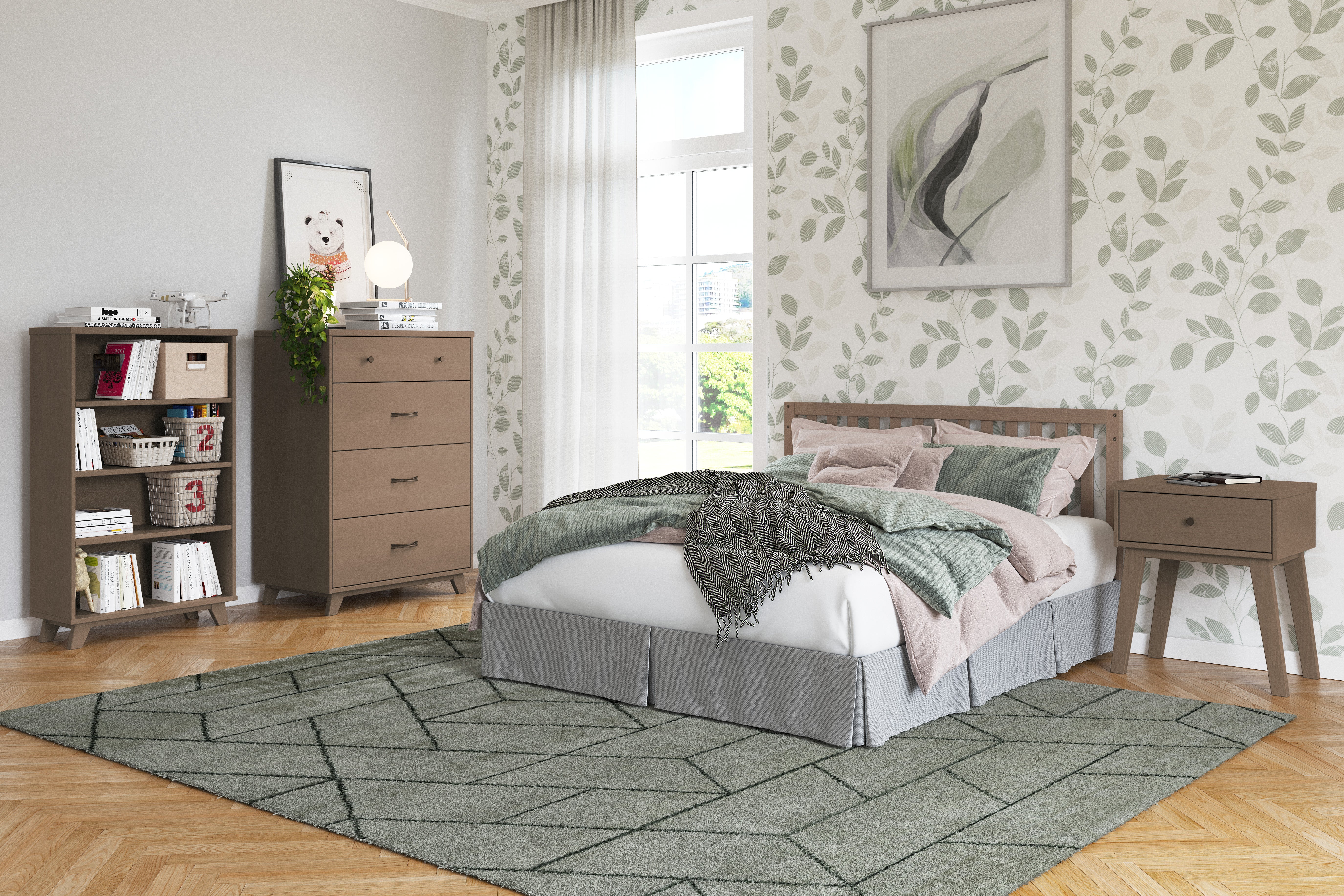 The Child Craft Soho Nightstand in Dusty Heather stands beside a bed, topped with a glass of water, a book, eyeglasses, and a vase of ferns, against leafy green-patterned wallpaper.