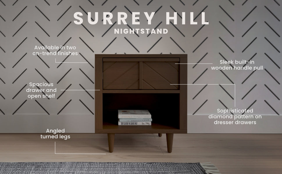 The Child Craft Surrey Hill Nightstand in Toasted Chestnut features angled legs and stands by a white wall with black chevron lines. It has a drawer, an open shelf with books, and a lamp on top. A bed, rug, and window are also visible.