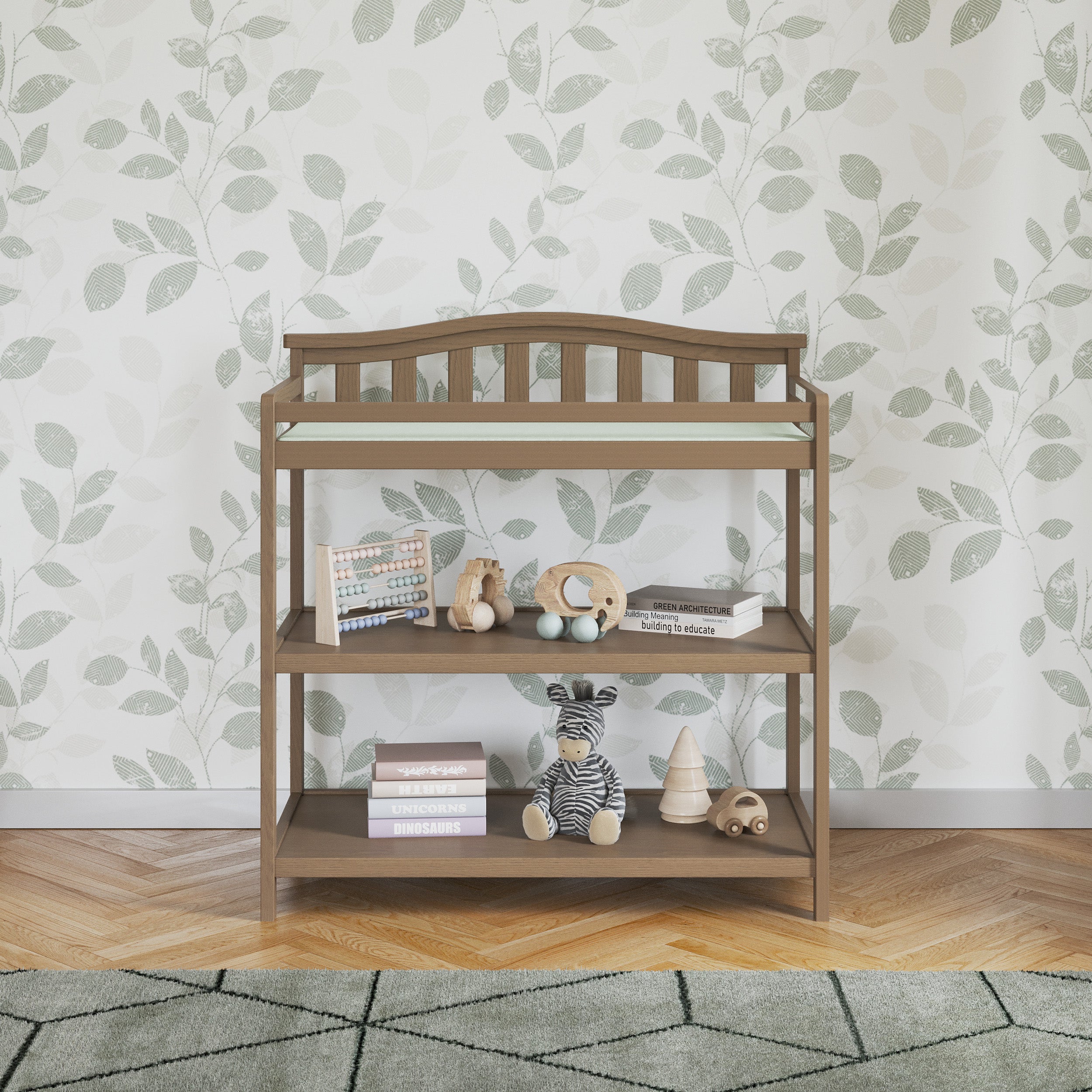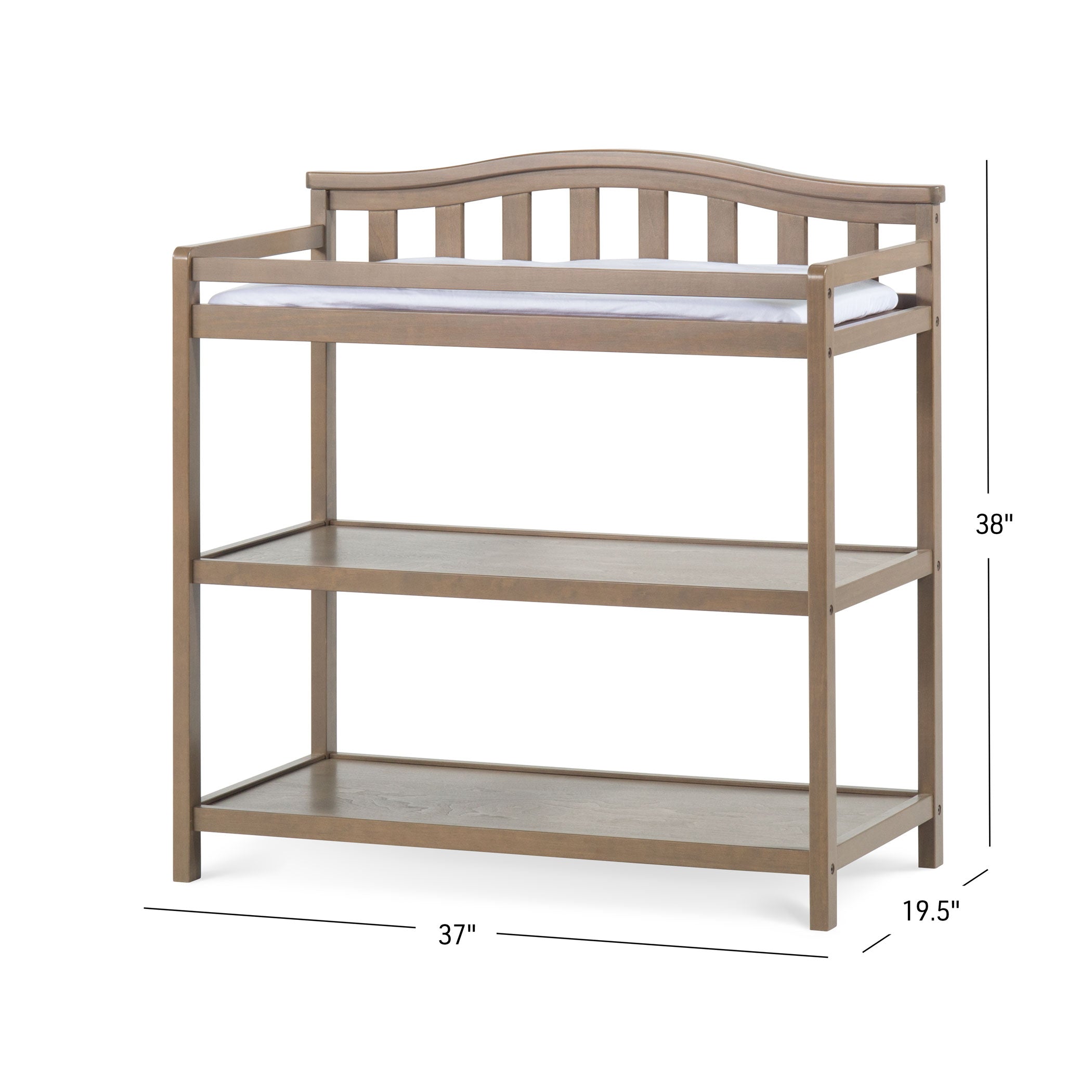 Add a classic look to your baby’s nursery with the Arch Top Baby Changing Table. The clean design, spacious shelves, and deep changing area elevate any nursery. The changing table’s slatted back, rounded edges, and cap rails are sophisticated touches that pair well with other items in the Cottage Arch Top Collection, along with a variety of other styles. Features two open shelves with ample storage space and are perfect for storing books, toys and all other necessities as your child grows Includes built in safety rails and straps for added security Comes with water-resistant, easy to clean changing pad Design details include slatted back, rounded edges, and filleted cap rail ends Constructed from quality pine wood to match any aesthetic Available in Matte White, Jamocha, Cool Gray, Dapper Gray, Slate and Dusty Heather non-toxic, baby-safe finishes Sturdy construction holds 30 pounds of weight Easy assembly