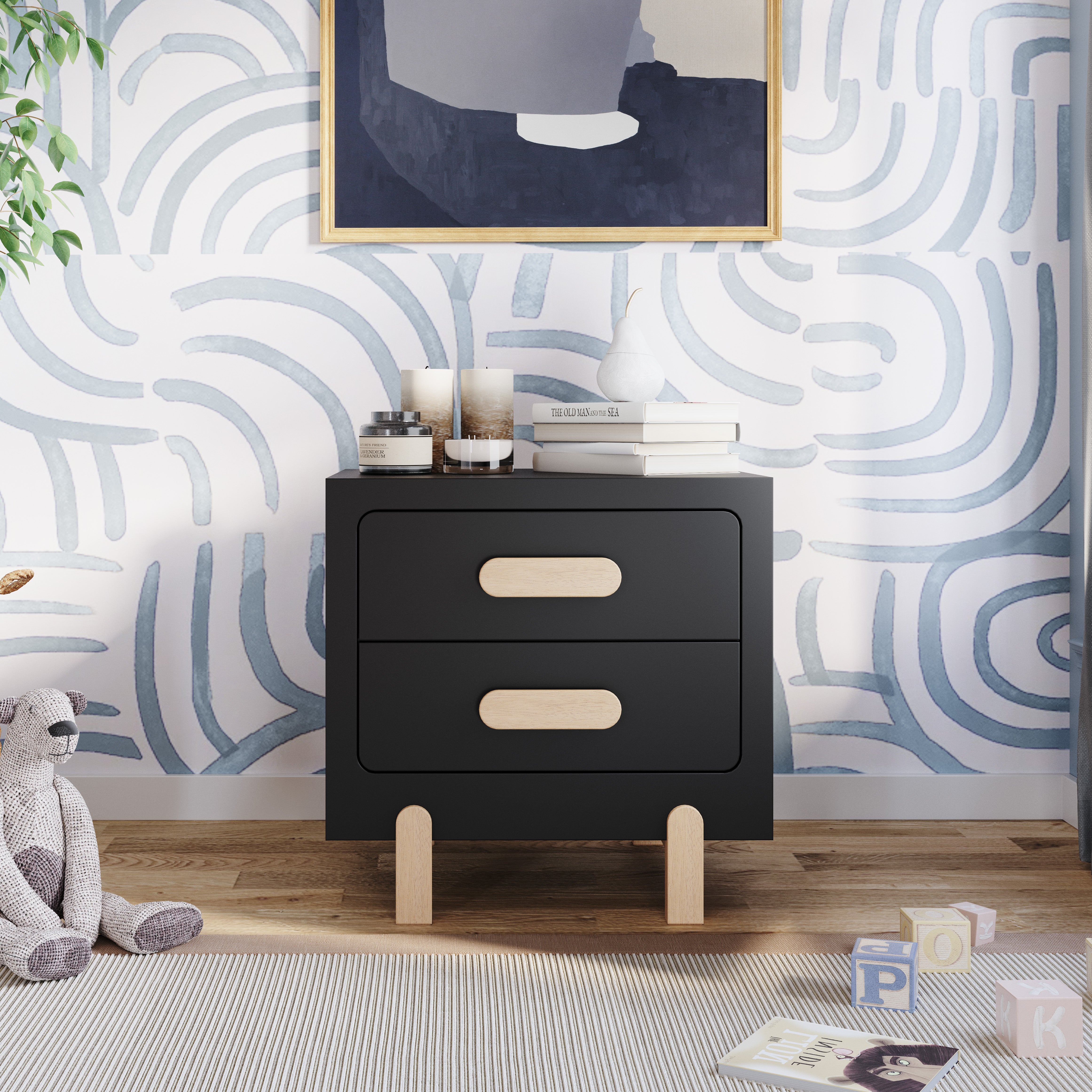 The Park Heights Night Stand in Caviar Black by Child Craft stands against a blue and white abstract wall, topped with decor, books, and candles. Children's books and a stuffed animal are placed on the wooden floor nearby.