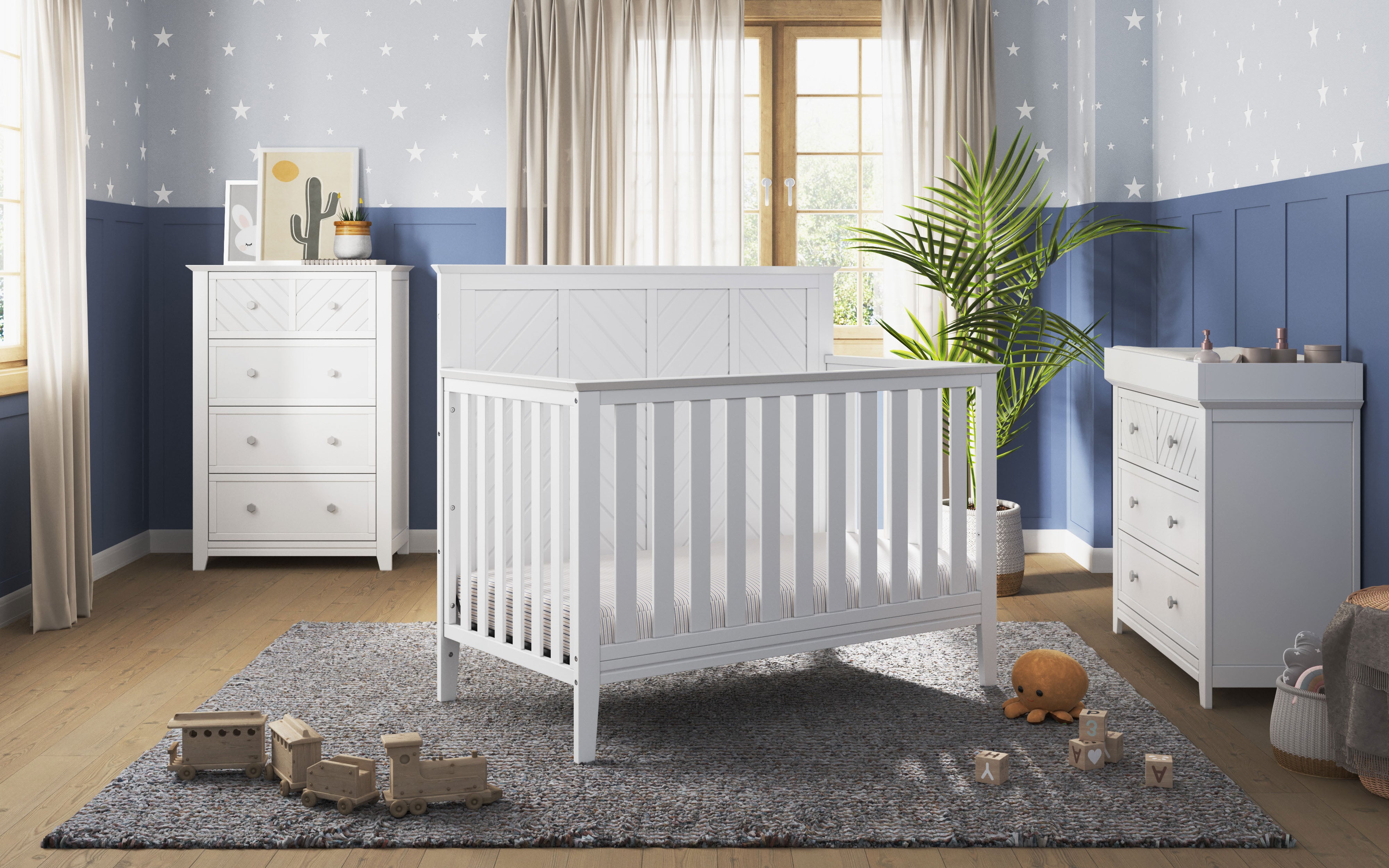 The angled geometry of chevron adorning the Atwood 3 piece nursery set will bring a fresh and modern look to your baby’s nursery. The beveled edges and rich finishes tie the unique and intricate details together to create the stunning appearance. This 3 piece collection includes the Atwood 4-in-1 Convertible Crib, 3-drawer dresser, and 4-drawer Chest. Available in Child Craft’s Matte White, Lunar Gray, and Cocoa Bean baby safe, non-toxic finishes, the Atwood 3 piece nursery furniture set provides a striking ambiance for your precious bundle.