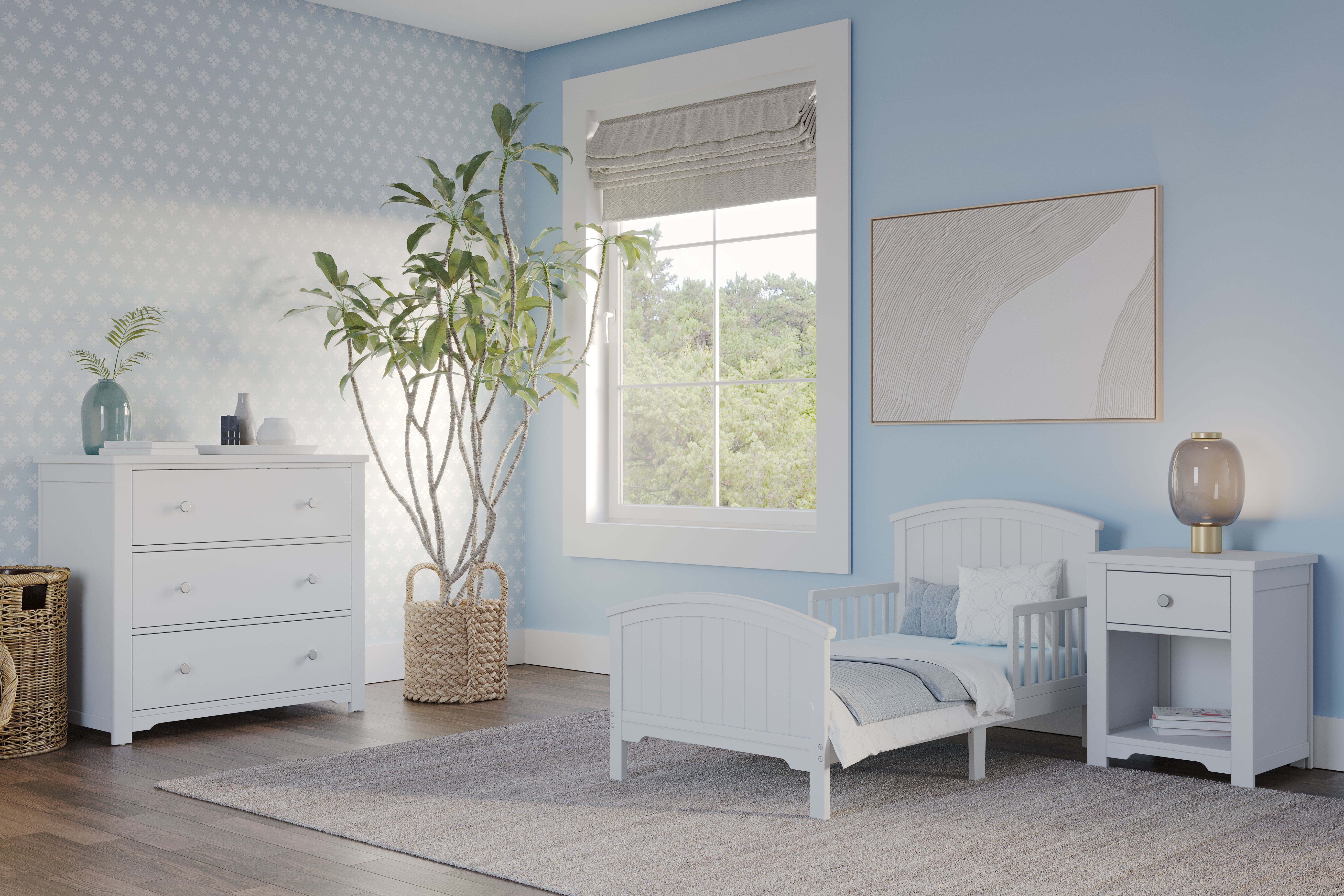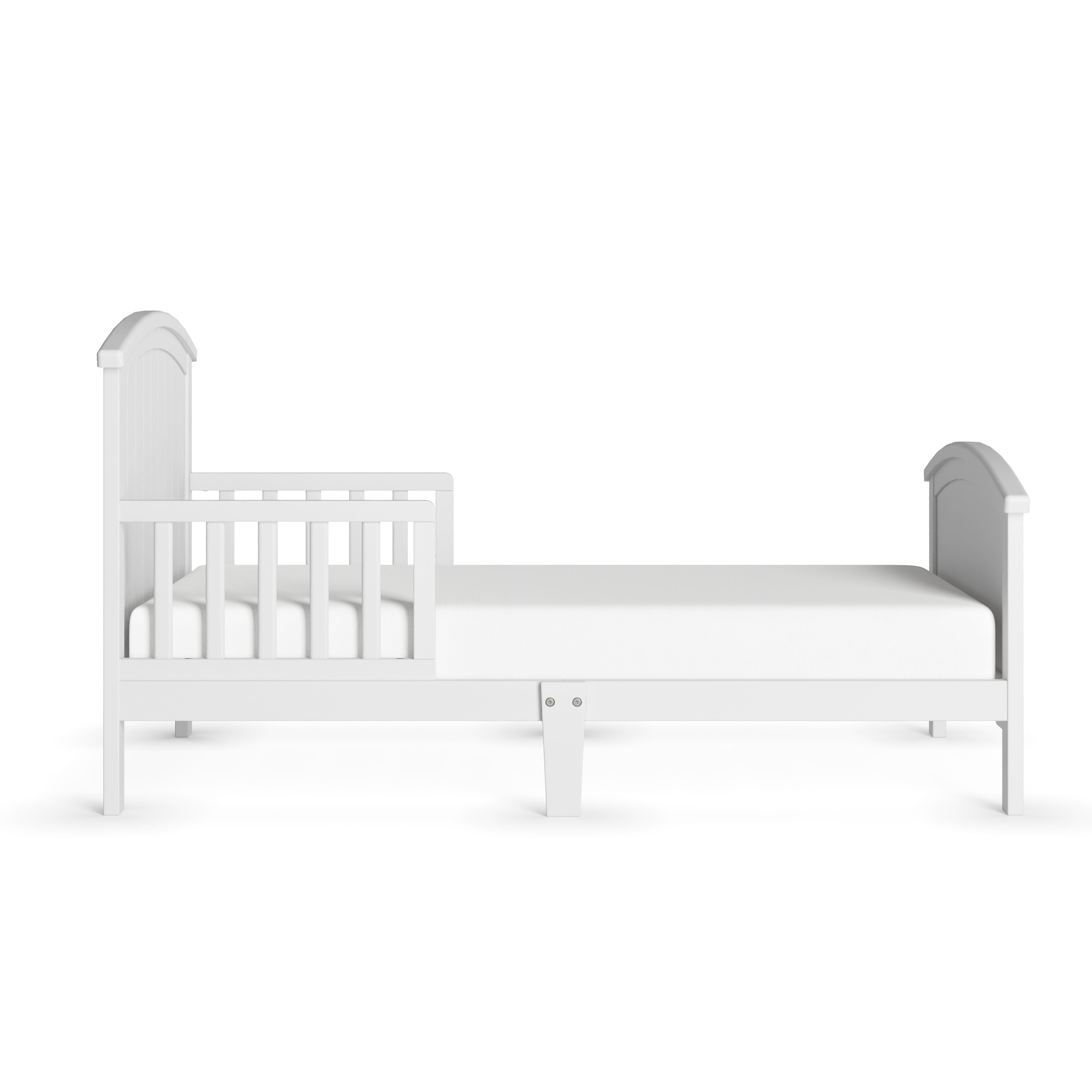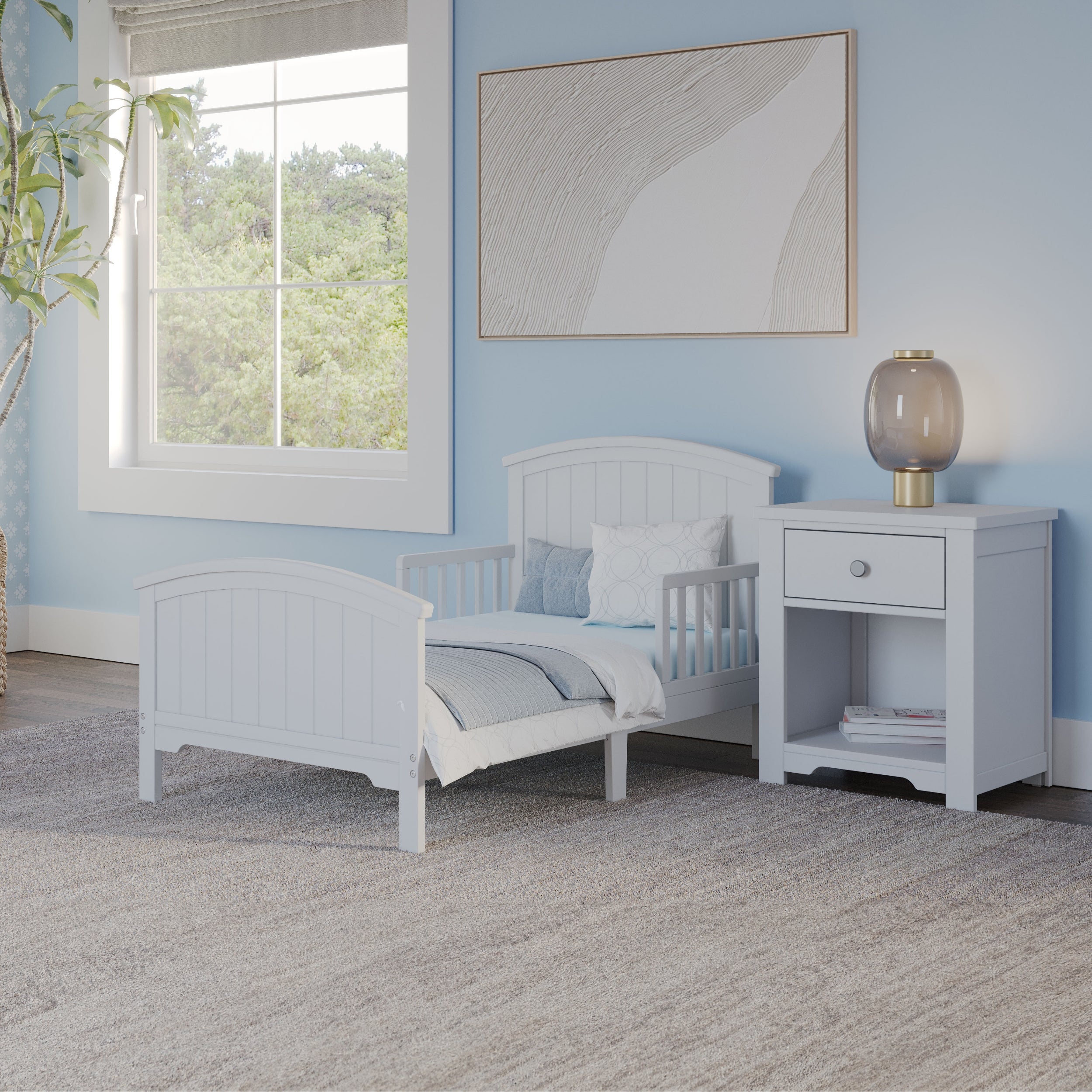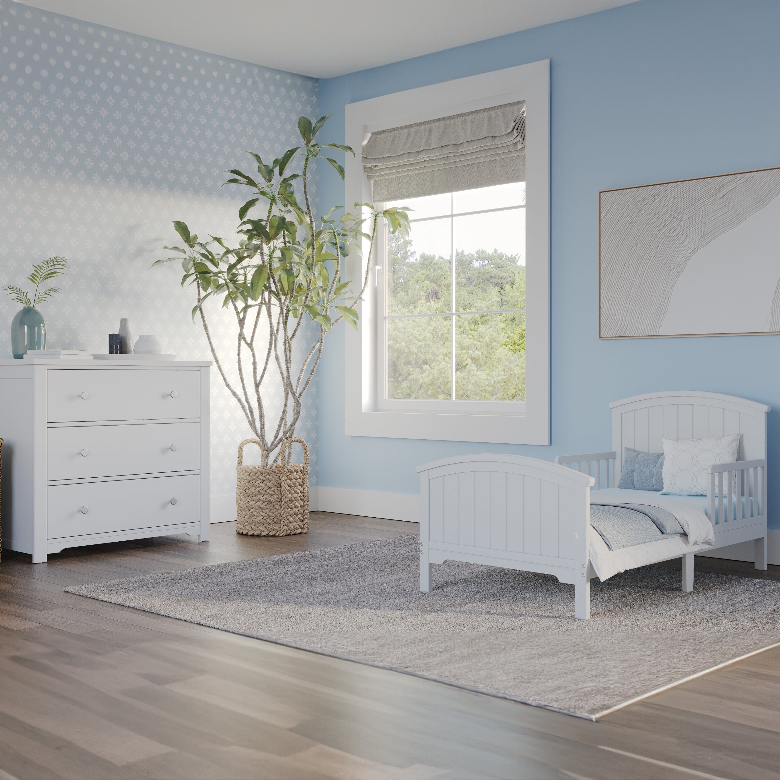 The Child Craft Hampton Toddler Bed in matte white, with guard rails and blue and white bedding, is set on a gray rug in a bright room featuring light blue patterned wallpaper, a leafy plant, and framed wall art above the bed.