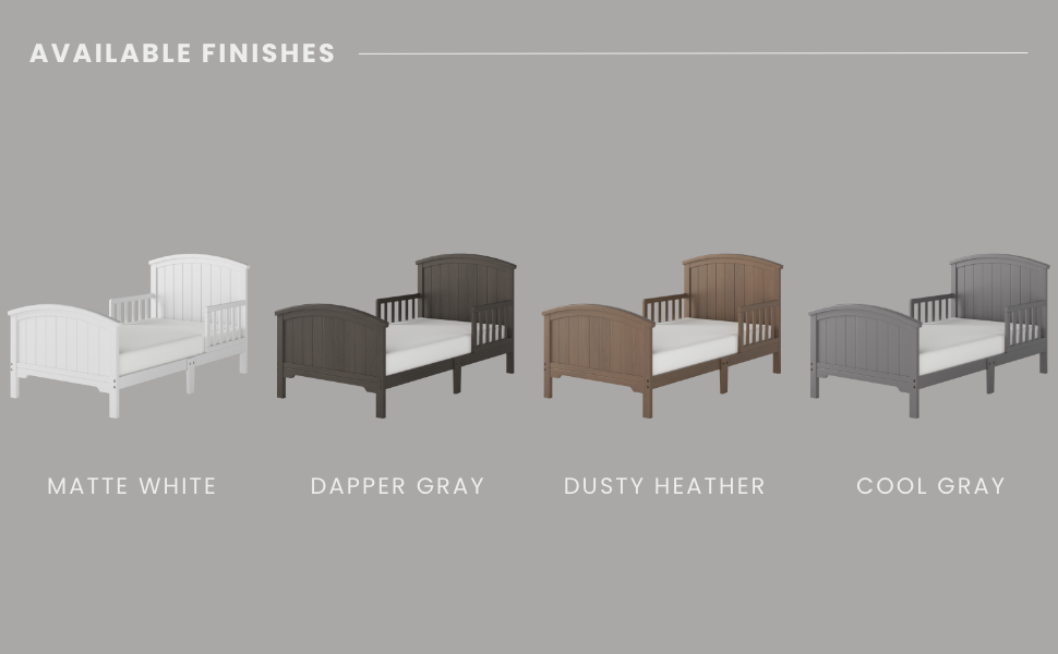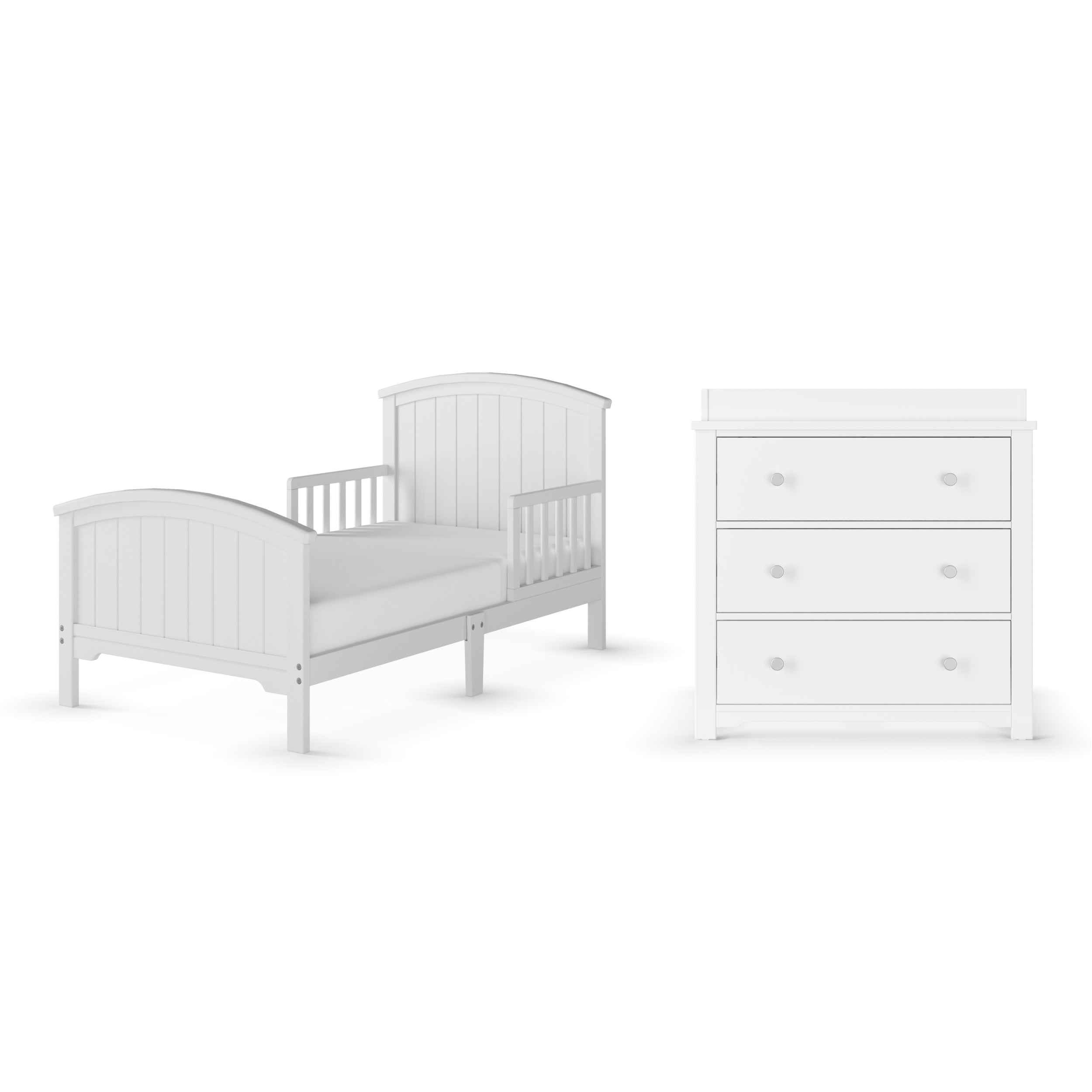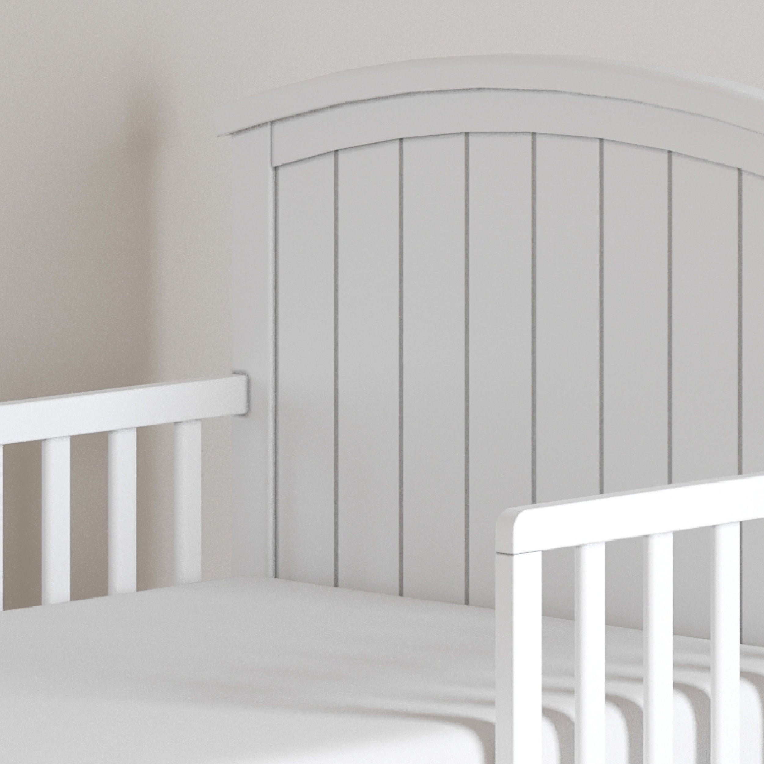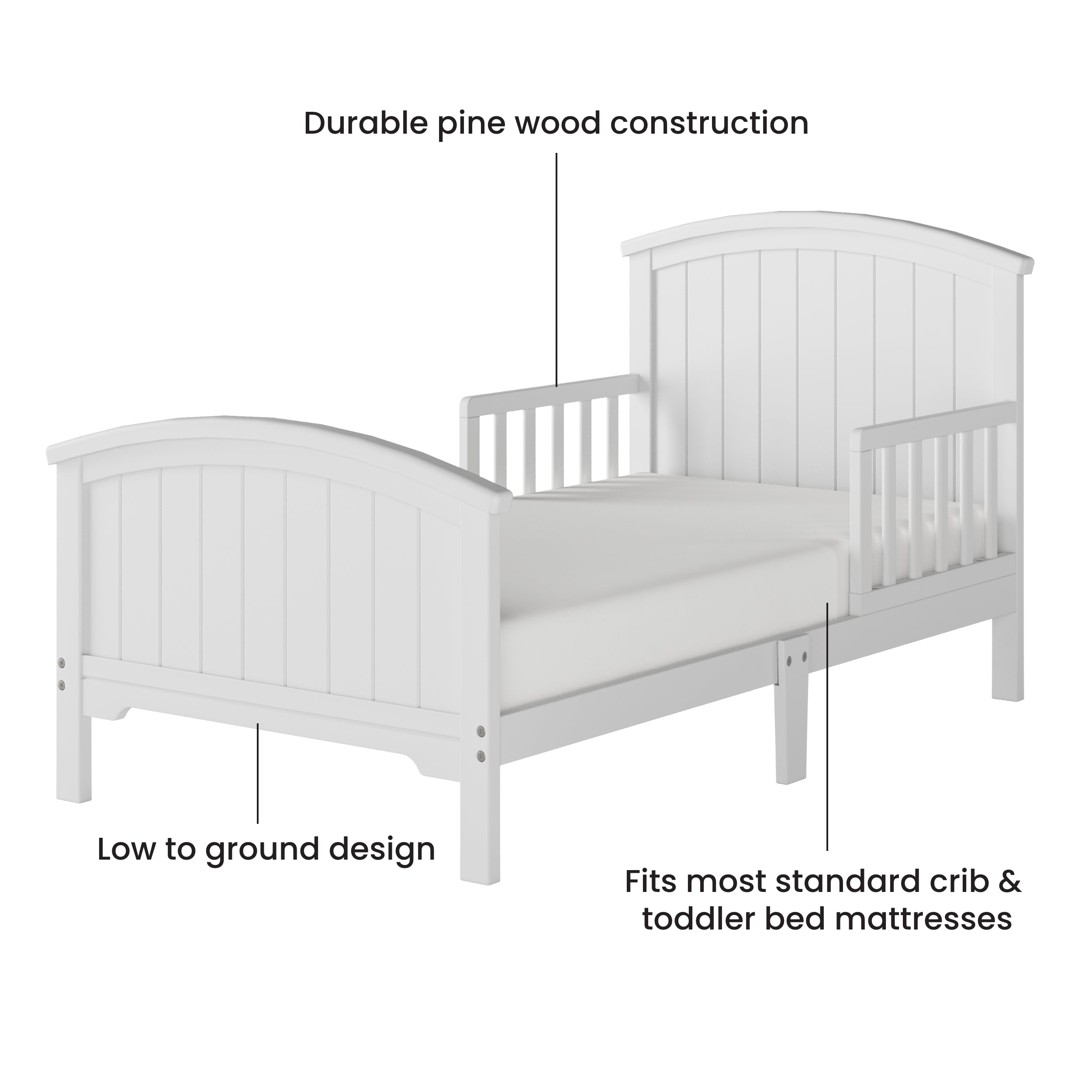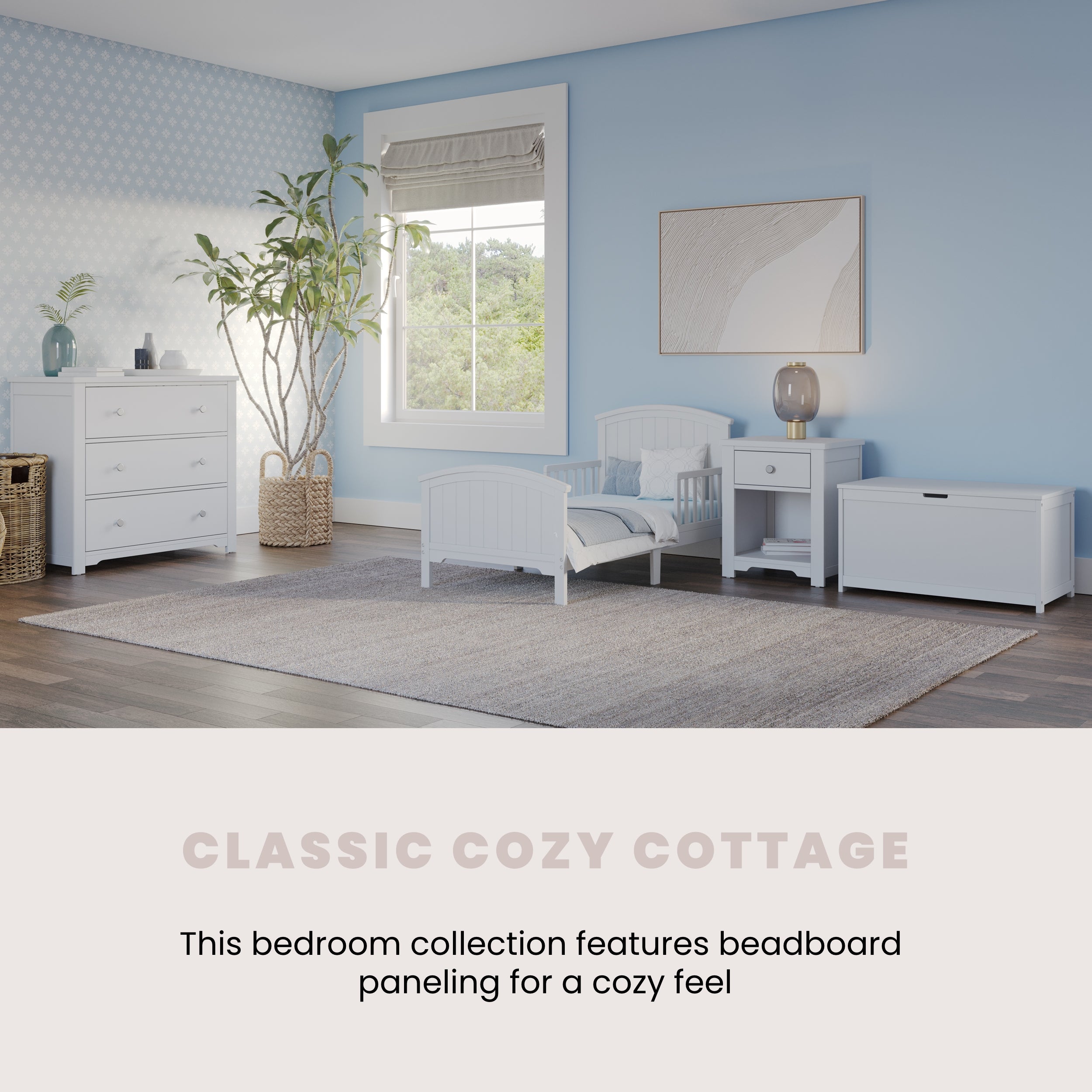 The Child Craft Hampton Toddler Bed in matte white, with guard rails and blue and white bedding, is set on a gray rug in a bright room featuring light blue patterned wallpaper, a leafy plant, and framed wall art above the bed.