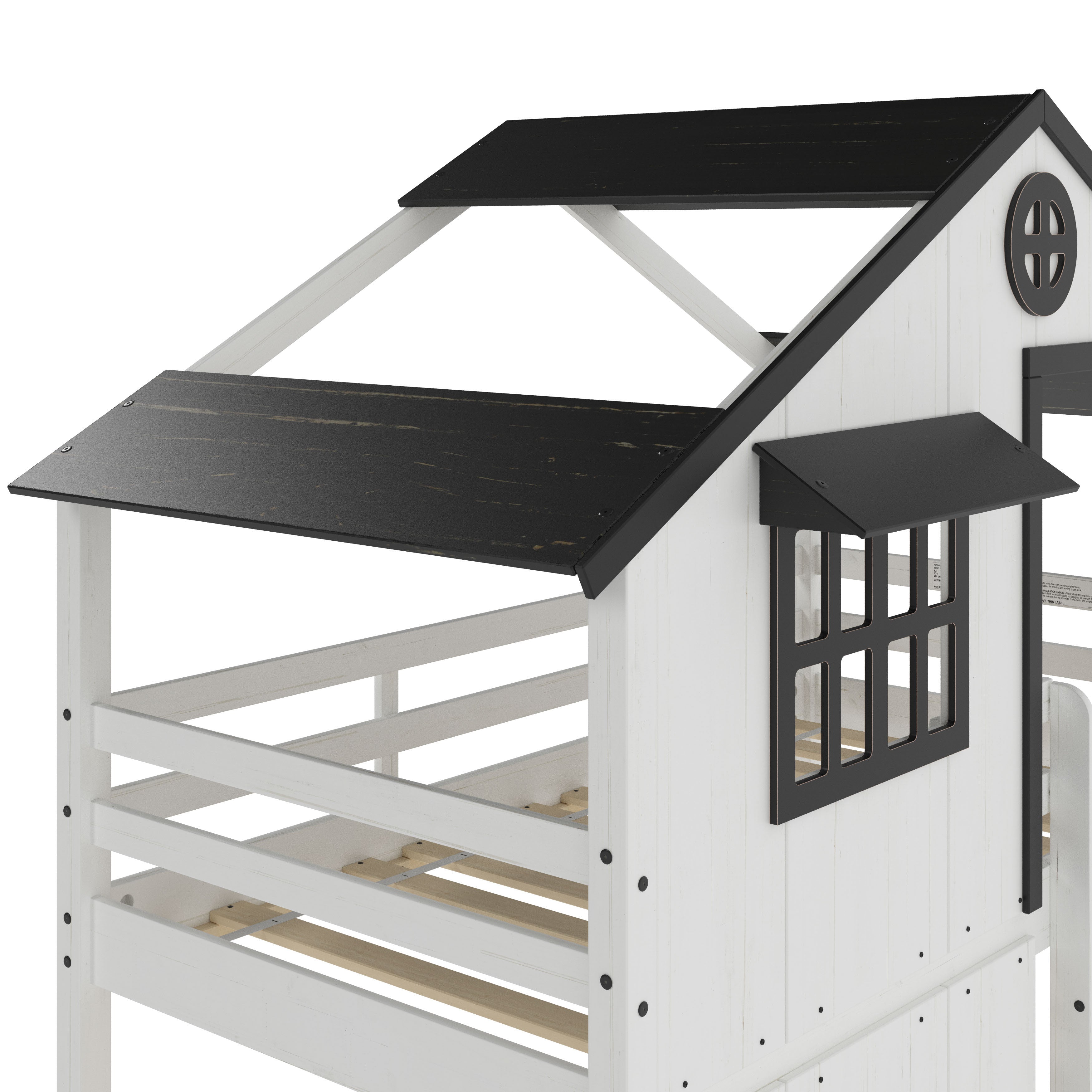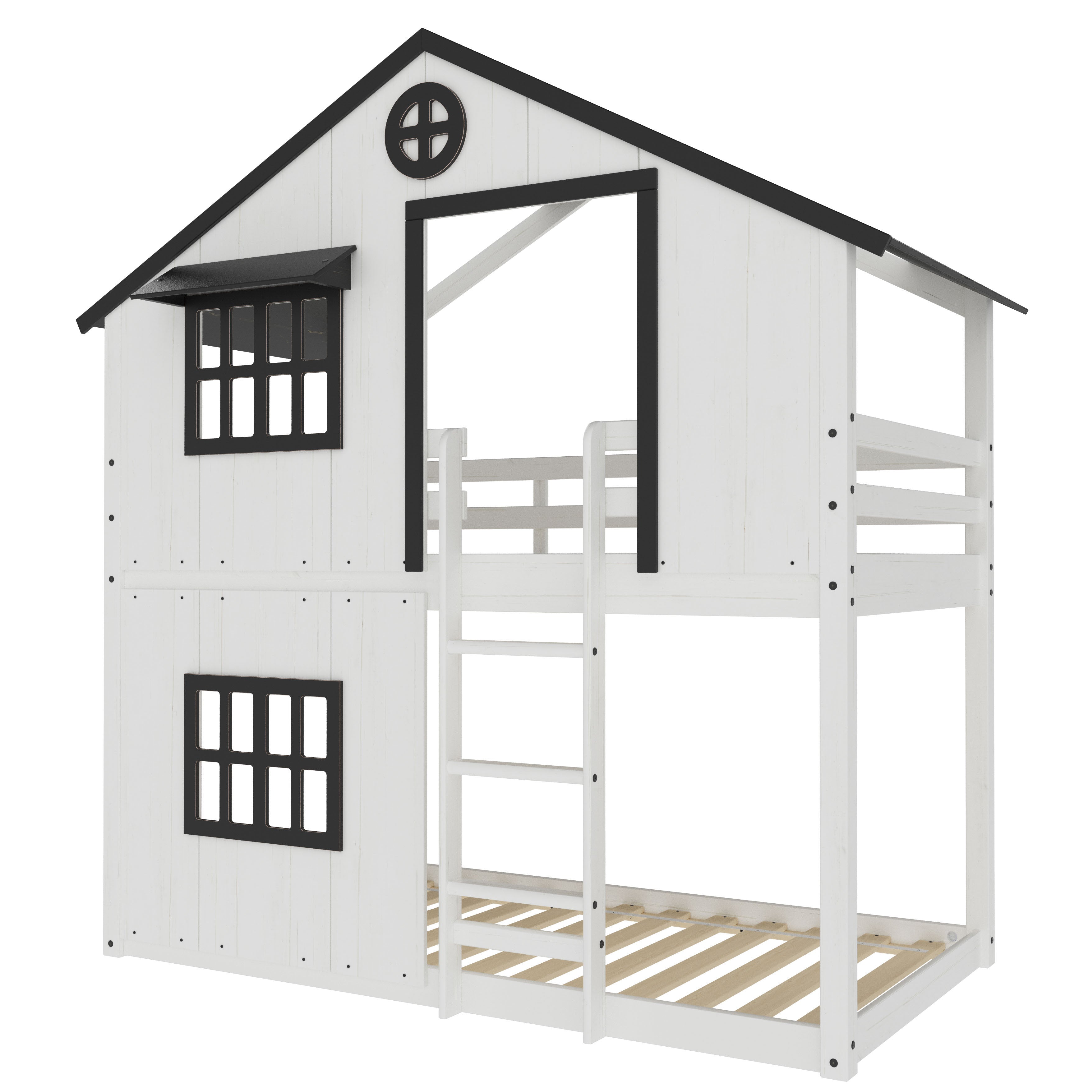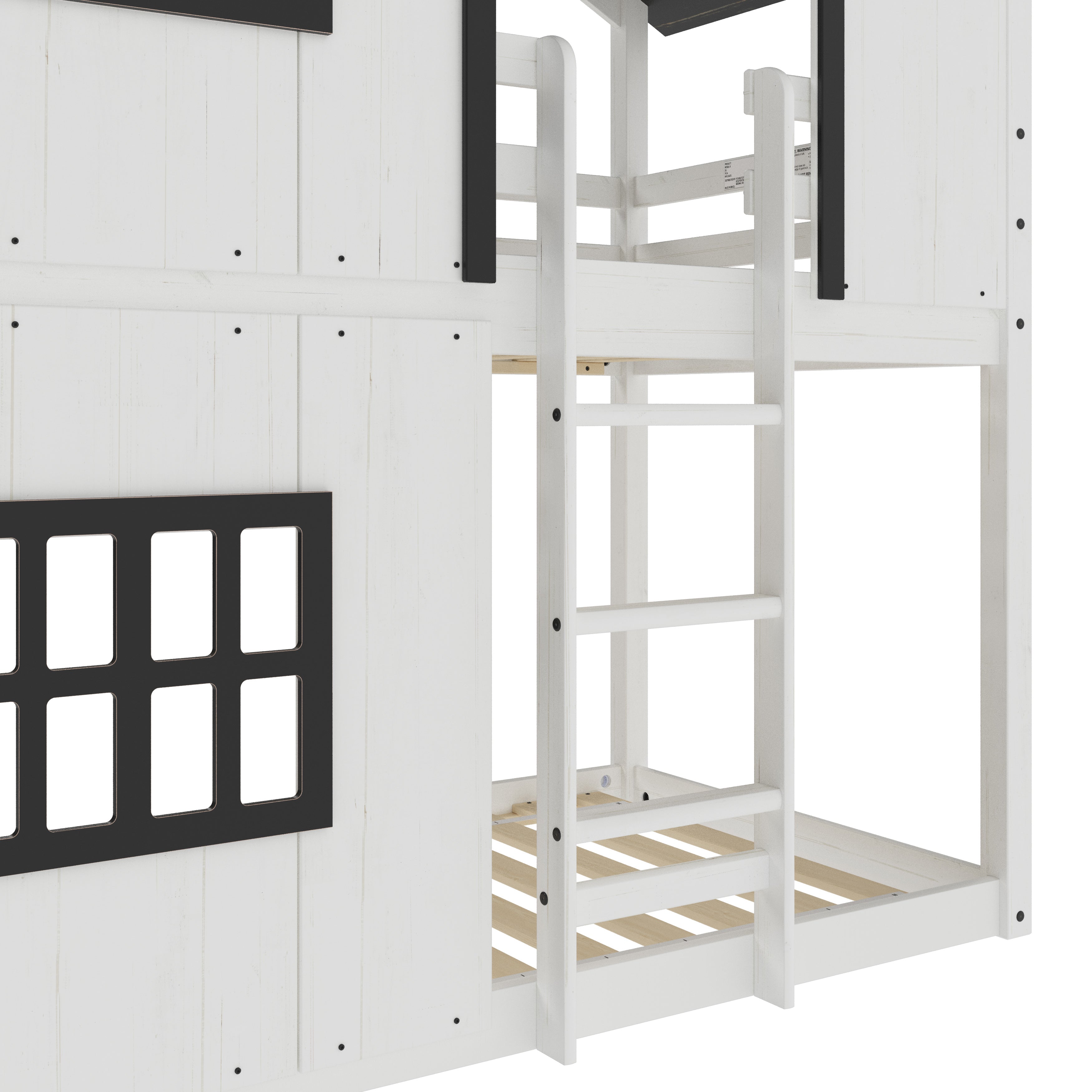 The Child Craft Modern Farmhouse Twin Over Twin Bunk Bed in White/Black features a house-inspired design with black-framed windows, a ladder, and peaked roof, set against a beige wall on a wooden floor.