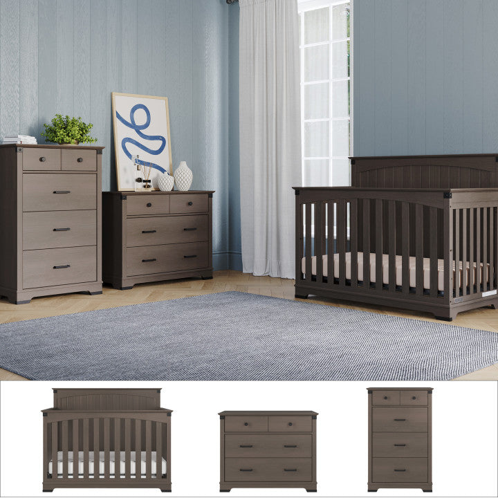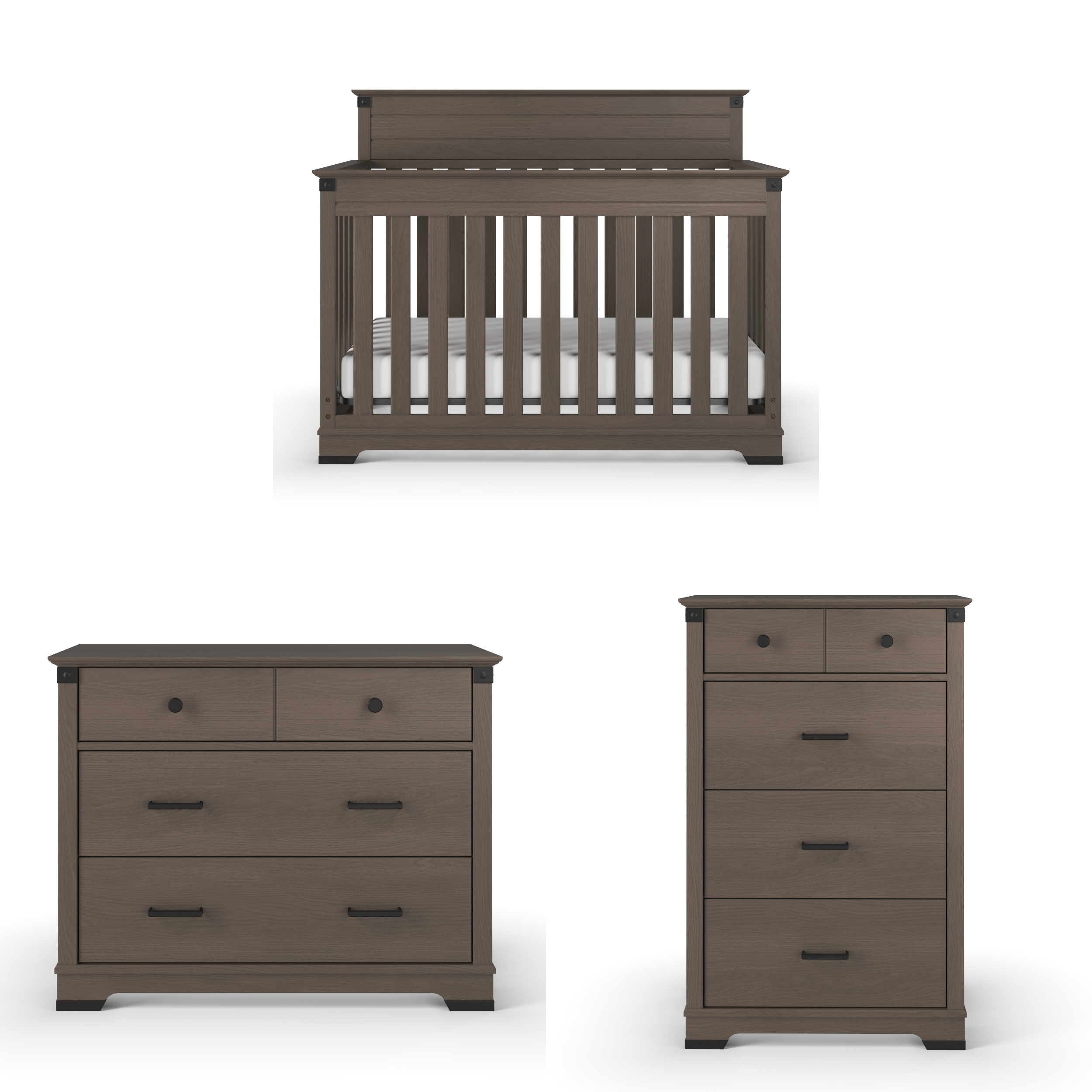 The Child Craft Redmond Deluxe 3 piece baby furniture set features a full panel back headboard with a soft, sweeping arch design that carriers over to the footboard. The sturdy, craftsman-era metal accents provide just the right amount of interesting detail. The 3 piece nursery furniture set includes the Redmond Full Panel 4-in-1 convertible crib, 3 drawer dresser, and 4 drawer chest. Available in 2 non-toxic stained finishes.