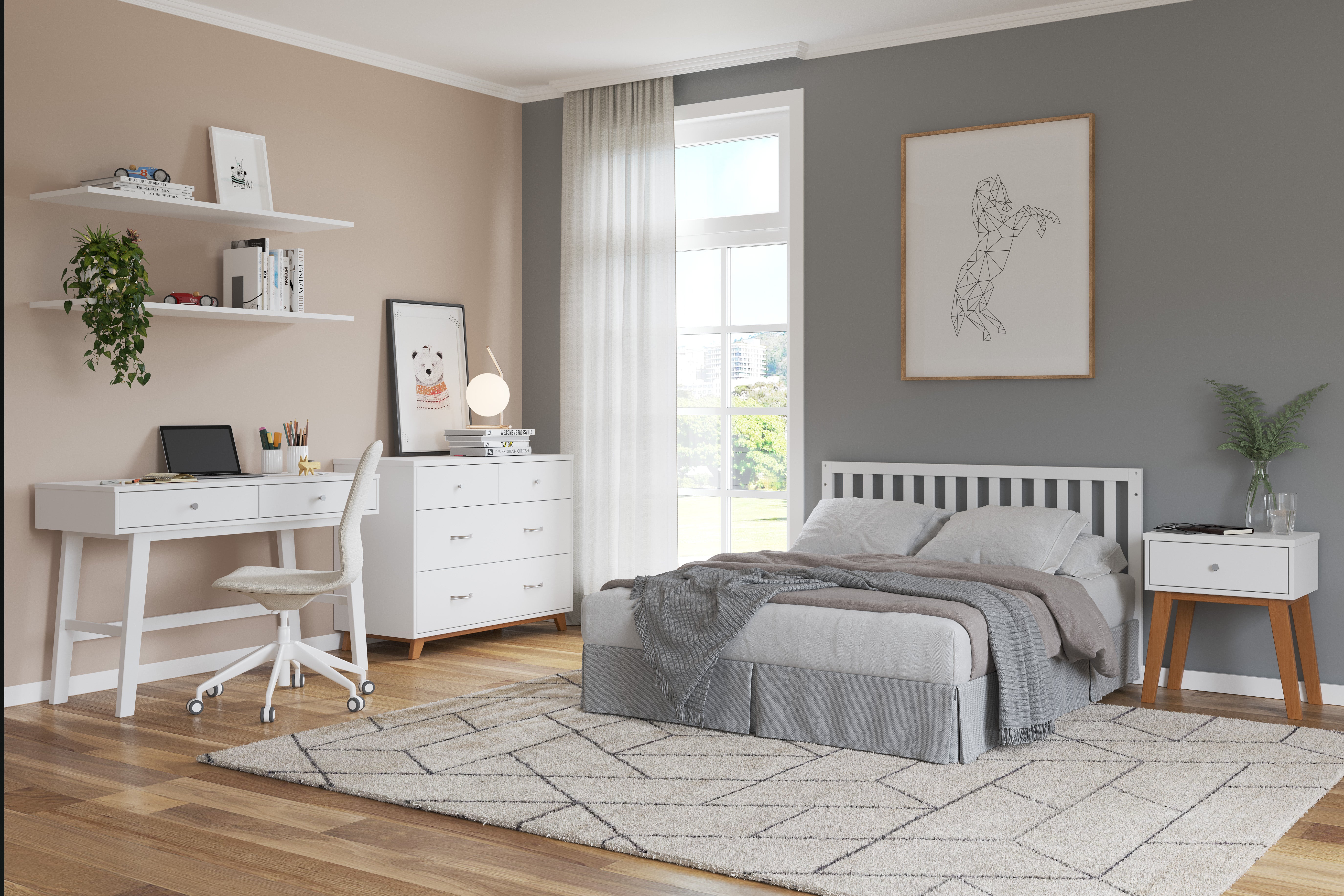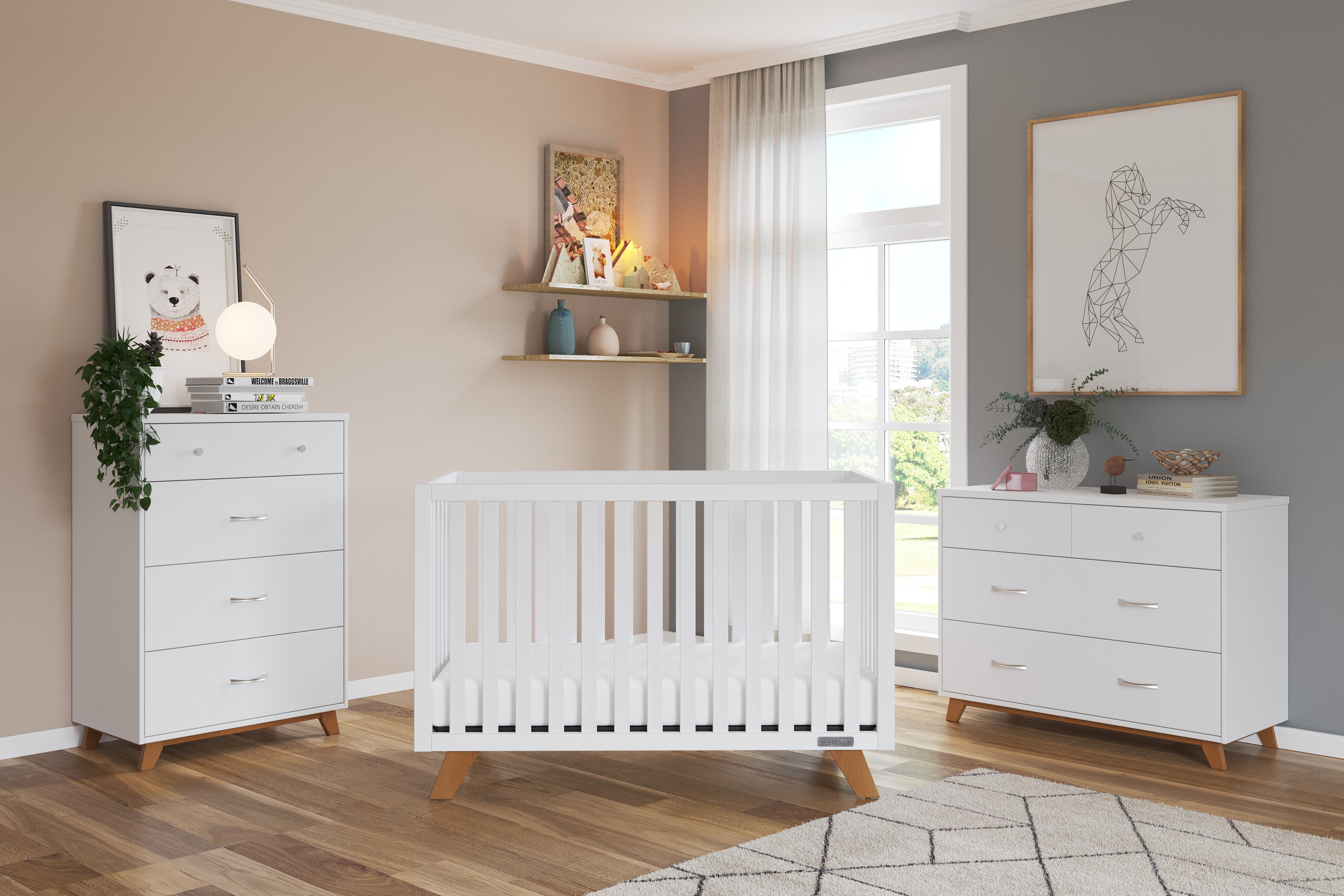 The Child Craft Soho 4 Drawer Chest in White/Natural stands in a cozy room topped with a glowing lamp, framed animal art, and a small sign. A wicker basket, green plant, curtains, and wooden toys complete the decor.