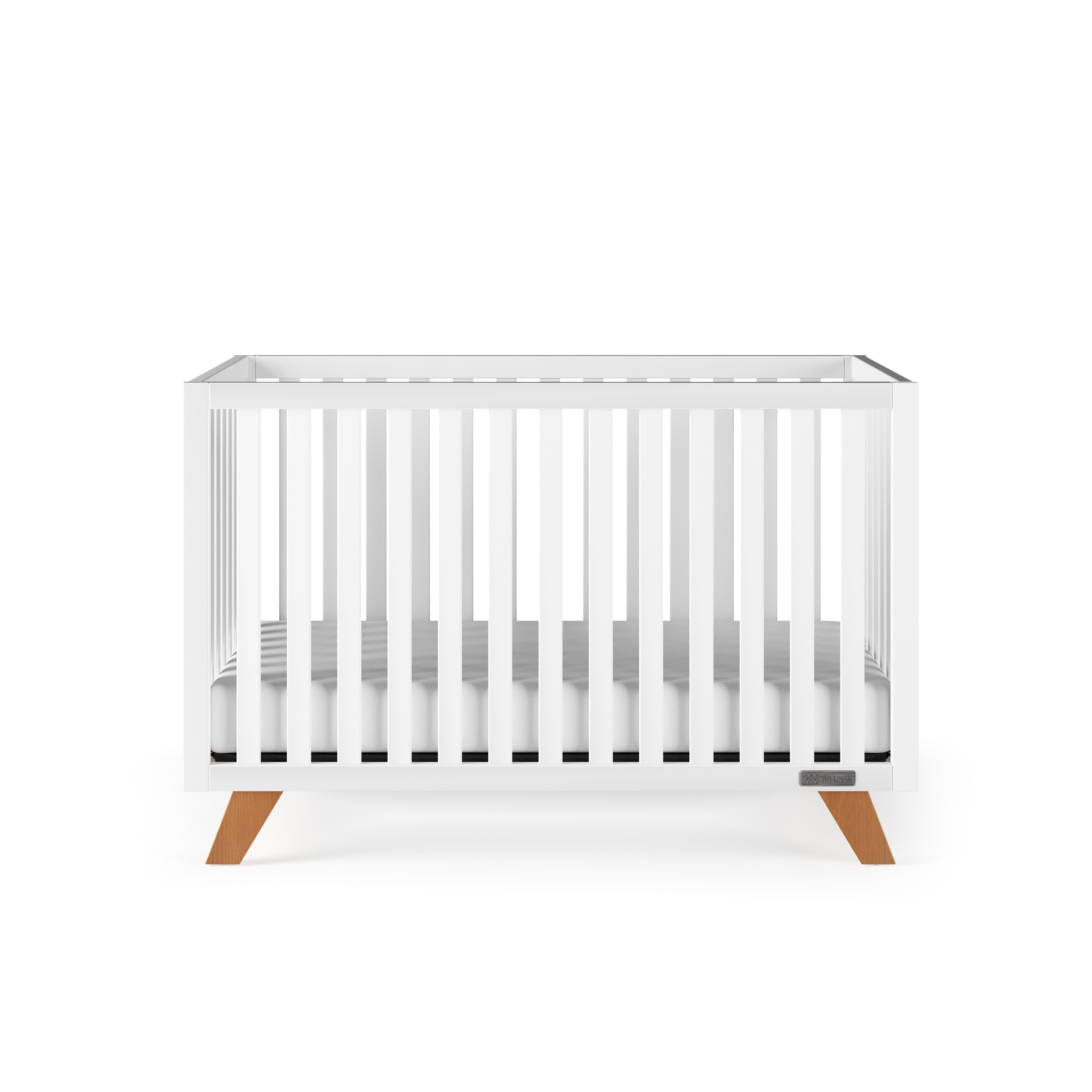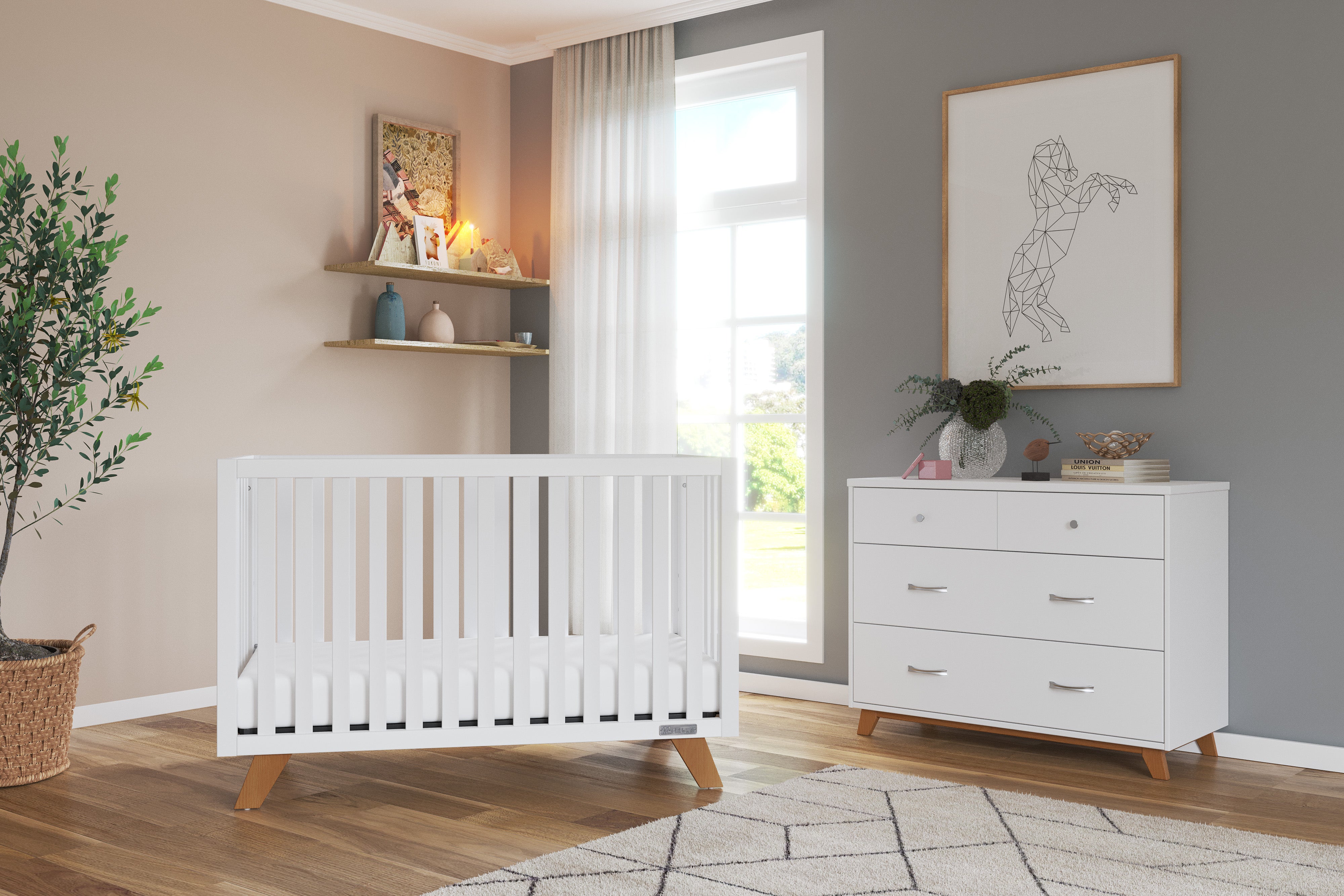 The Child Craft Soho 4-in-1 Convertible Crib in White/Natural features wooden legs and stands on a geometric rug in a softly lit nursery, with wooden toys, a plant, and a basket nearby, and framed art above on the beige wall.