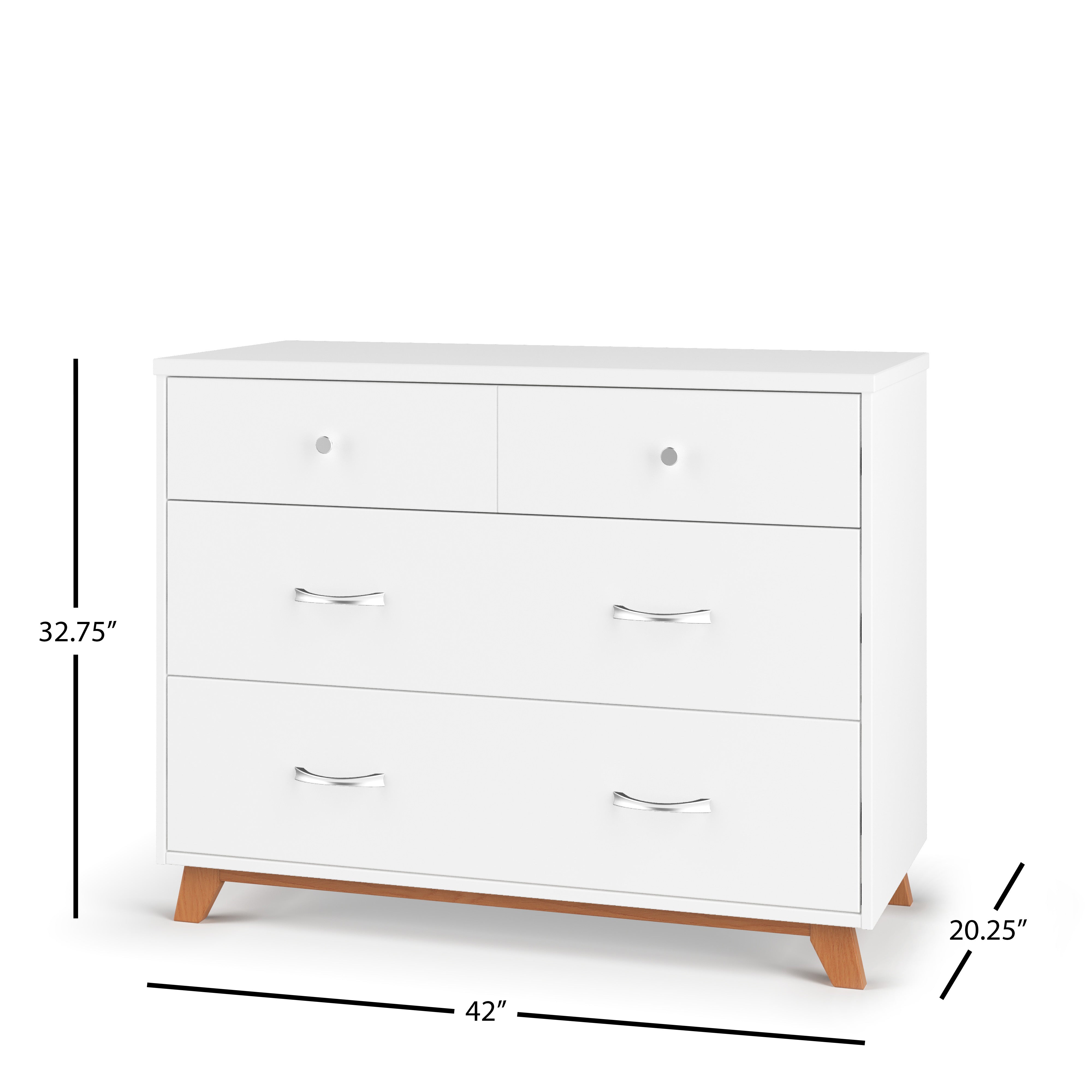 Bring a touch of mid-century modern styling to your baby's nursery with the Soho 4 Drawer Chest. This nursery chest features a minimalist design with clean lines and canted legs. 3 sophisticated finishes highlight the chest's unique features. Pair with coordinating pieces from the Child Craft Soho nursery furniture collection to complete your child’s bedroom. Storage chest with four extra-large drawers featuring a clean and modern aesthetic Drawers feature a combination of conical knobs and contemporary metal drawer pulls Smooth ball bearing drawer glides Includes anti-tip kit to securely fasten nursery chest to wall and prevent tipping Constructed of Pine, MDF with veneer, and plywood drawer boxes Non-toxic, baby-safe finish Easy assembly