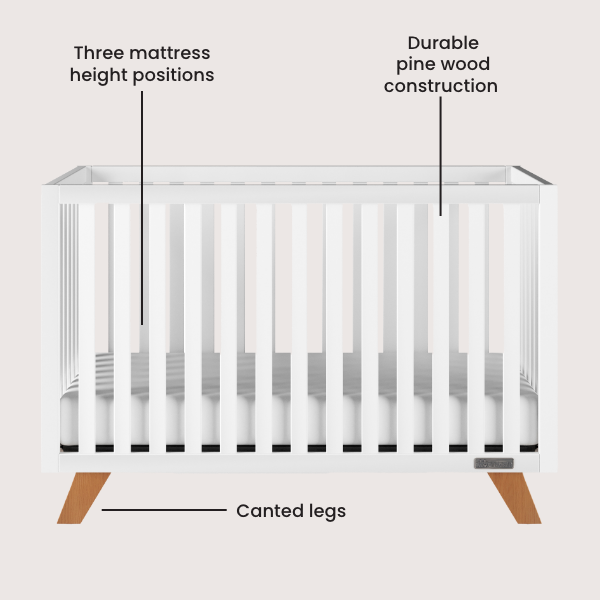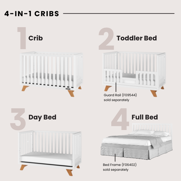 The Soho 4-in-1 convertible crib is beautifully designed with mid-century modern detailing. Clean lines and canted legs highlight the collection to create modern nursery with a stylish vintage vibe. The crib grows with your baby as it converts to a toddler bed, day bed, and full-size bed (conversion rails sold separately). Mattress board adjusts 2 height positions. Pair the Soho convertible crib with coordinating pieces from the Soho collection to finish the look. Soho Crib converts to a toddler bed, day bed, and full-size bed Coordinating toddler guard rail (F09544)and full-size Hollywood bedframe sold separately Metal mattress board adjusts 2 height positions Fits most standard size crib mattresses, sold separately All wood pine construction Non-toxic, baby-safe finishes Easy assembly Note: The F34001.43 Soho Crib in Matte White/Natural pairs with the toddler guard rail F09544.46.