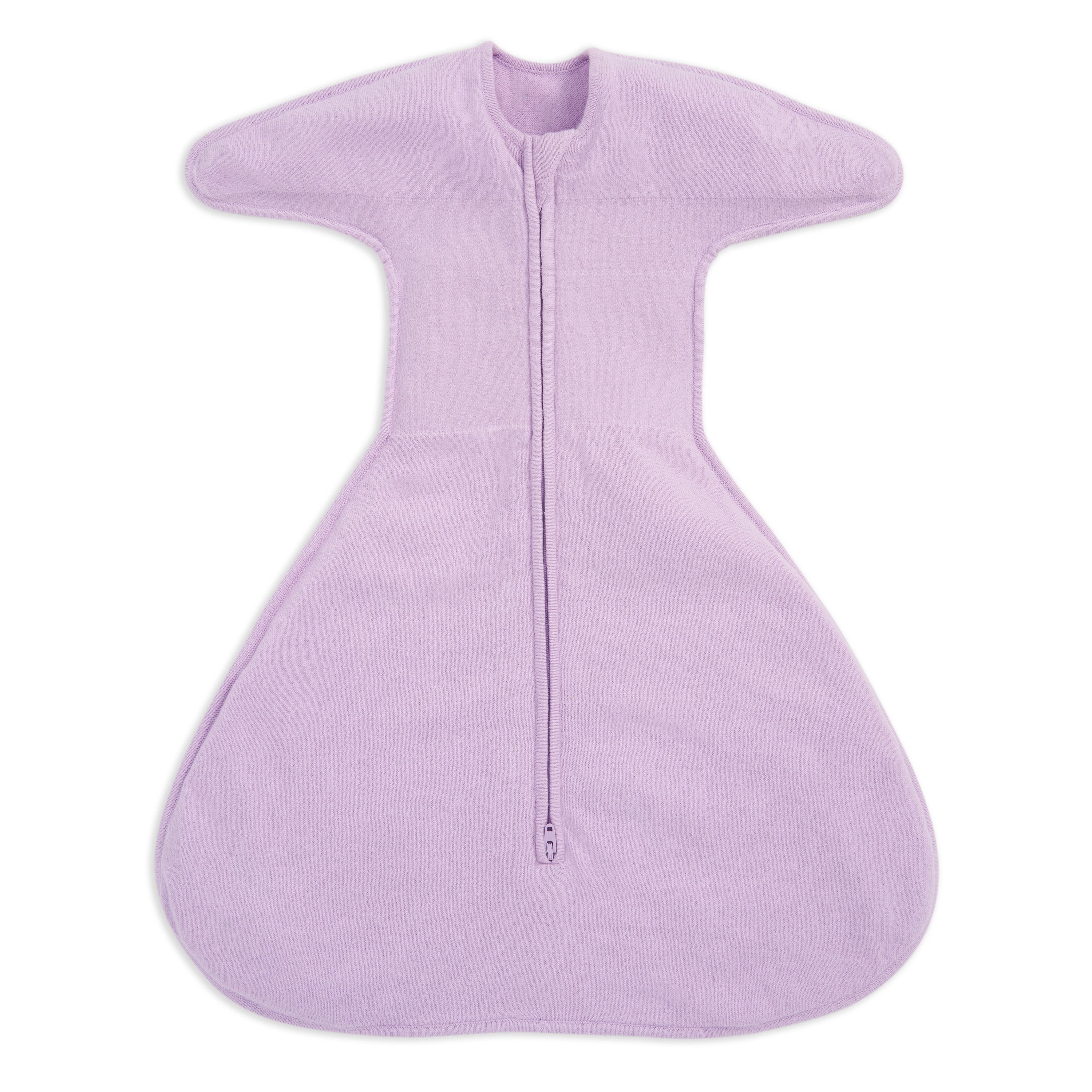 The HALO SwaddleStretch™ Newborn Swaddle TOG 0.5 in light purple has a front zipper, wide wings, and a roomy bottom, offering swaddle comfort while letting your baby move freely.