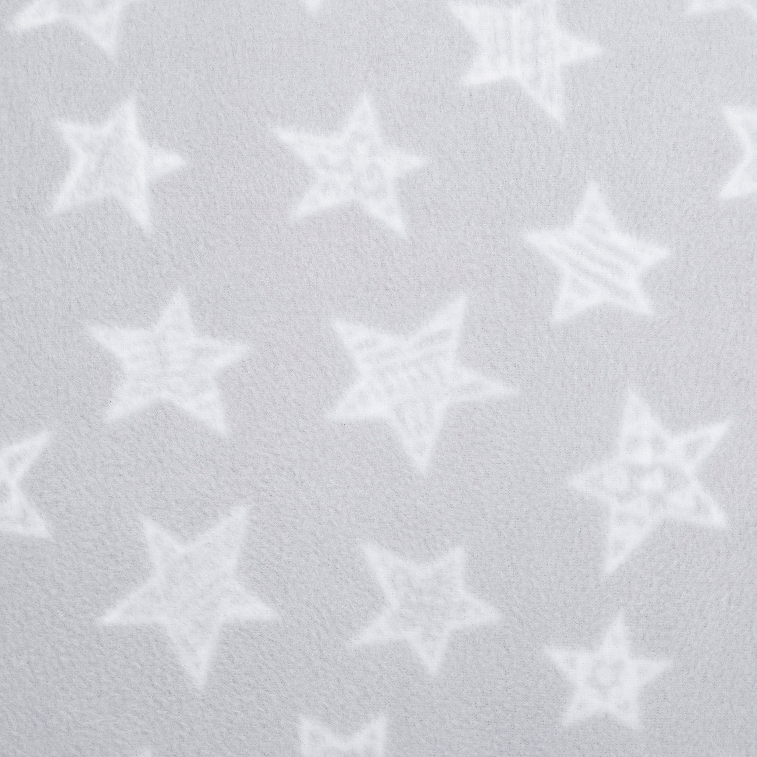 The HALO Swaddle Micro-Fleece TOG 3.0, a gray wearable baby blanket with white stars, features adjustable wings and a front zipper. Its sleeveless design ensures healthy hip development while providing a soft, snug fit to keep your baby warm and secure.
