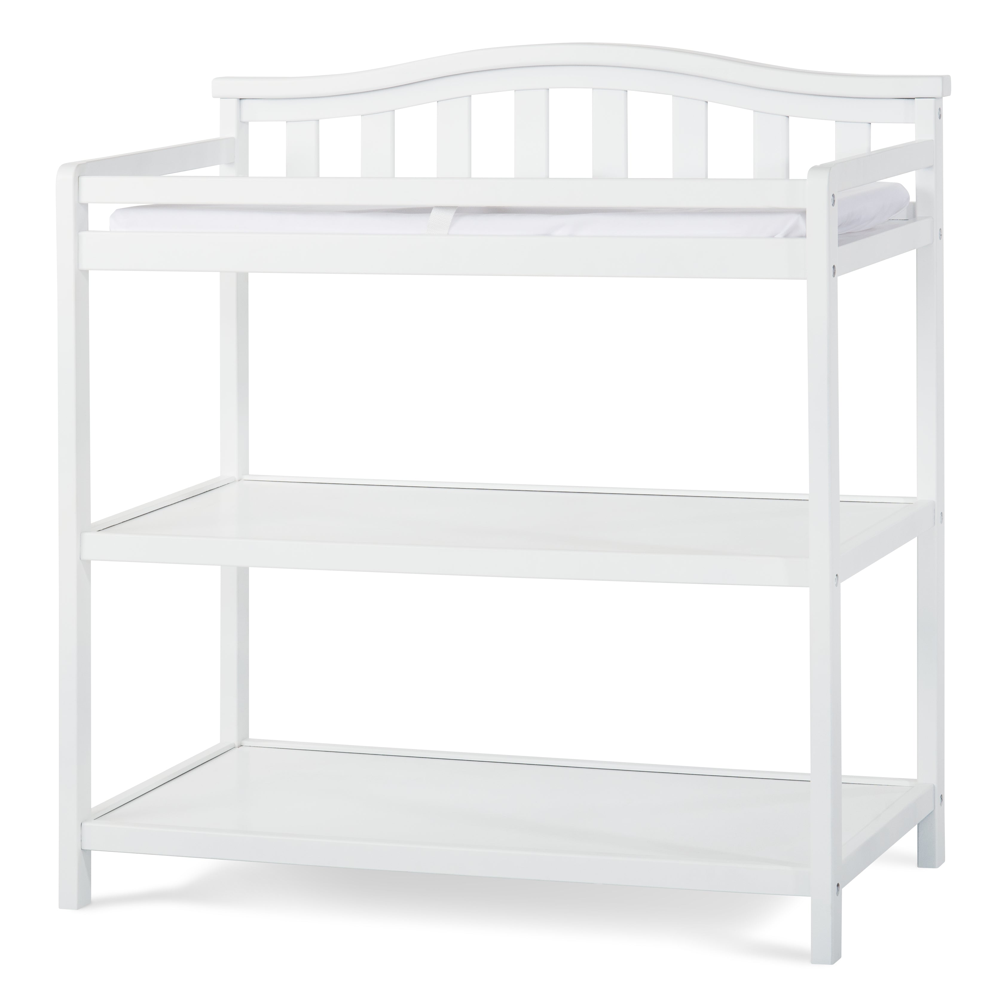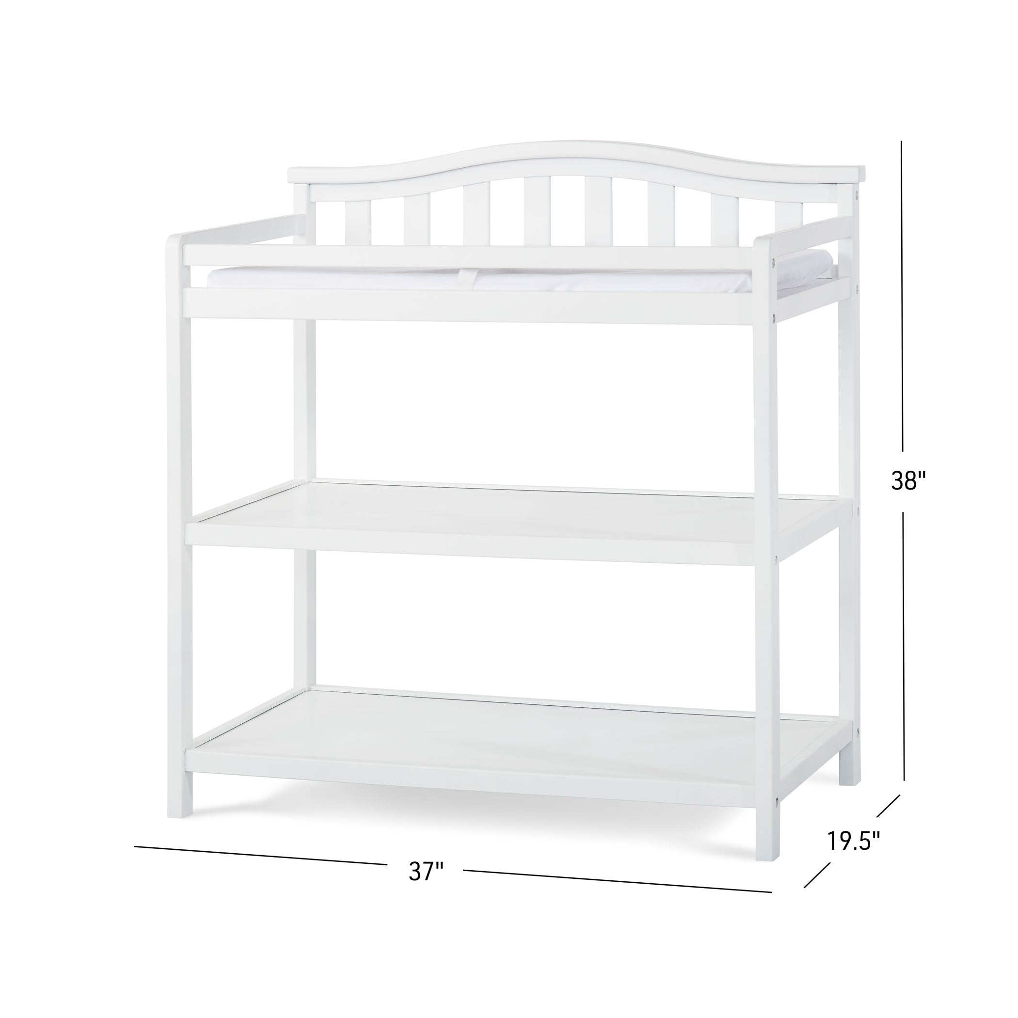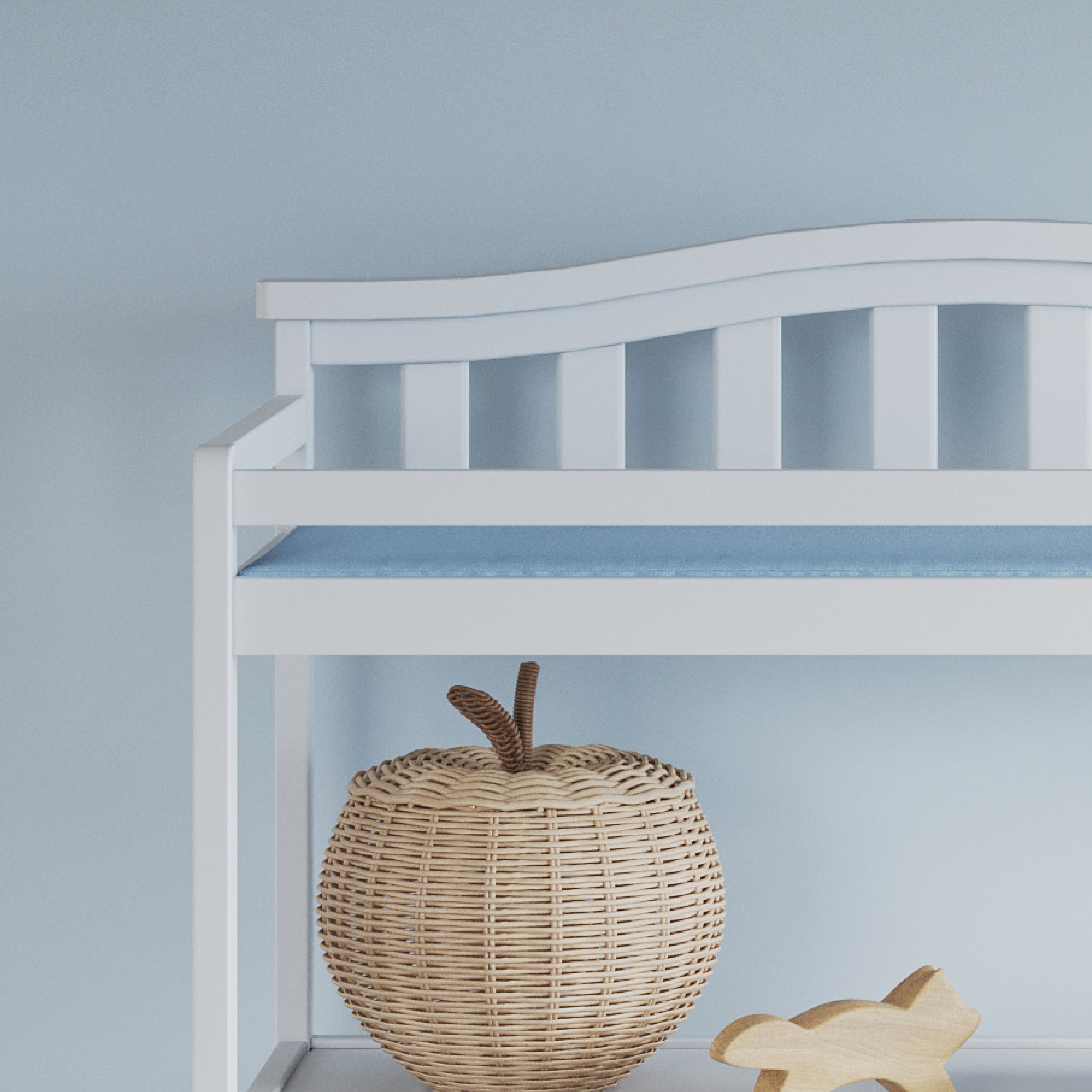 The Child Craft Arch Top Baby Changing Table in matte white, with a blue pad, wicker basket, wooden toys, books, and a stacking toy, sits against a light blue wall, paired with a striped rug, plant, and charming nursery decor.