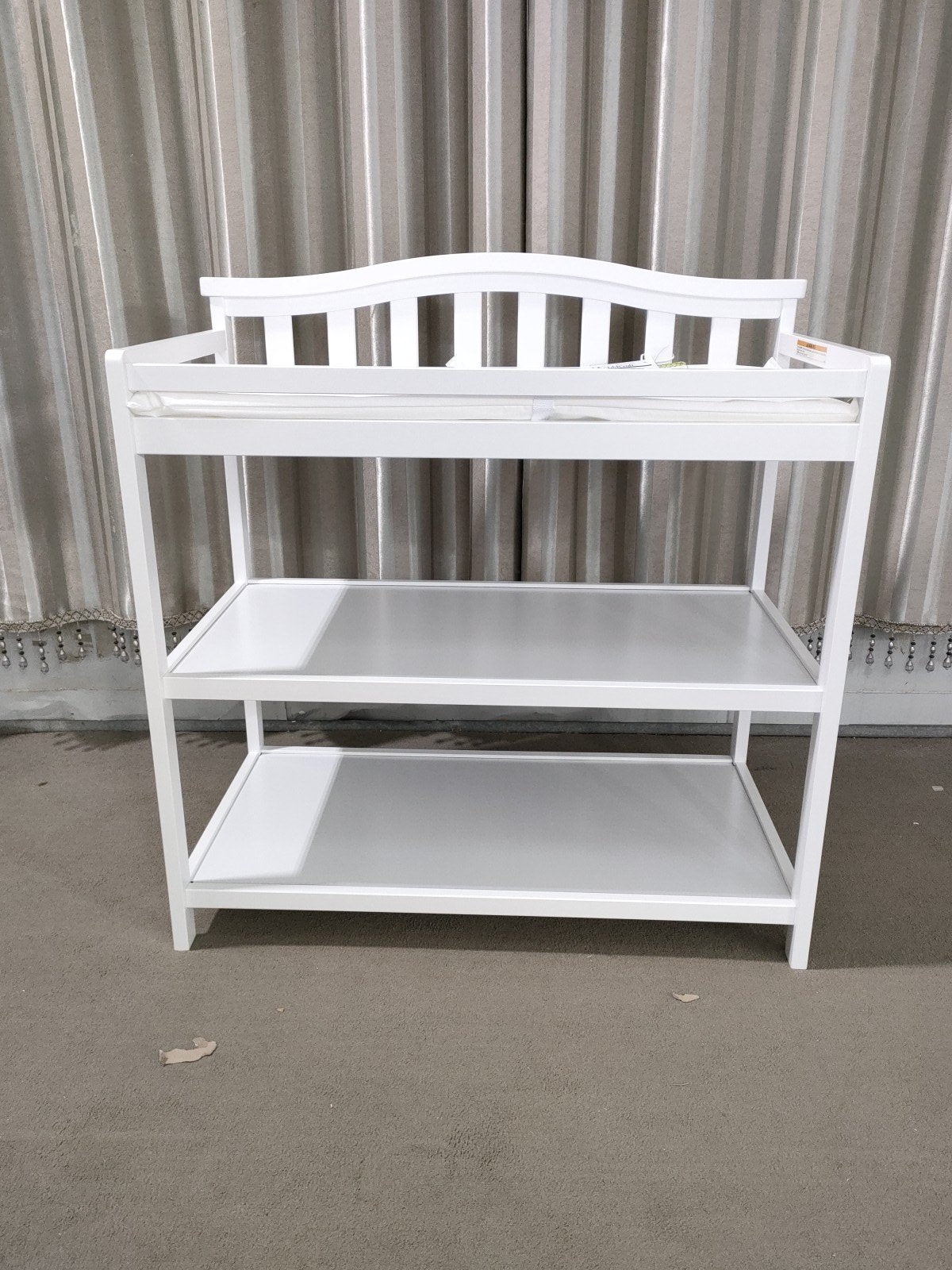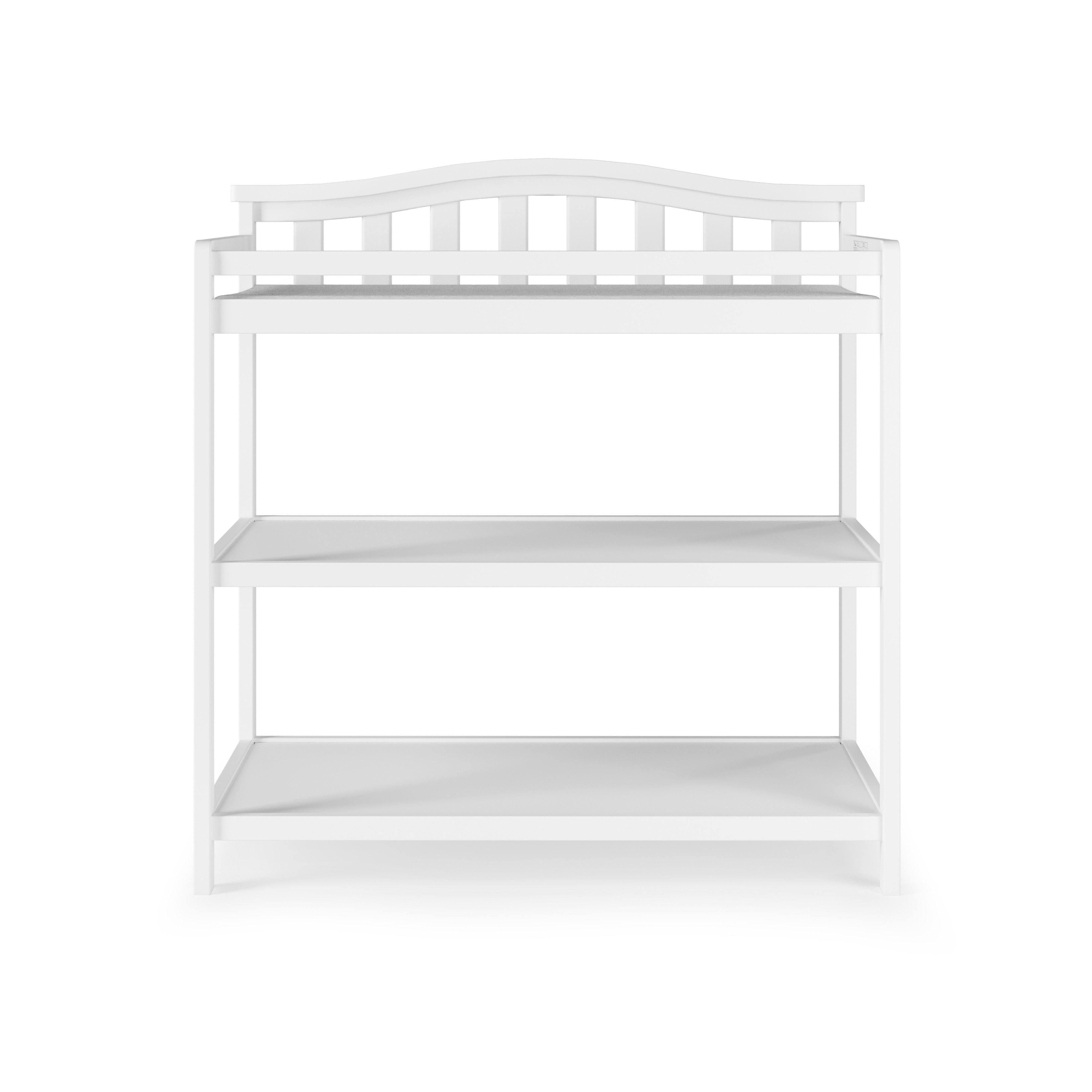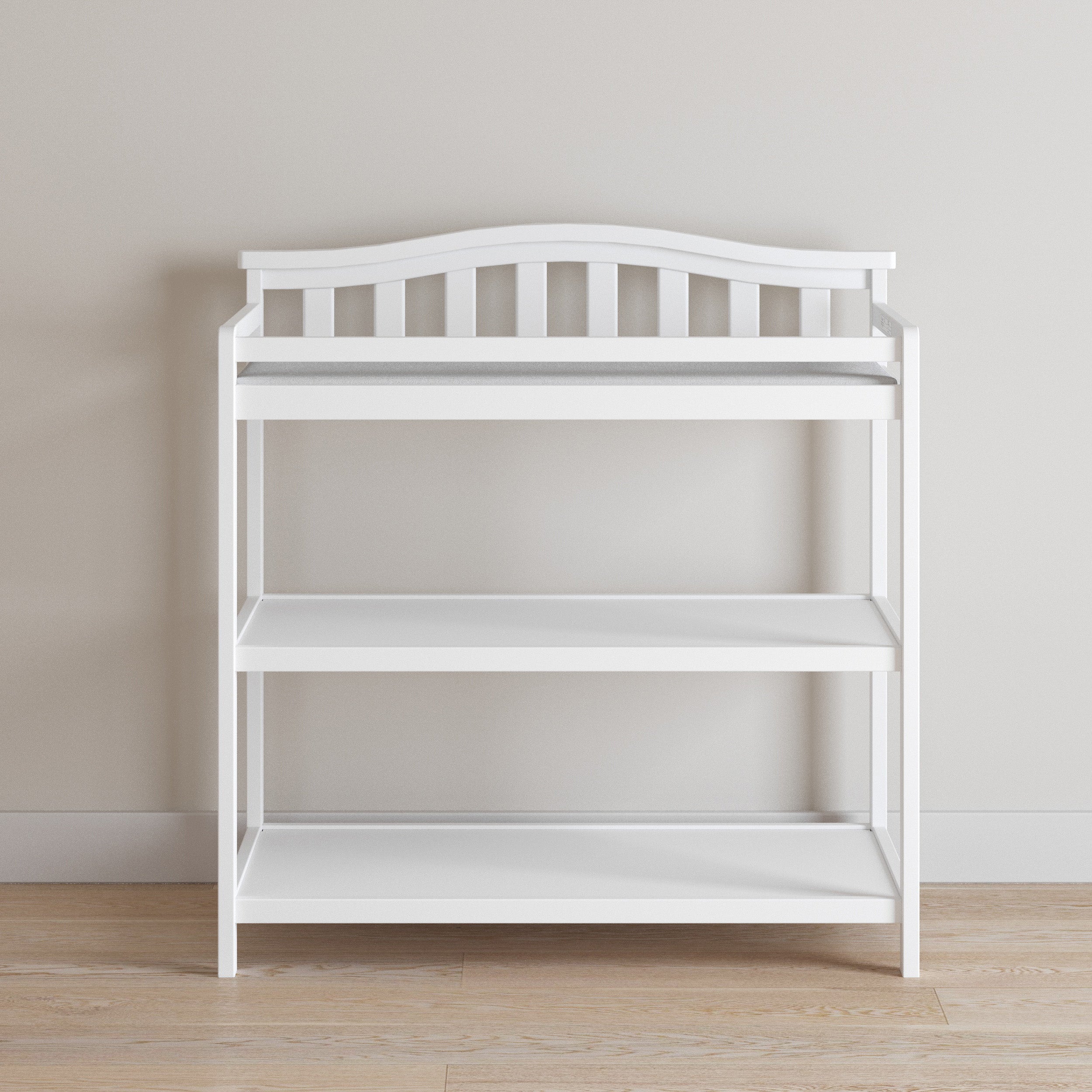 The Child Craft Arch Top Baby Changing Table in matte white, with a blue pad, wicker basket, wooden toys, books, and a stacking toy, sits against a light blue wall, paired with a striped rug, plant, and charming nursery decor.
