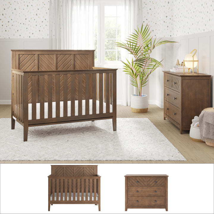 The angled geometry of chevron adorning the Atwood 2 piece nursery set will bring a fresh and modern look to your baby’s nursery. The beveled edges and rich finishes tie the unique and intricate details together to create the stunning appearance. This 2 piece collection includes the Atwood 4-in-1 Convertible Crib and 3-drawer dresser. Available in Child Craft’s Matte White, Lunar Gray, and Cocoa Bean baby safe, non-toxic finishes, the Atwood 2 piece nursery furniture set provides a striking ambiance for your precious bundle.