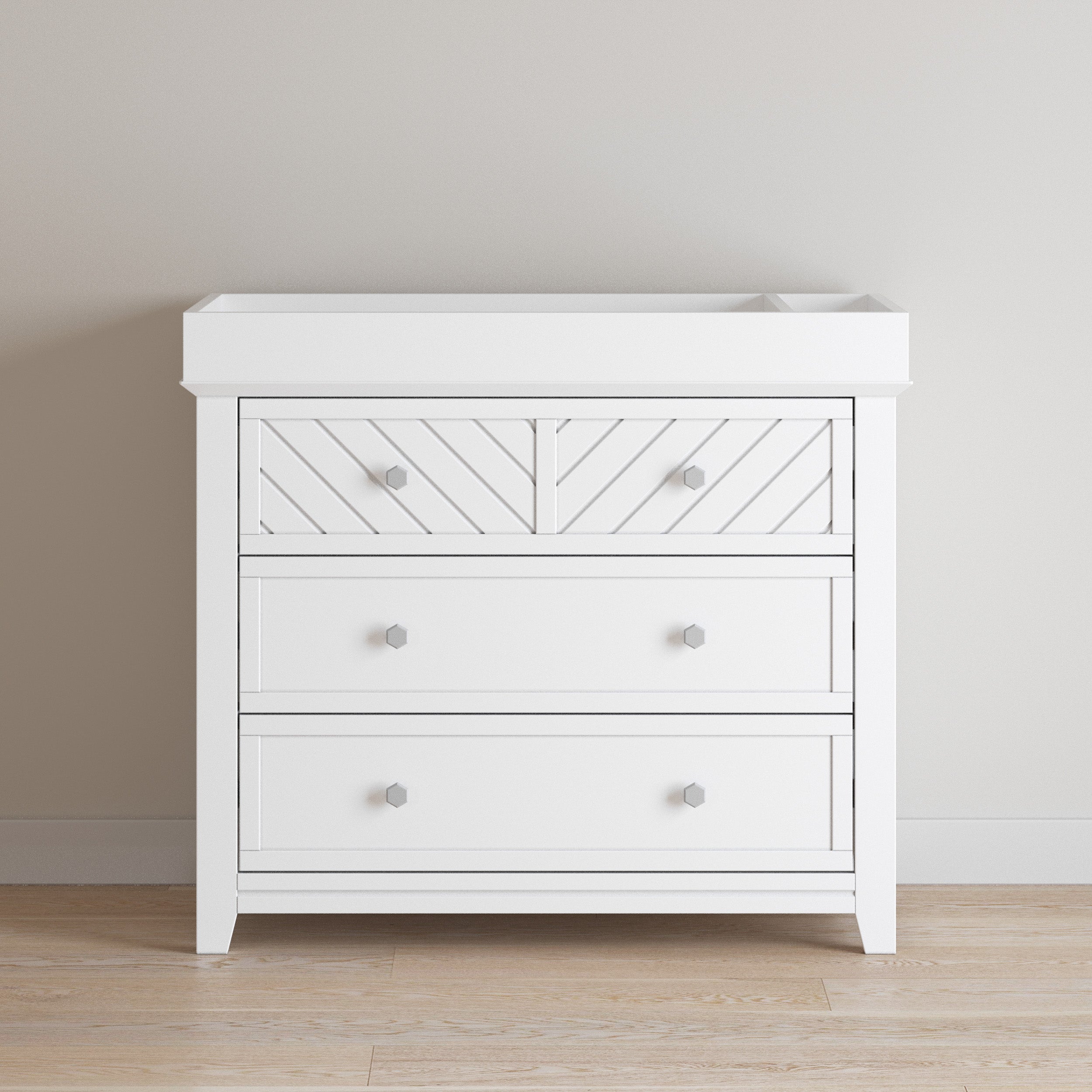 The Child Craft Atwood 4-Drawer Chest in matte white stands against a blue and white star-patterned wall, adorned with decorative items like a giraffe print, a plant, and a basket.