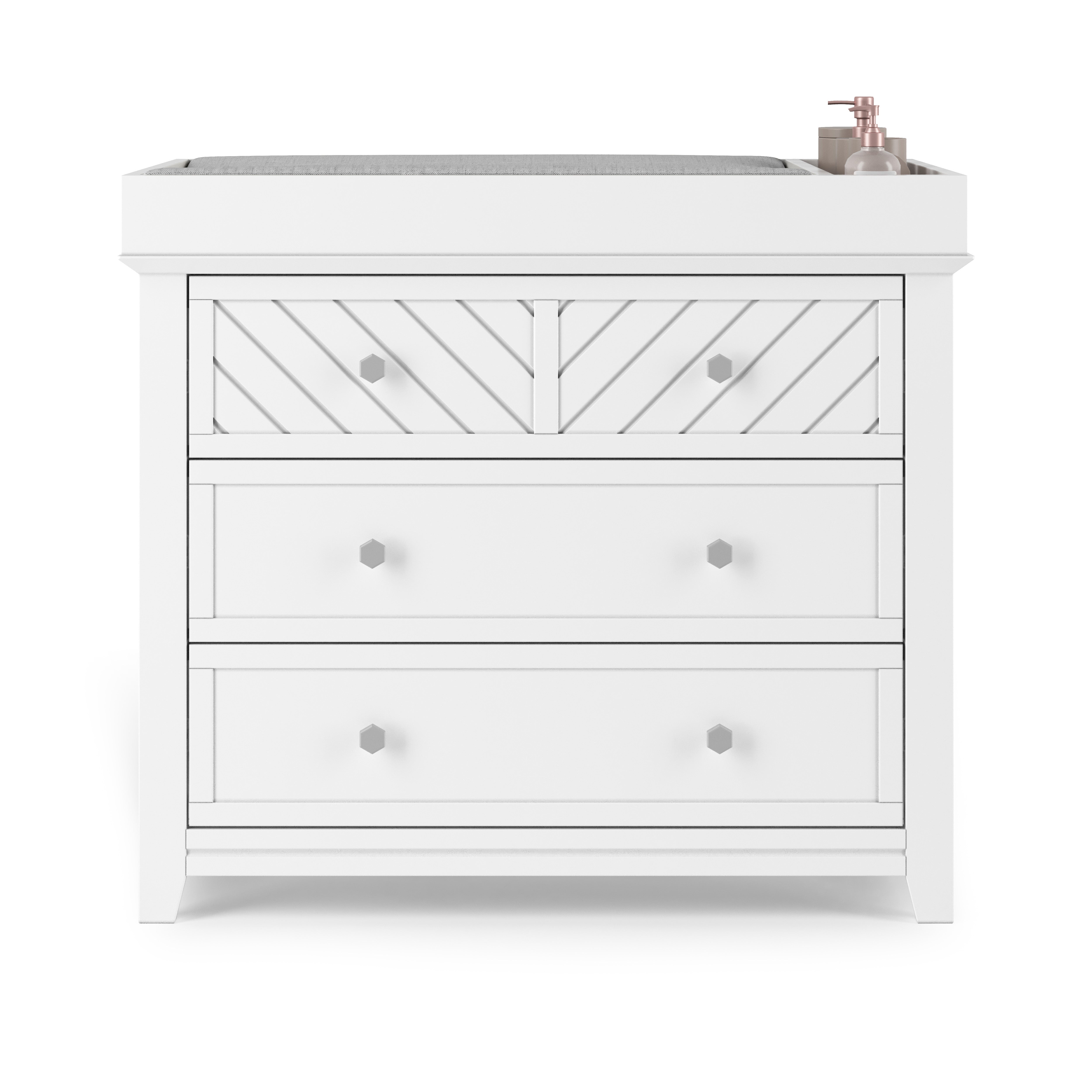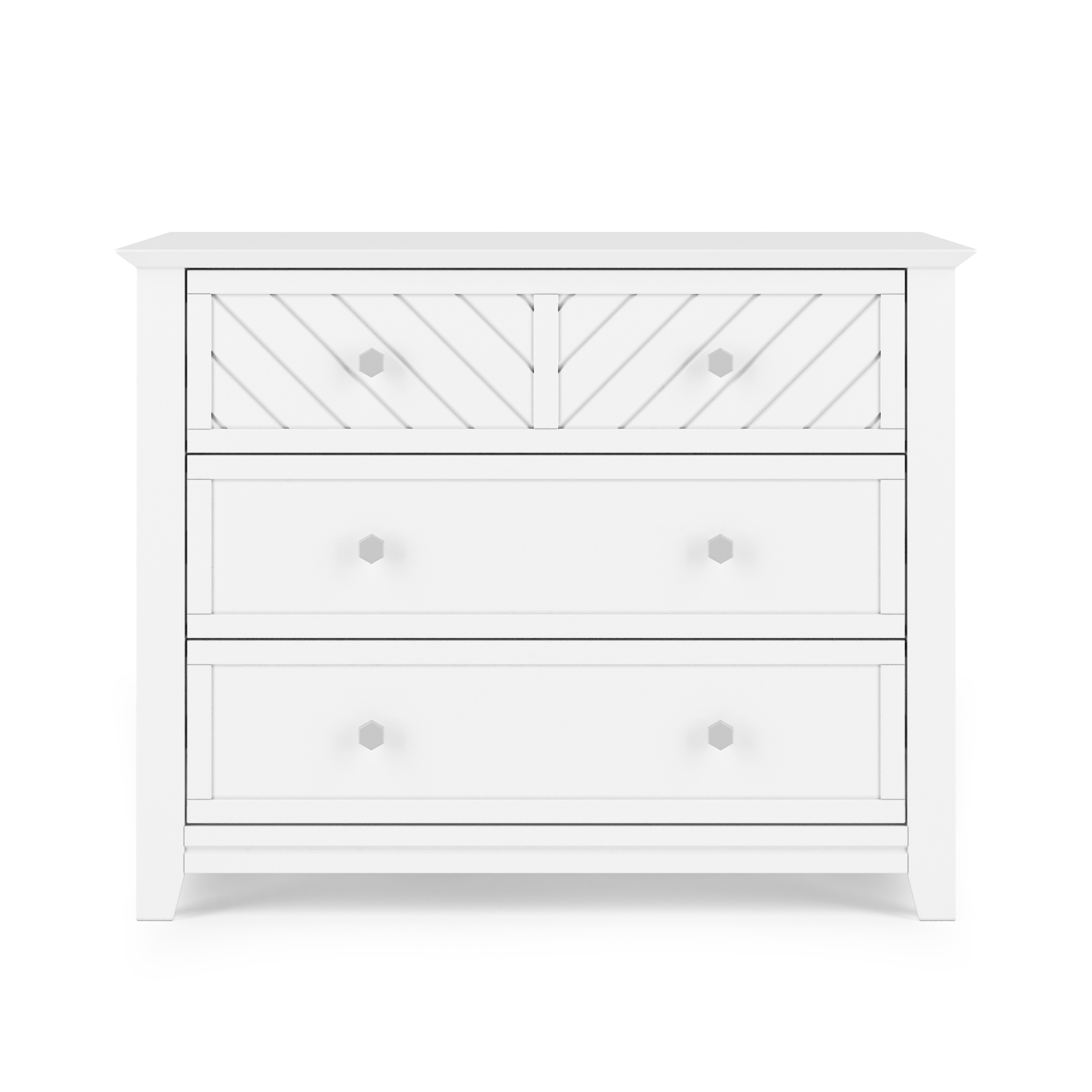 The Child Craft Atwood 3-Drawer Dresser in matte white stands against a blue paneled wall. On top are stacked books, a gold lamp, a rocket ornament, and a brown alien figurine. The room features a wooden floor.