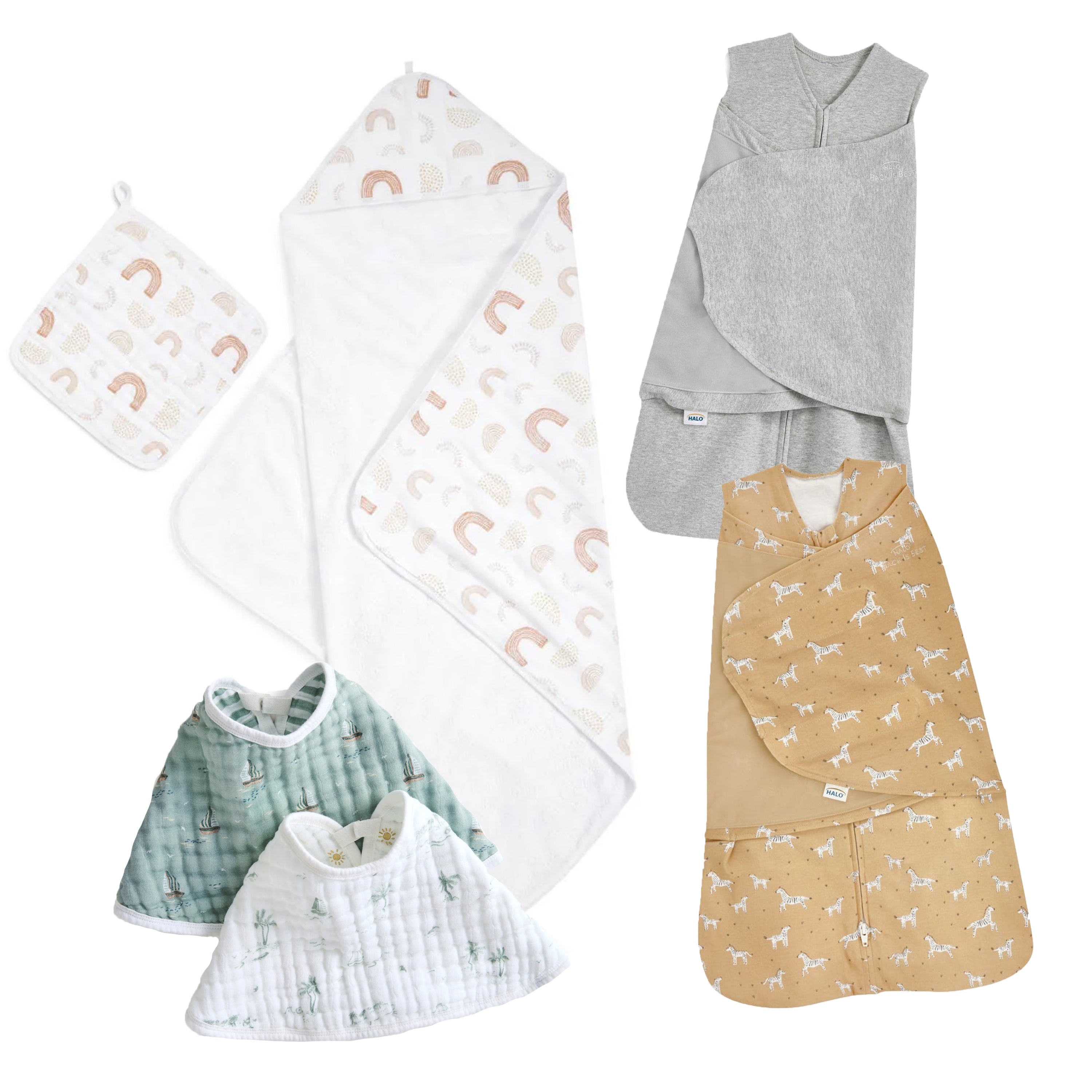The Boutique Oversized Hooded Towel & Washcloth Set is ultra-plush and generously sized, keeping little ones fully wrapped and warm—no dangling legs or chilly toes. After bath time, the aden + anais Organic Burpy Bibs catch dribbles during feedings. Finally, the HALO SleepSack Swaddle provides a cozy, secure sleep environment without loose blankets.