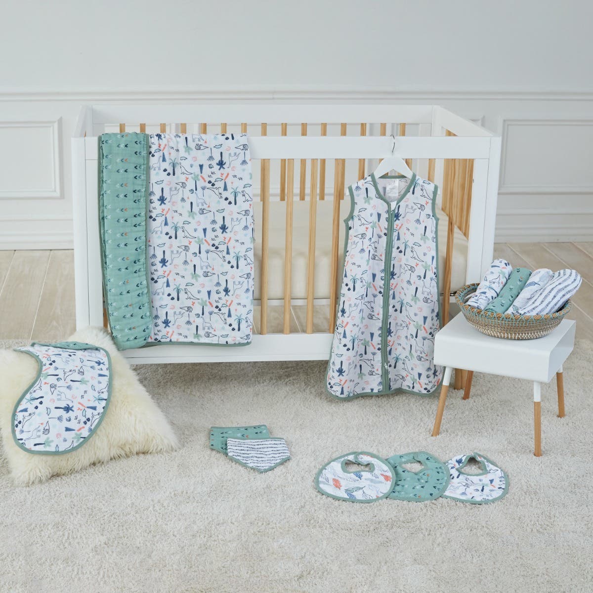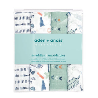 The aden + anais essentials cotton muslin swaddle blanket 4 pack features breathable, soft, lightweight designs including navy dashes, dinosaurs with foliage, teal arrows, and gray leaves on green.