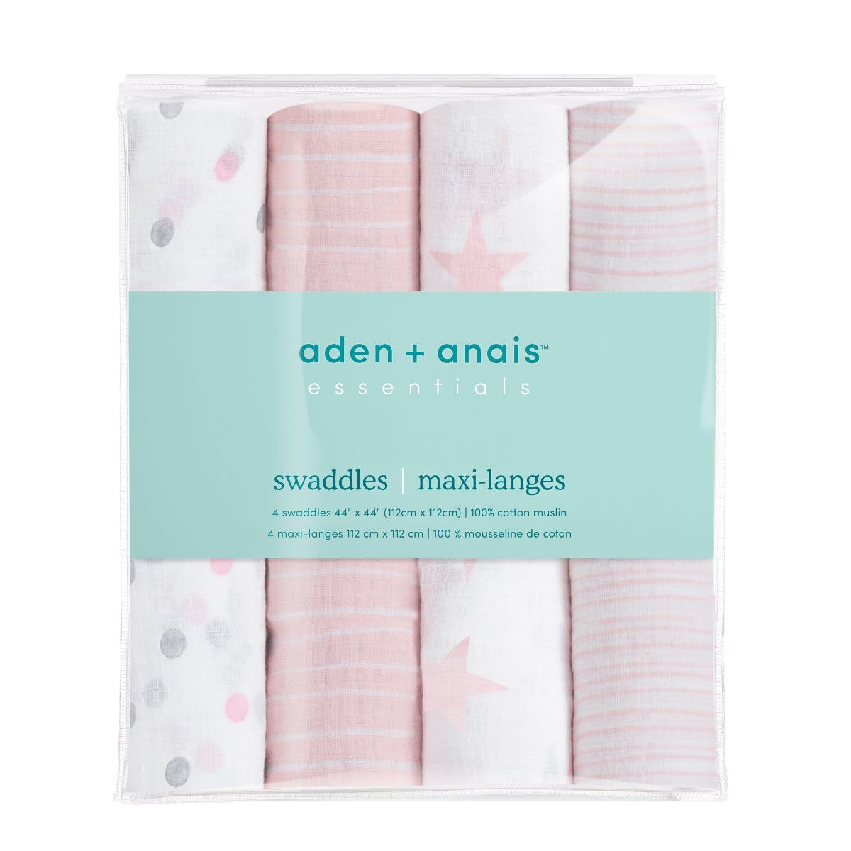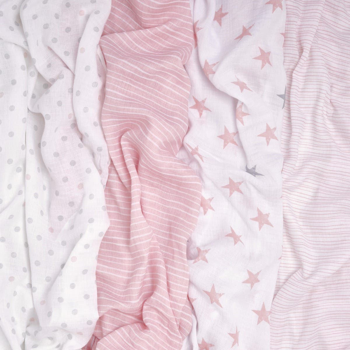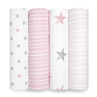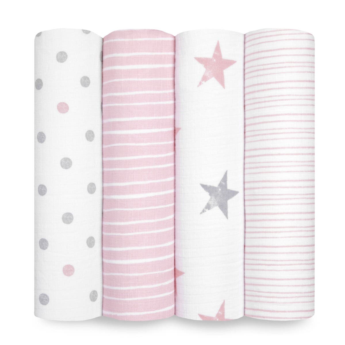 Displayed are four aden + anais Essentials Cotton Muslin Swaddles, made from breathable cotton muslin. Patterns, left to right: gray dots on white, pink/white stripes, gray/pink stars on white, and thin pink/white stripes—ideal as a versatile baby blanket for your little one.