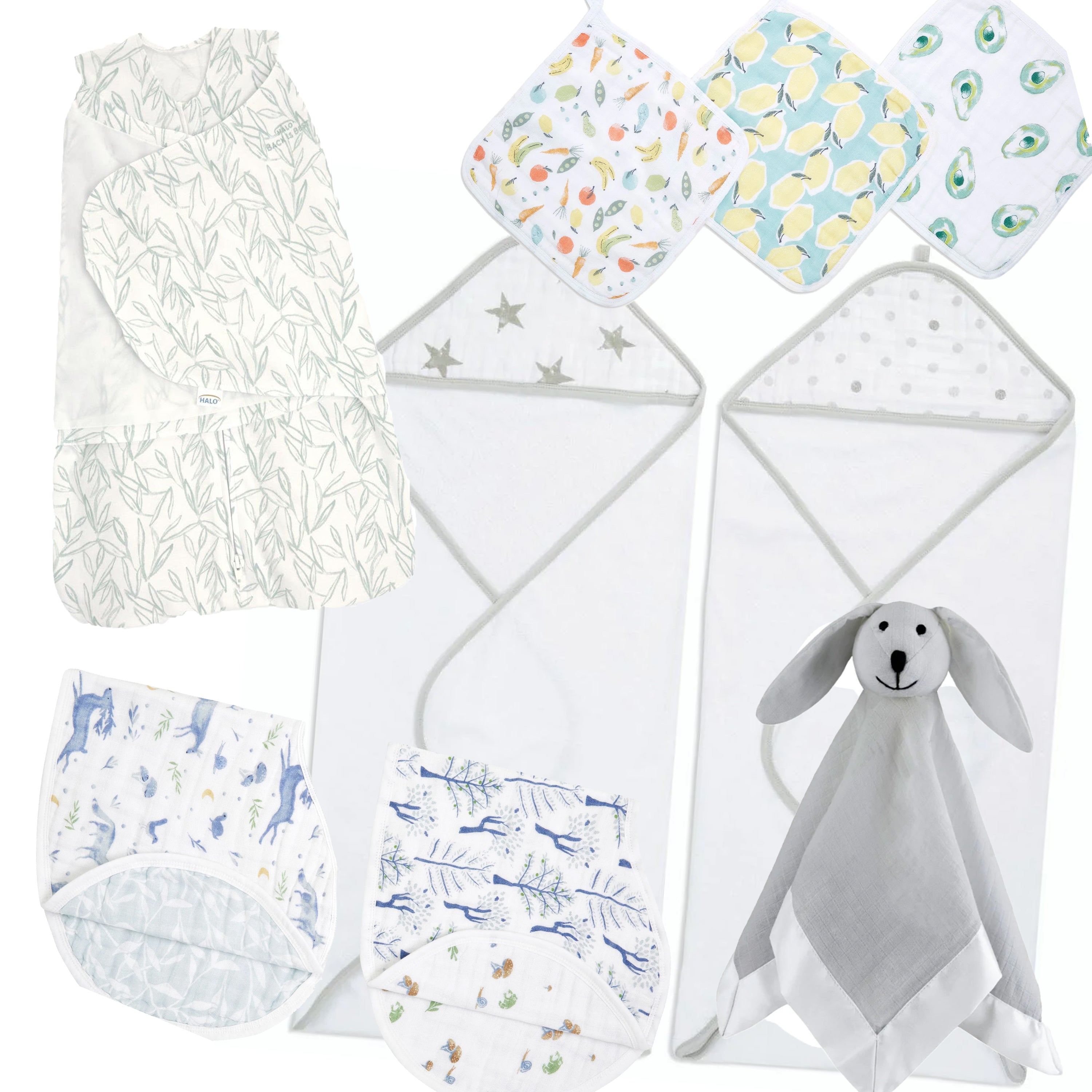 Soft, practical essentials to make the transition from tub to swaddle seamless and soothing.
