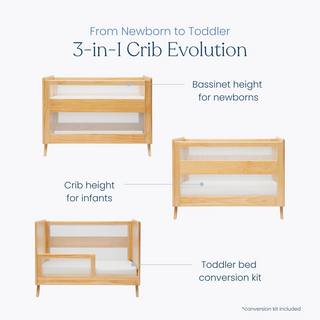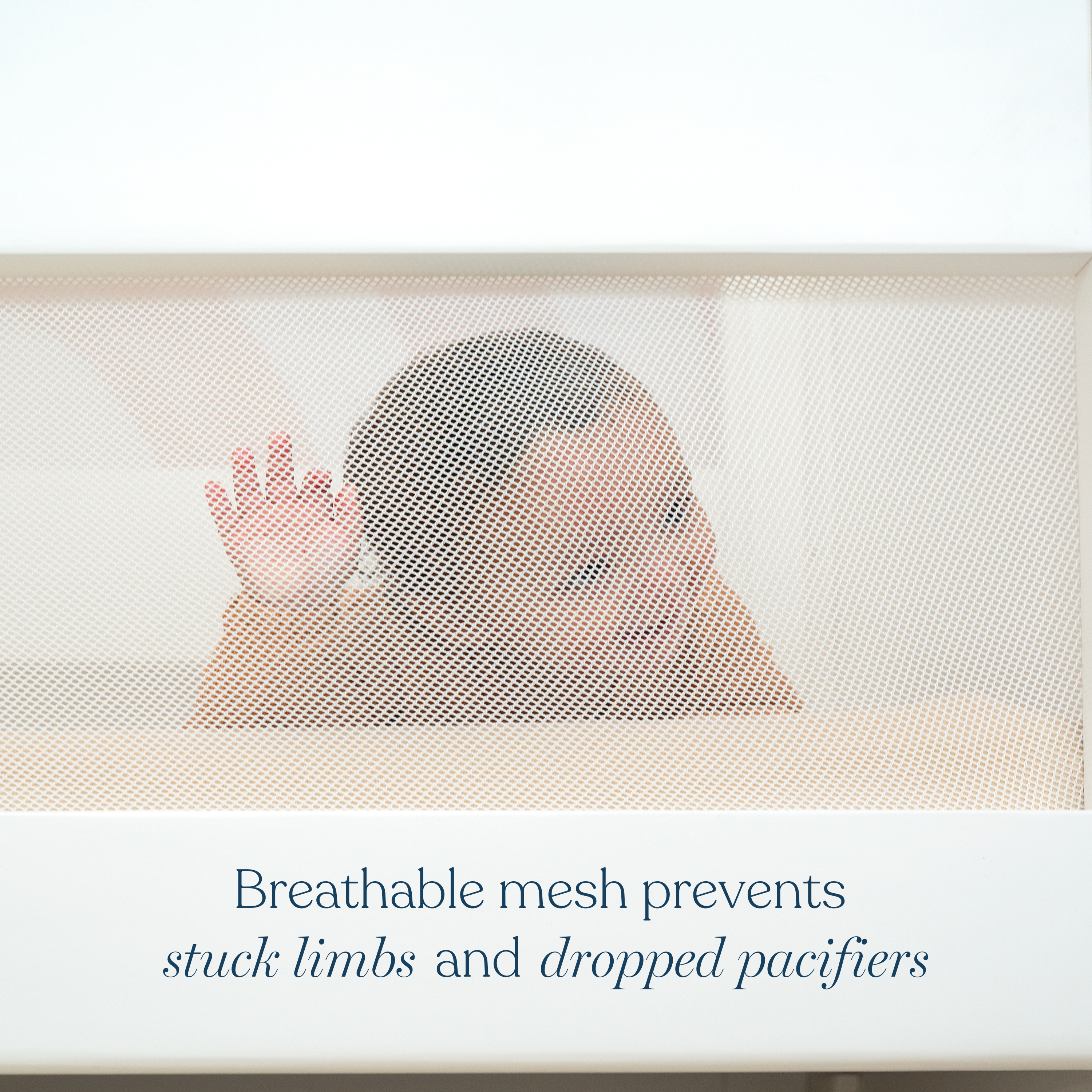 The 3-in-1 Breathable Mesh Convertible Wood Crib combines thoughtful, smart design with everyday practicality, offering peace of mind and bringing a touch of elegance to your nursery. Patented, breathable mesh walls prevent stuck limbs and keep pacifiers within reach, for fewer wakeups and better sleep for the whole family. They also offer uninterrupted visibility to keep a better eye on your baby. The versatile design grows with them, converting from newborn height to baby crib height to toddler bed with included conversion kit. The crib legs are removable to offer two different height options to best suit your height. Crafted from New Zealand pinewood with a finish that does not include lead, phthalate or formaldehyde. This GREENGUARD GOLD certified crib is built to be just as safe as it is timeless.