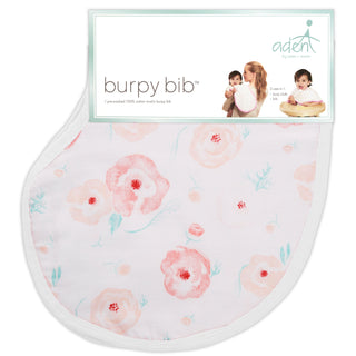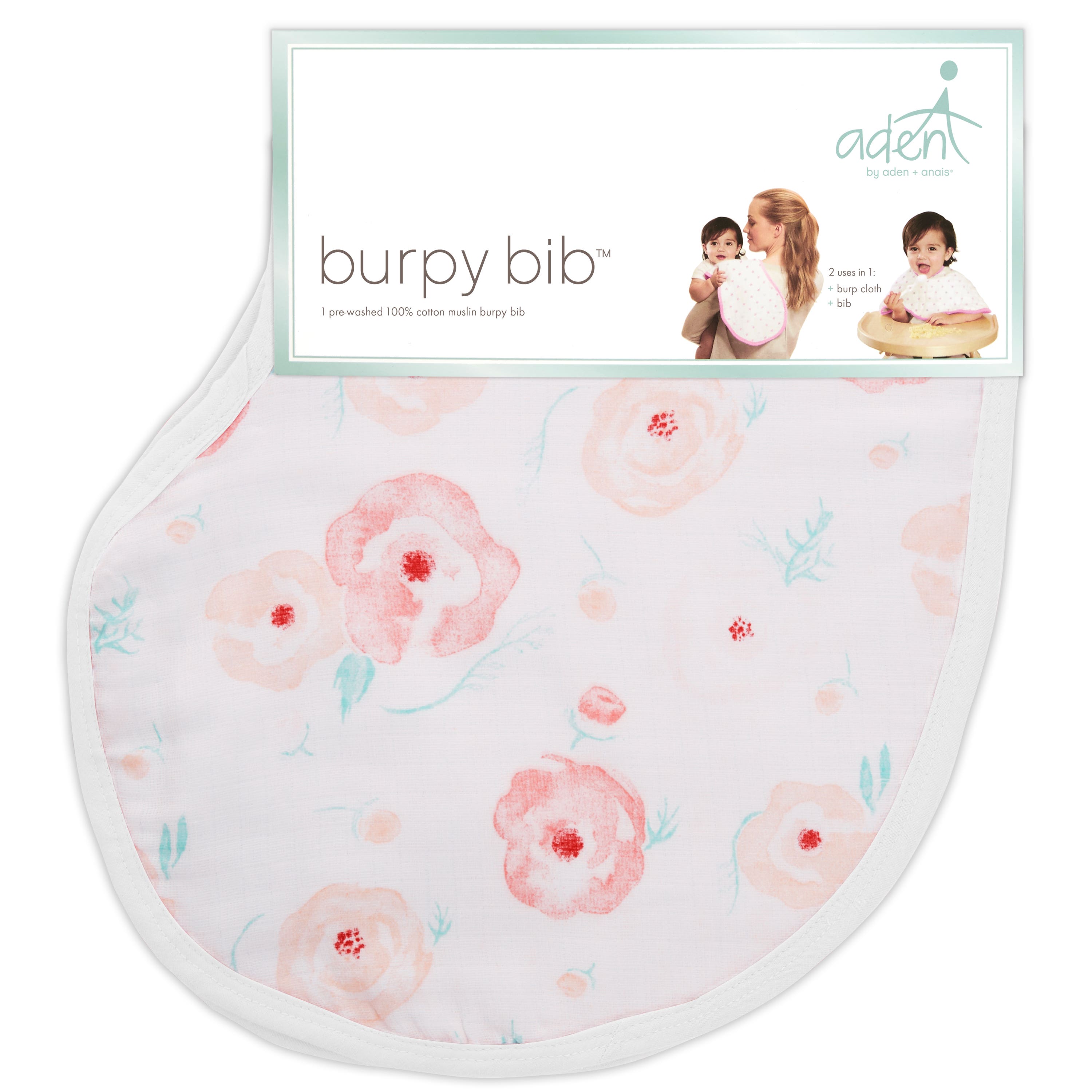 The aden + anais essentials cotton muslin burpy bib is semi-circular and absorbent, featuring a floral design with pink flowers on one side and a polka dot pattern on the other. It includes a white trim and snap button closure for convenience.