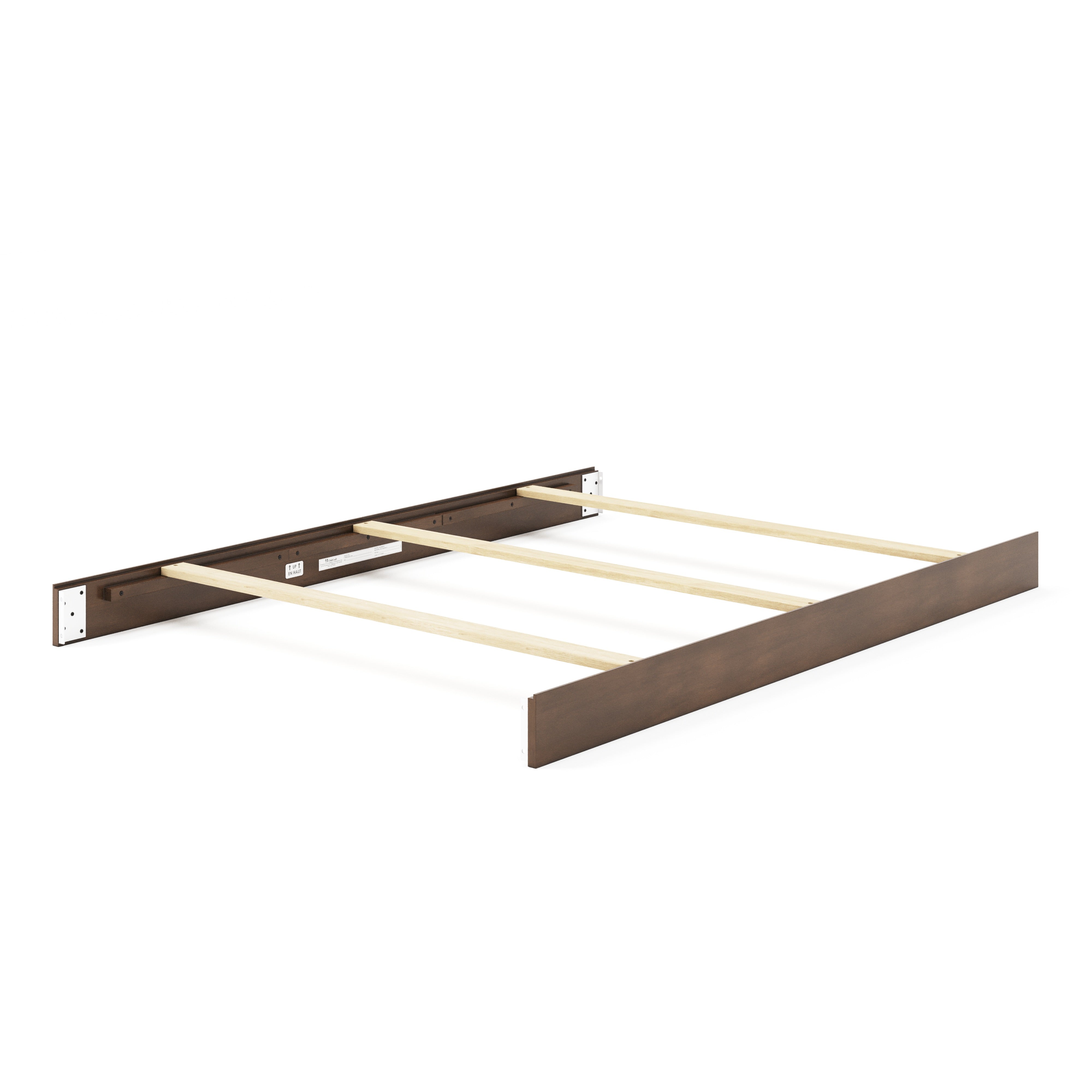 A partially assembled Child Craft F06401 full-size bed shows a dark brown headboard and footboard, with cocoa bean-finished bed rails and light pine support slats running across the width.