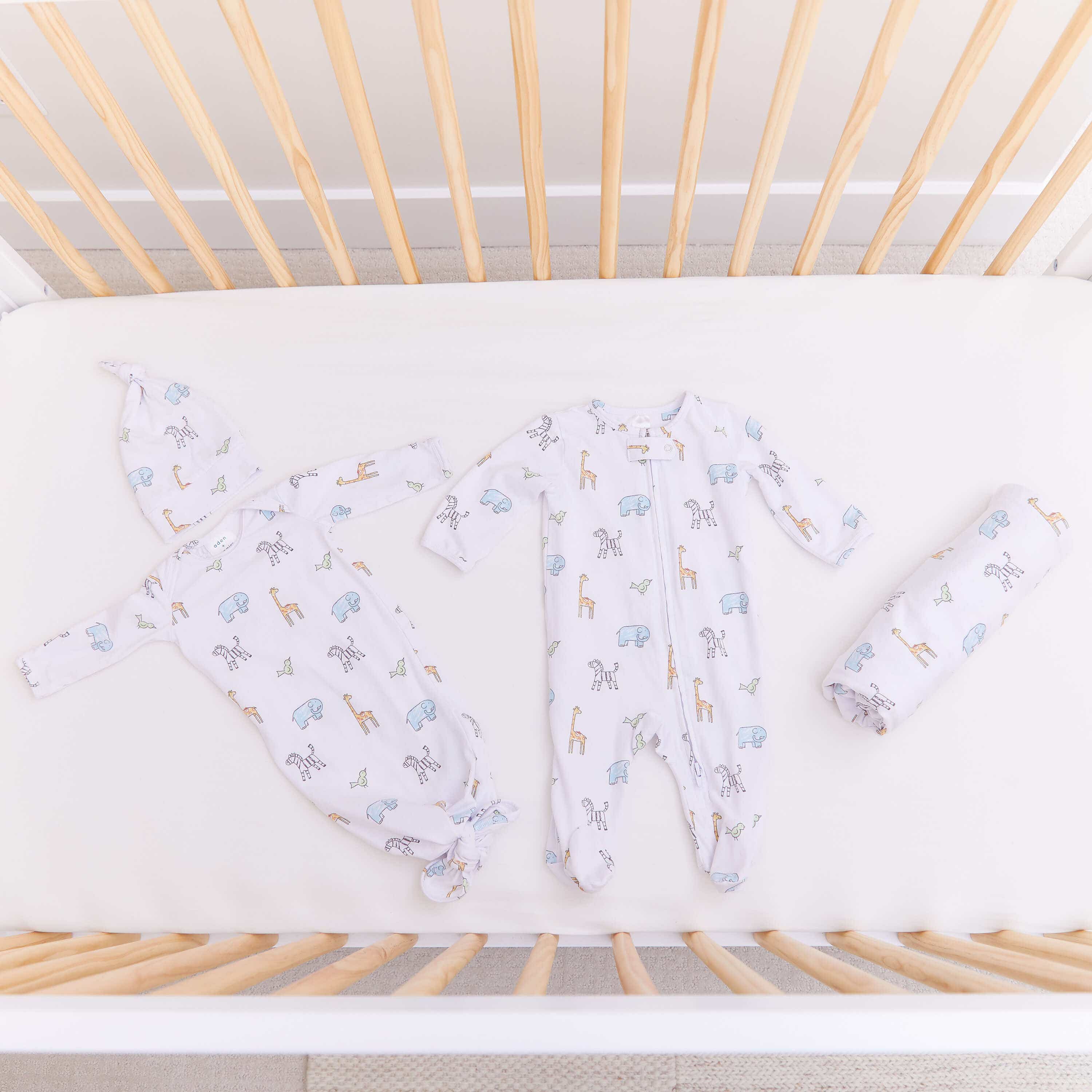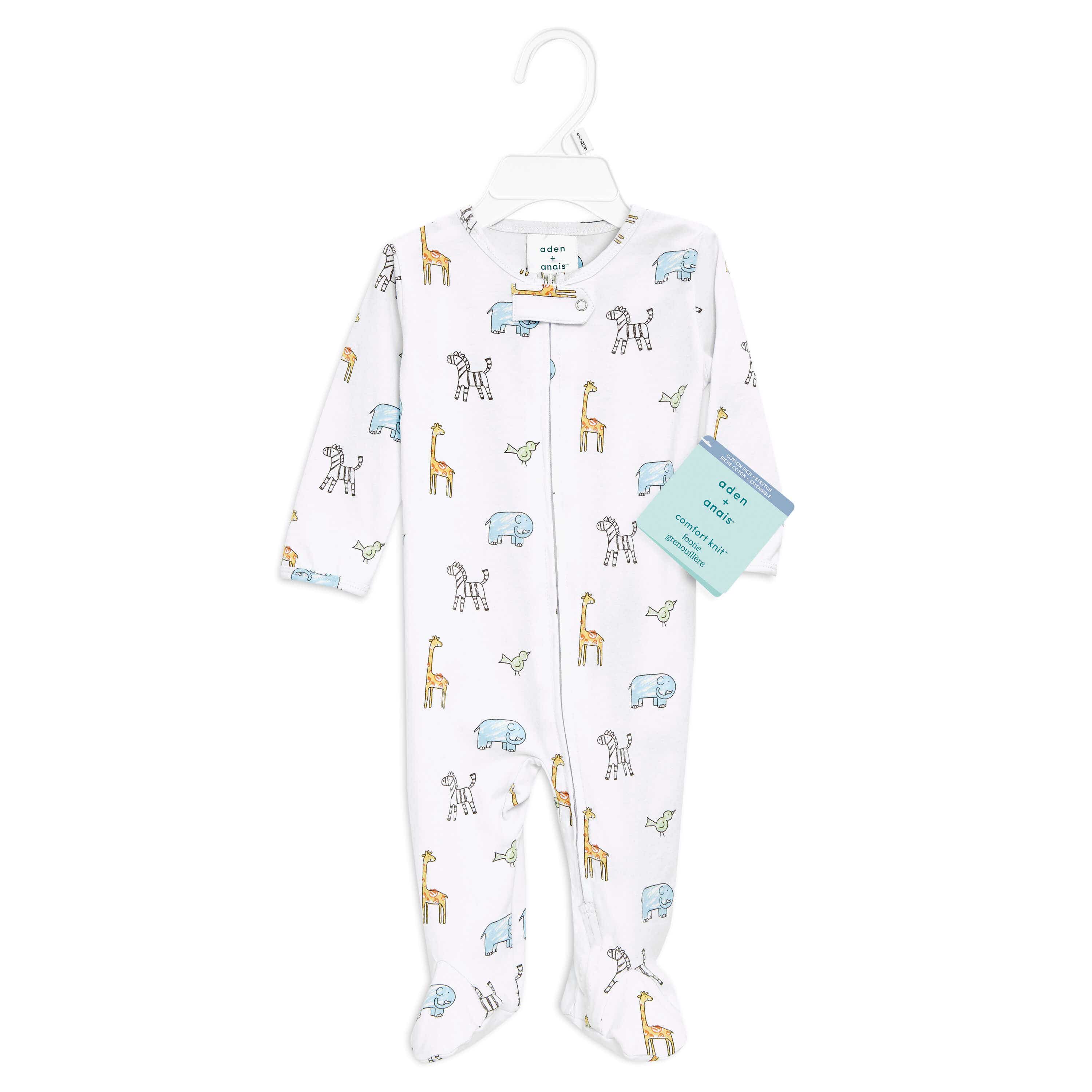 The aden + anais comfort knit™ footie is a white baby onesie with colorful animal prints, featuring blue elephants, yellow giraffes, and green birds. Made from cotton-rich fabric for softness, it includes long sleeves and a front zipper with a safety cover for peace of mind.