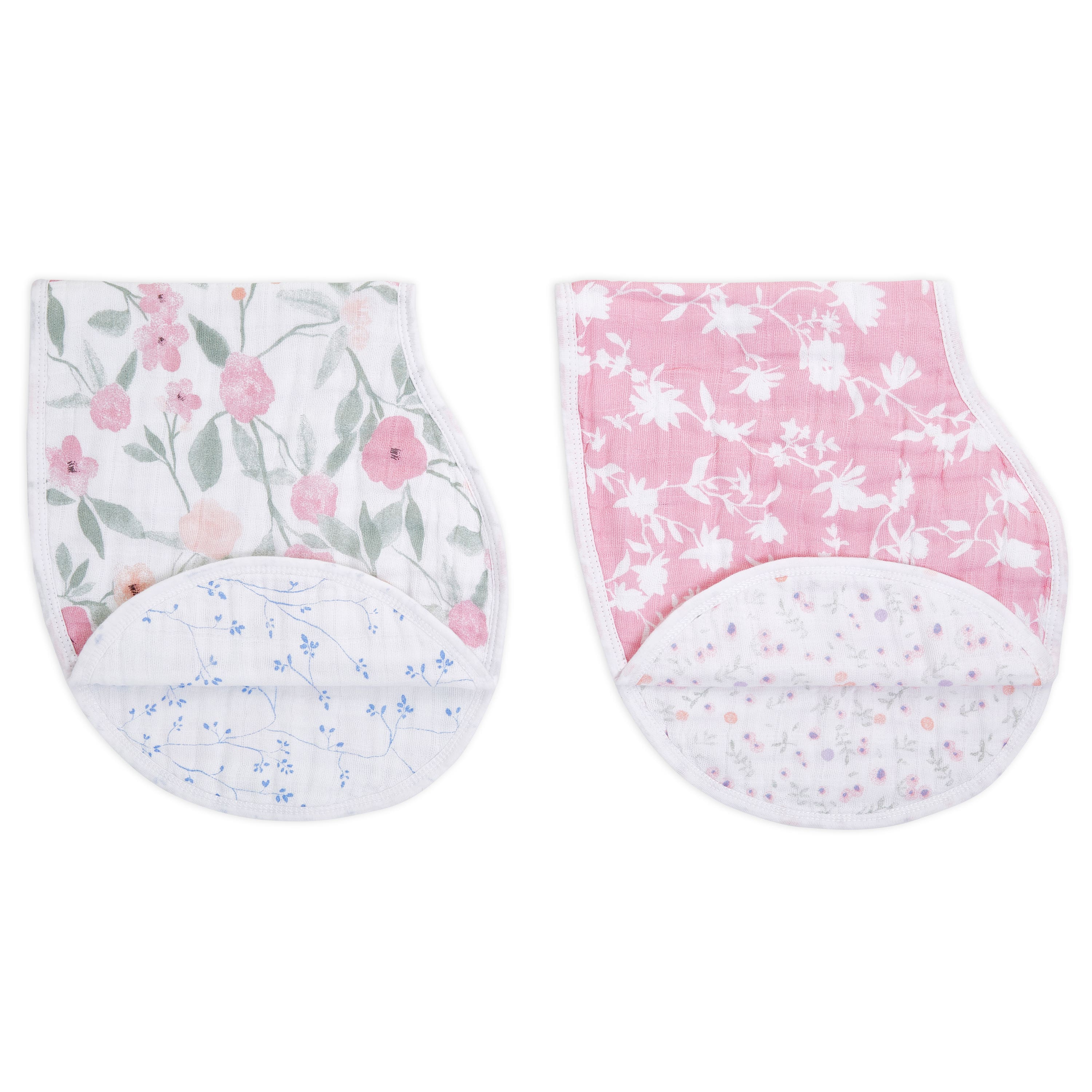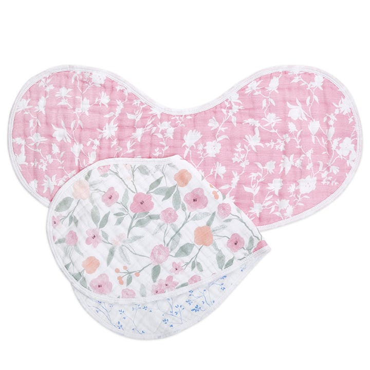 The aden + anais boutique 100% cotton muslin burpy bibs 2 pack showcases two floral-patterned cloths: an absorbent muslin one with pink and green flowers, and a no-slip bib featuring pink and white blooms. Both have rounded corners with extra fabric layers adorned with smaller floral designs.