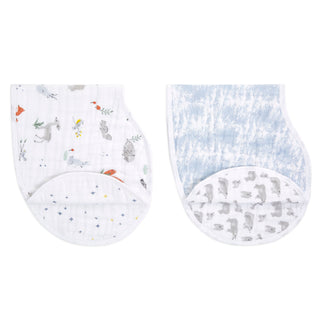 Two aden + anais boutique 100% cotton muslin burpy bibs are illustrated: the left features animal prints with colorful accents on absorbent muslin, while the right showcases a blue tie-dye pattern with gray bear silhouettes beneath. Both have curved edges and a luxurious finish.